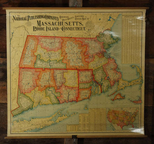 Antique National Publishing Company's Railroad, Post Office, Township And County Map Of Massachusetts, Rhode Island, And Connecticut For 1901, Roll Up Map, Copyright 1900 By The National Publishing Co., Boston, Massachusetts, 38-3/4" x 36"