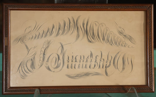Antique Hand Drawn Calligraphy Art, "Friendship," With Birds Motif, 19-1/4" x 11-1/2"