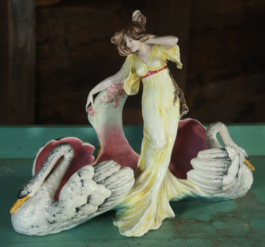 Antique Art Nouveau Majolica Porcelain Planter With Beautiful Woman In Yellow Dress Flanked By Swans, Marked Eichwald Porcelain Factory, Note Damaged Finger