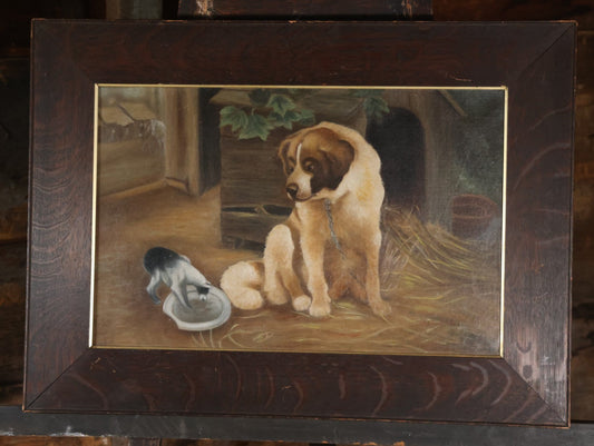 Antique Three Section Room Divider Screen With Hand Painted Scenes Of Dogs, Including Pitbull Dog And Her Pups, Two Dogs Looking At Moon, Three Dogs Chasing Cat Up Tree, Artist Signed E. Underwood, 1908, Landscape, Waterfall Scenes On Verso