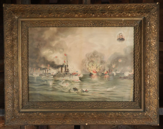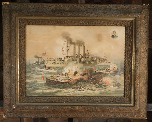 Antique Spanish American War Chromolithograph Print Depicting The Battle Of Manila, May 1st, 1898, In Large Ornate Frame, After Xanthus Russell Smith, Copyright 1898 By J. Hoover & Son, Philadelphia, 39" x 31"