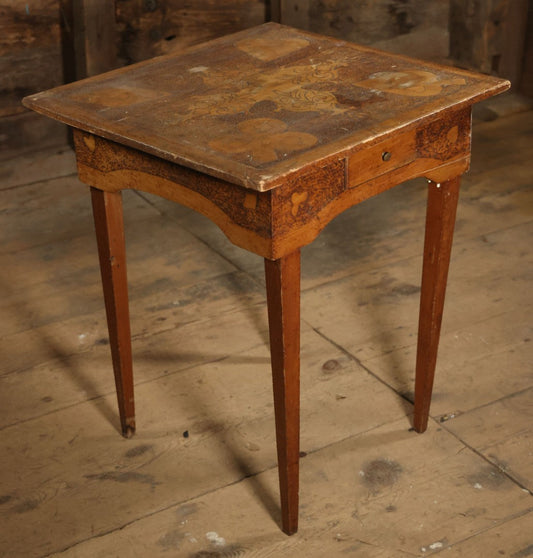 Antique Pyrography Wood Burned Flemish Art Card Table, Gambling Table, With Playing Card Suits Motif, One Drawer, Tapered Legs
