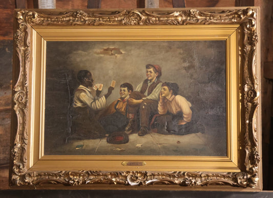 Antique Oil On Canvas Painting Titled "The Card Trick" After John George Brown, Little Boy Showing Off Card Trick To Young Friends, Artist Signed Lower Right, Illegible, In Ornate Frame With Title Plaque, Note Holes, Damage, 37-1/2" x 27-1/2"