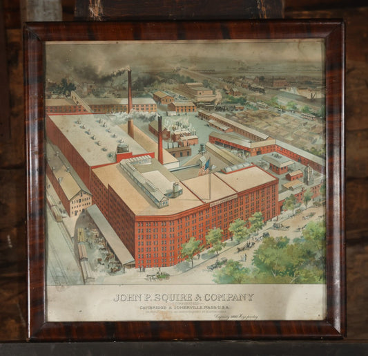 Antique Colored Lithograph Advertising Print Showing John P. Squire & Company Incorporated Hog Slaughterhouse, Cambridge & Somerville, Massachusetts, Capacity 6000 Hogs Per Day, In Frame, 24-1/2" x 24-1/2"