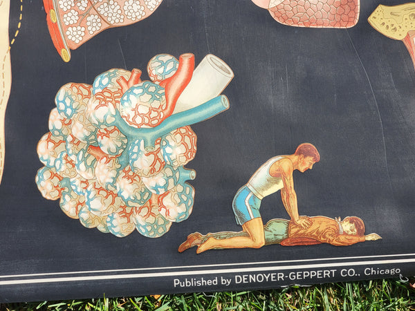 This antique 1930s fabric poster was published by Denoyer-Geppert Company out of Chicago as part of the Winslow Health and Hygiene Series of classroom posters. It Measures approximately 44" x 30".