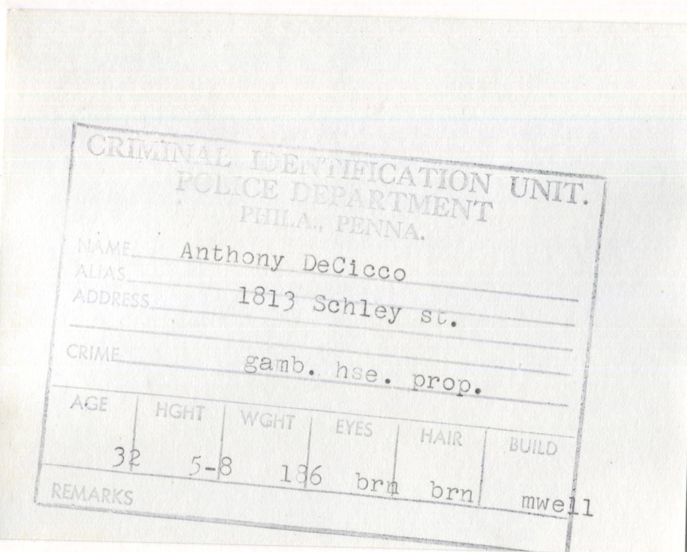 Anthony DeCicco Mugshot - Arrested on 1/21/1963 for Being a Gambling House Proprietor