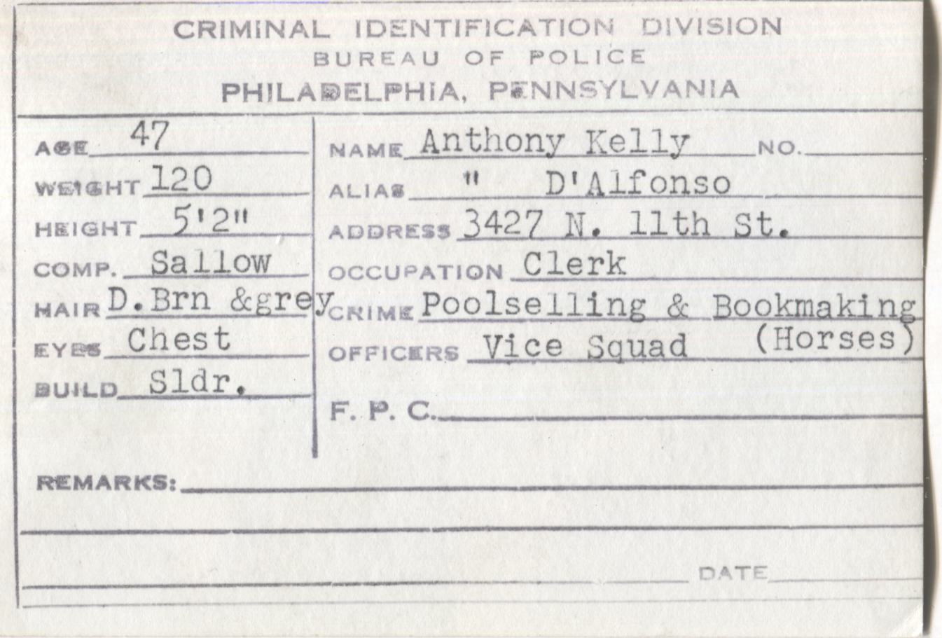 Anthony Kelly Mugshot - Arrested on 3/25/1945 for Bookmaking on Horses