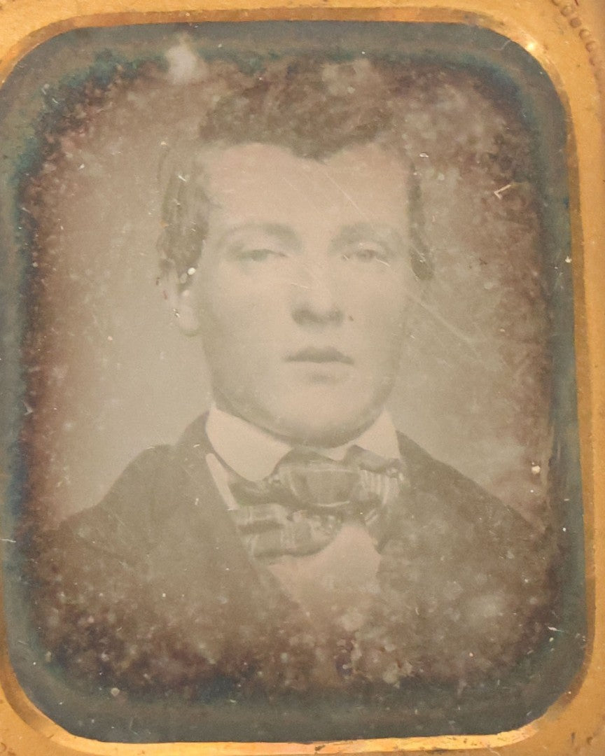 Lot 087 - Antique 1/16th Plate Daguerreotype Of A Young Man In A Bowtie In A Half Leatherette Case