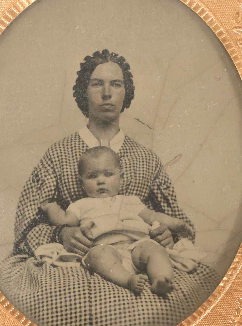 Lot 088 - Antique 1/6th Plate Tintype Photograph Of A Mother In A Checkered Dress Holding Her Baby