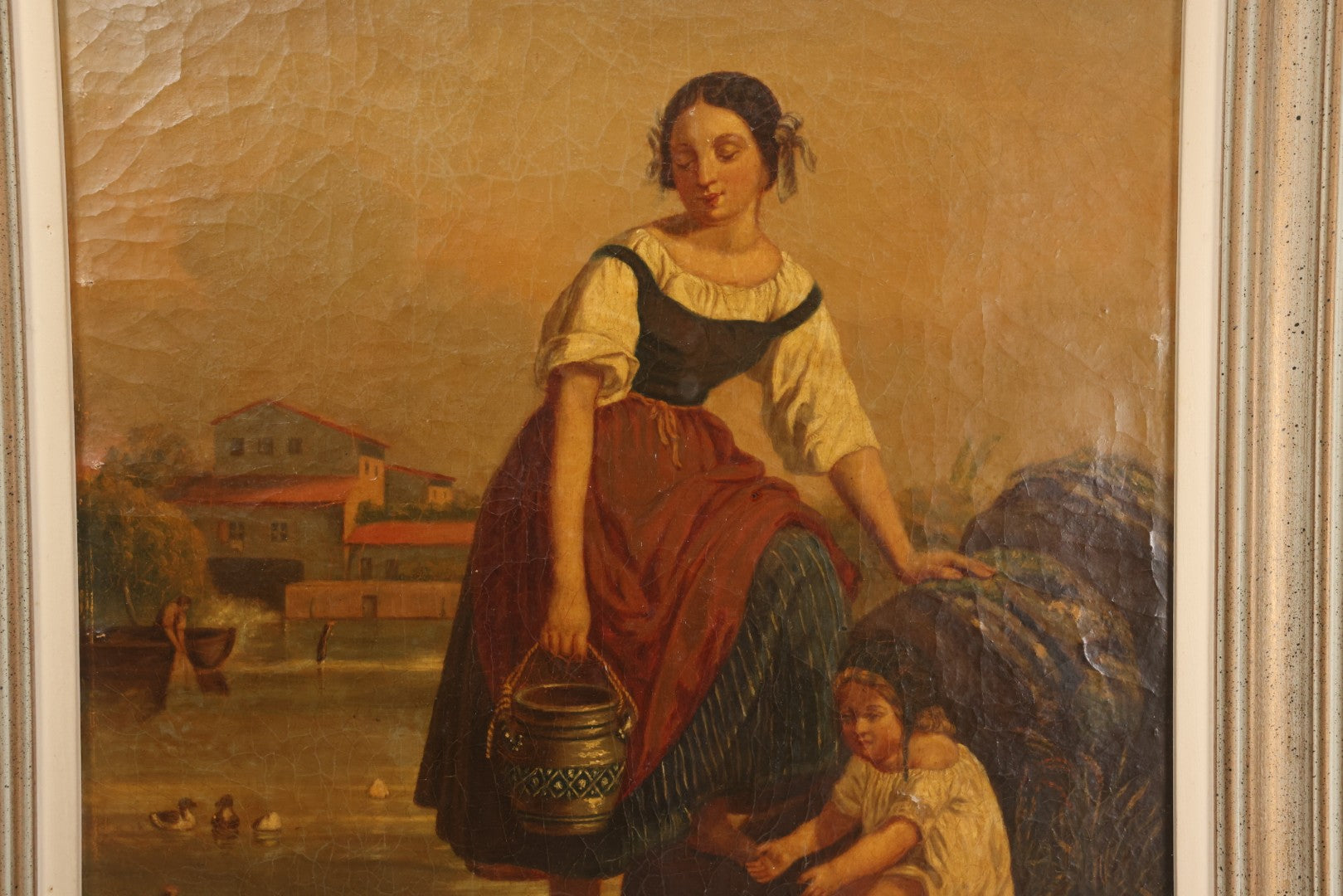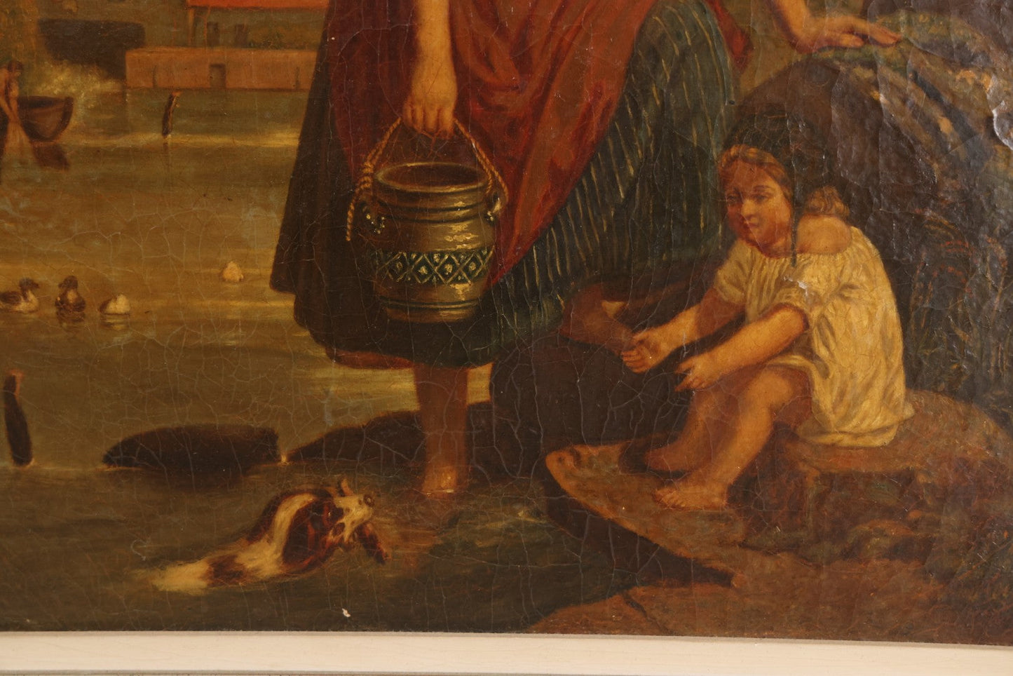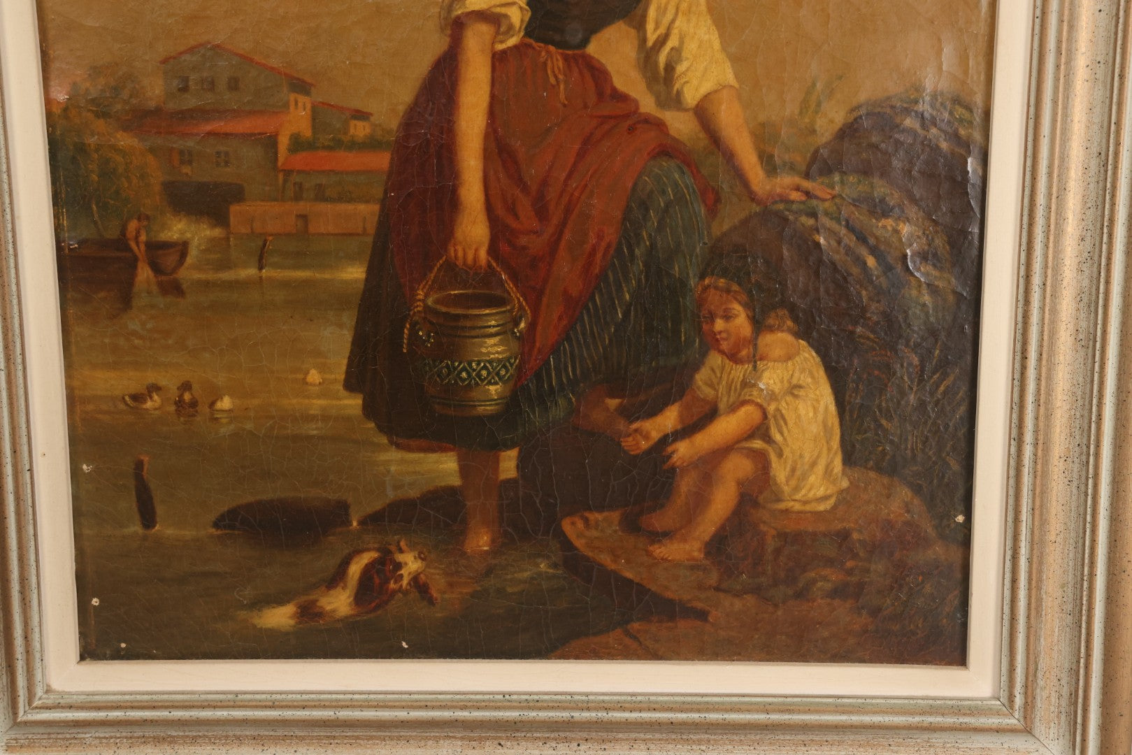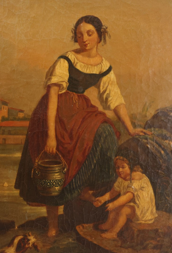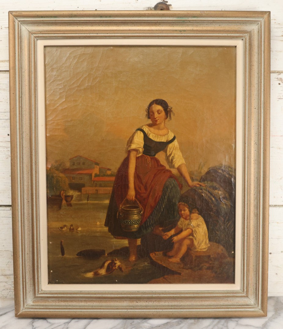Lot 001 - Antique 19th Century Genre Painting Depicting Idyllic Peasant Life, Woman Gathering Water, Child Playing Fetch With Dog, In 20th Century Frame, As Found, 21" x 25"