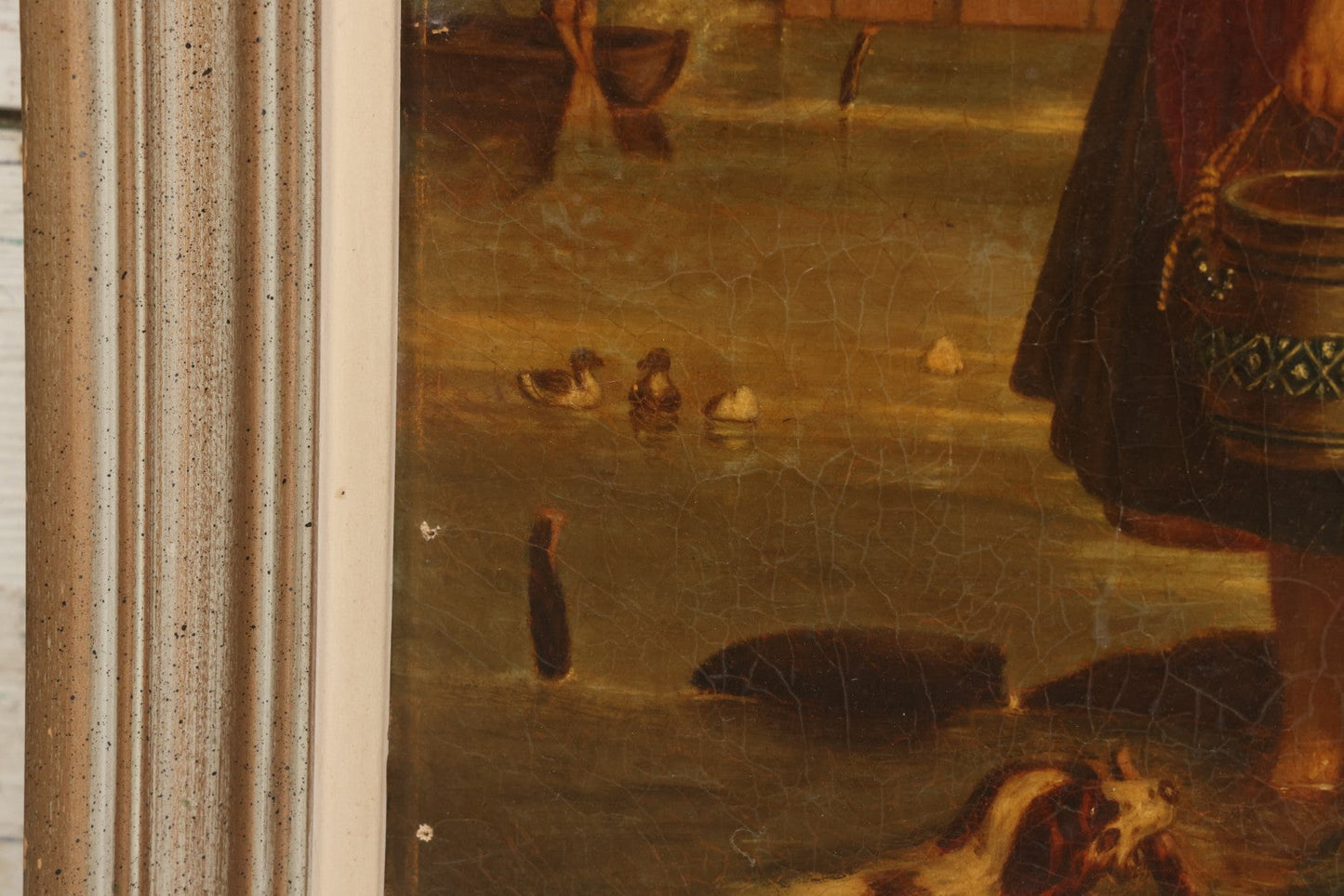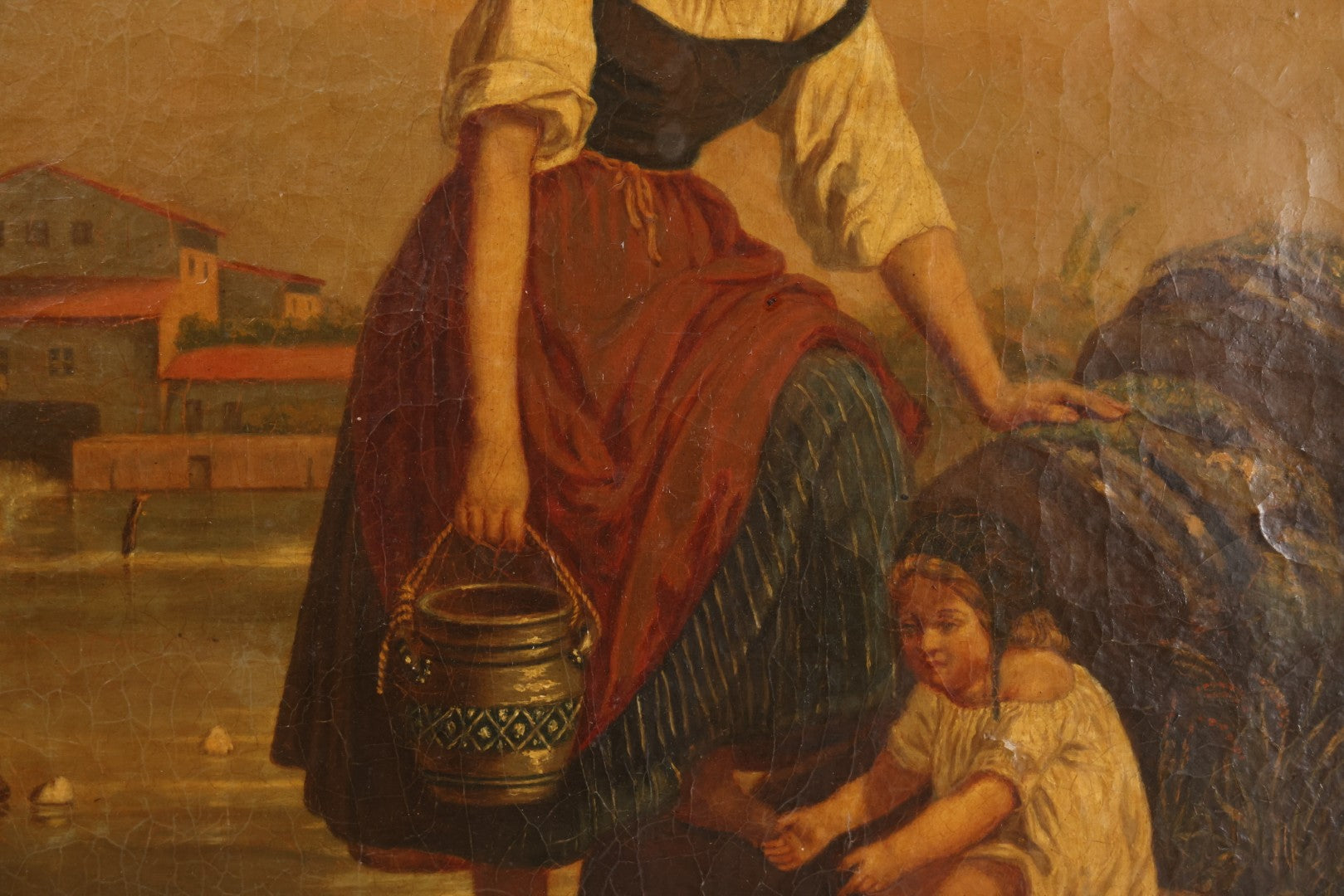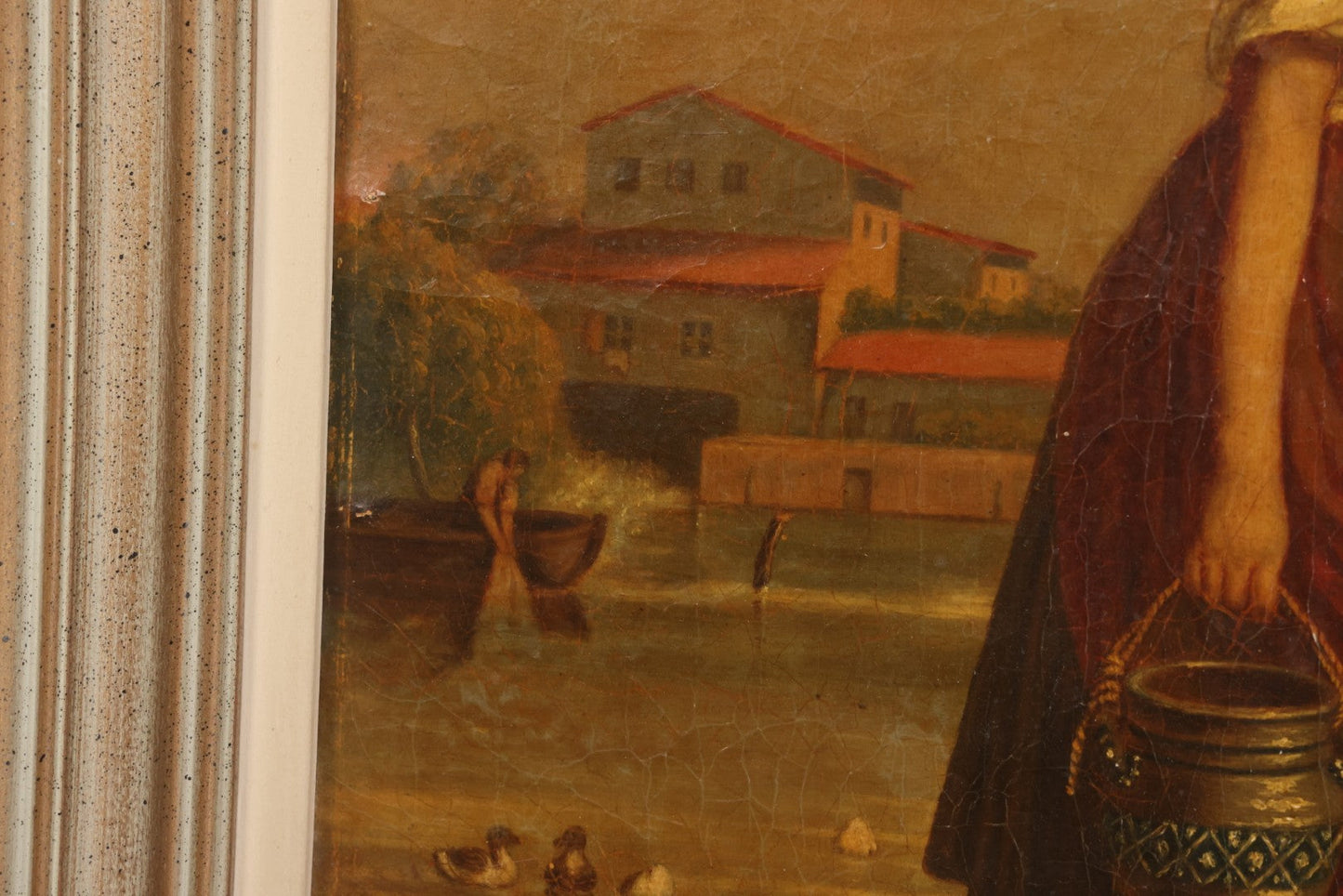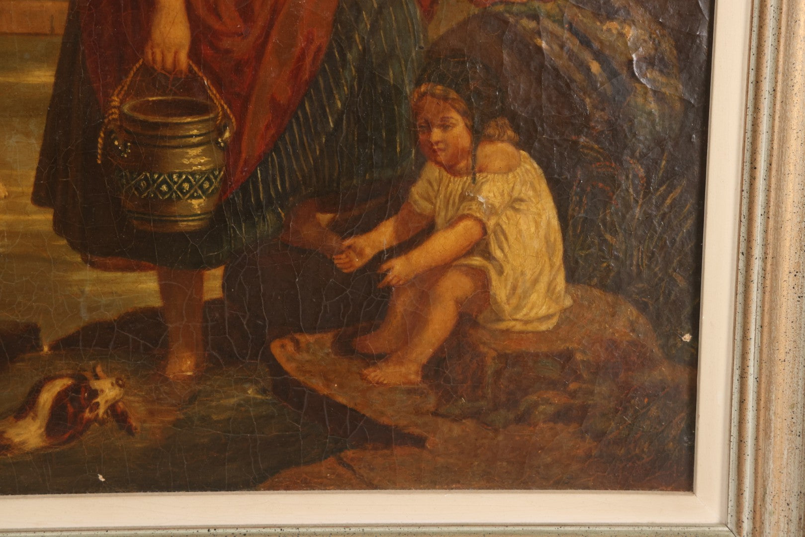 Lot 001 - Antique 19th Century Genre Painting Depicting Idyllic Peasant Life, Woman Gathering Water, Child Playing Fetch With Dog, In 20th Century Frame, As Found, 21" x 25"