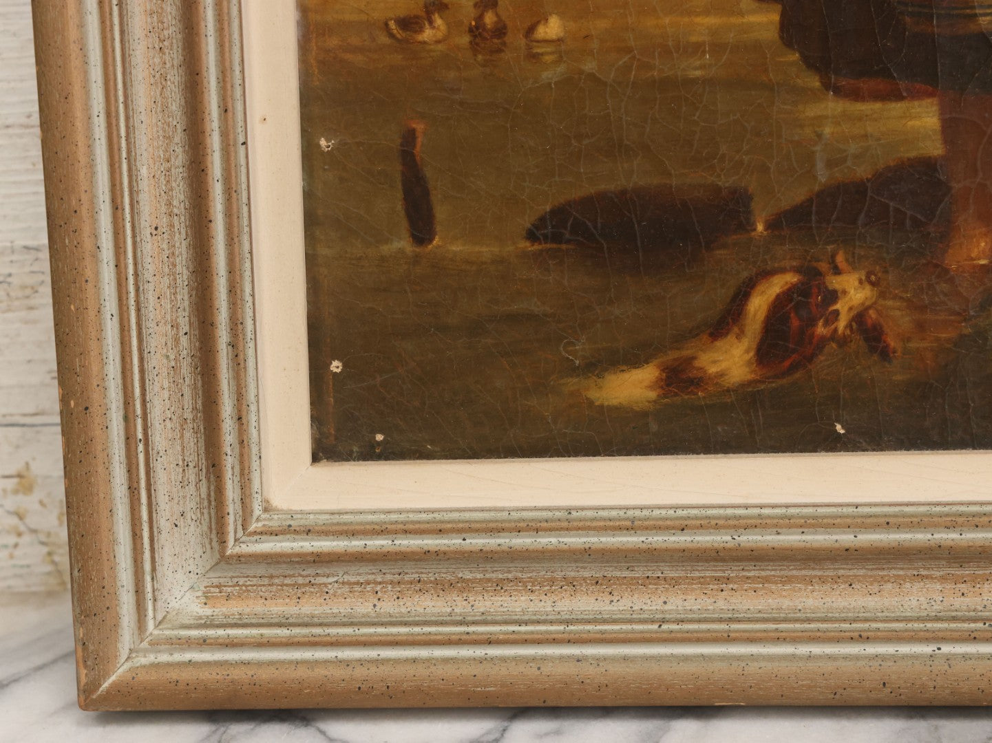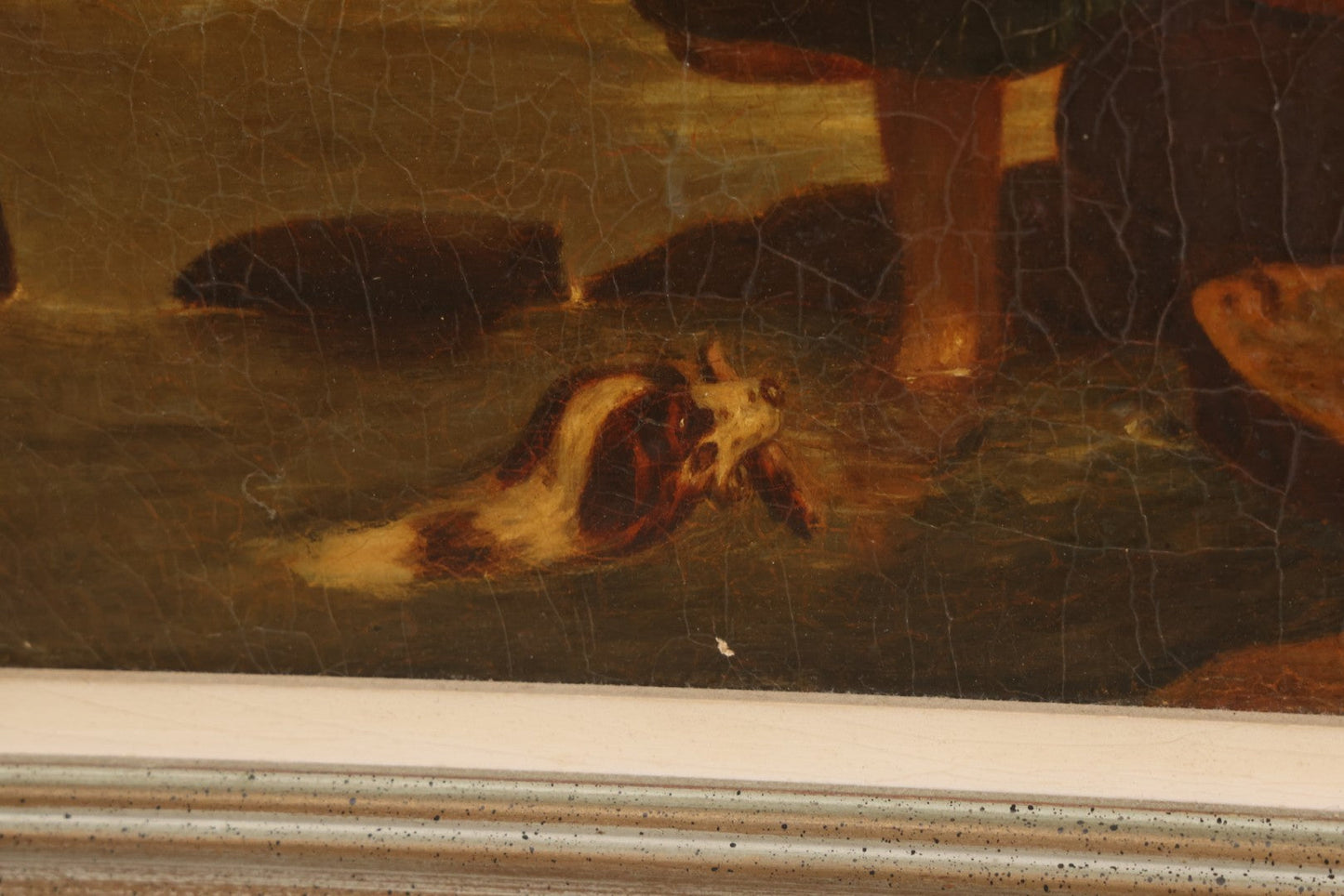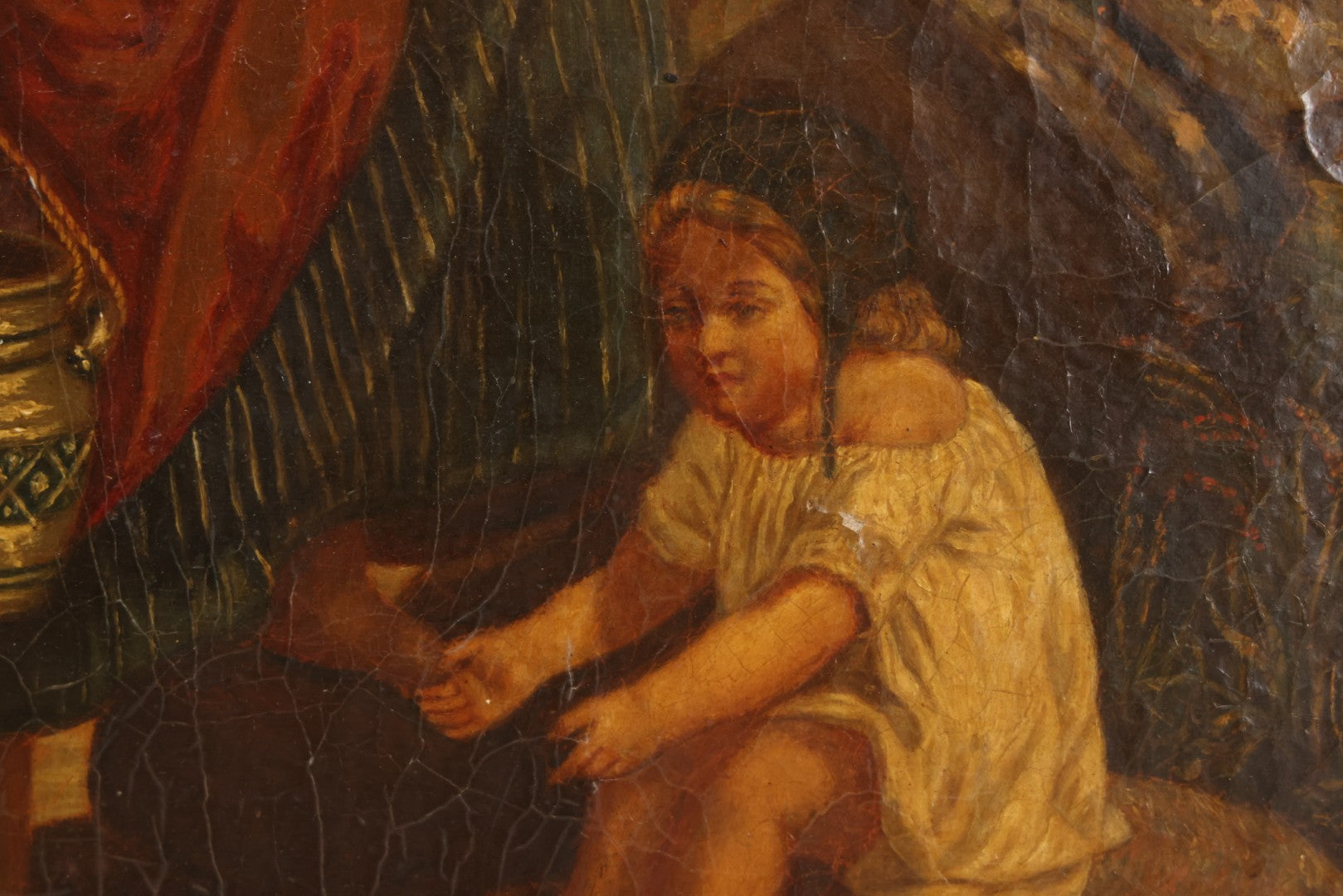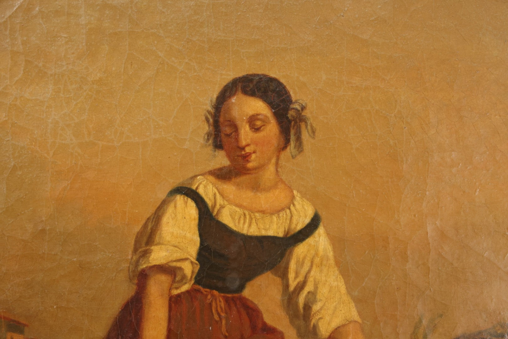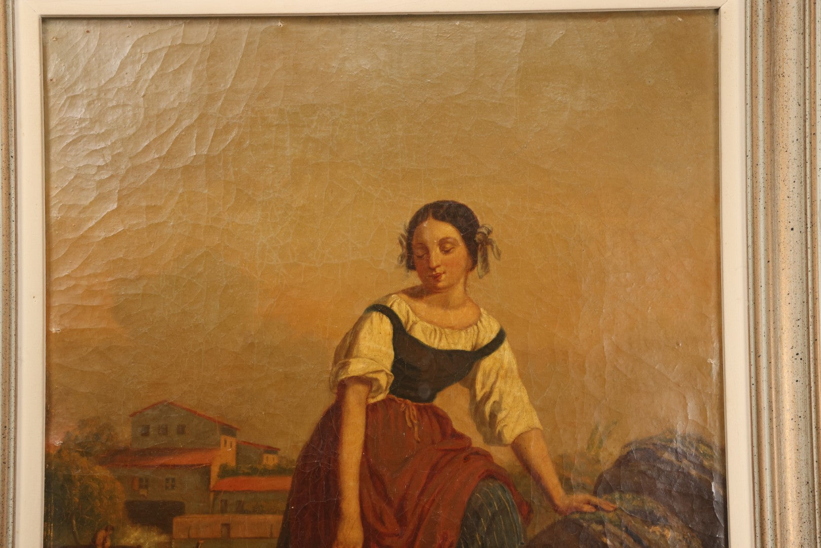 Lot 001 - Antique 19th Century Genre Painting Depicting Idyllic Peasant Life, Woman Gathering Water, Child Playing Fetch With Dog, In 20th Century Frame, As Found, 21" x 25"