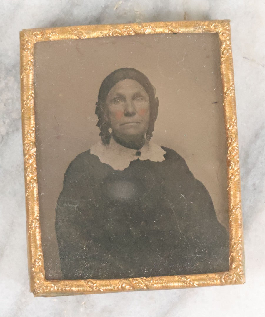 Lot 060 - Antique 1/9th Plate Ambrotype Photograph Of Surprised Older Woman With White Lace Collar And Tinted Rosy Red Cheeks, Uncased
