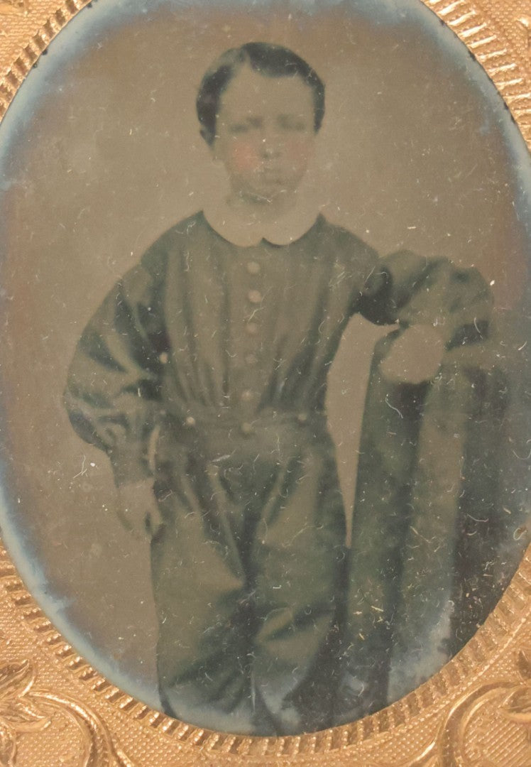 Lot 084 - Antique 1/9th Plate Ruby Ambrotype Photograph Of A Little Boy In A One Piece Suit, Leaning On Table