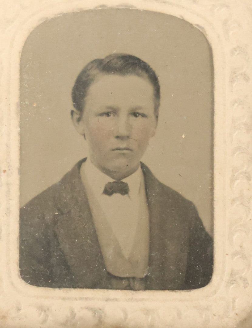 Lot 090 - Antique 1/9th Plate Tintype Photograph Of A Young Boy In A Jacket With A Bowtie, White Paper Mat
