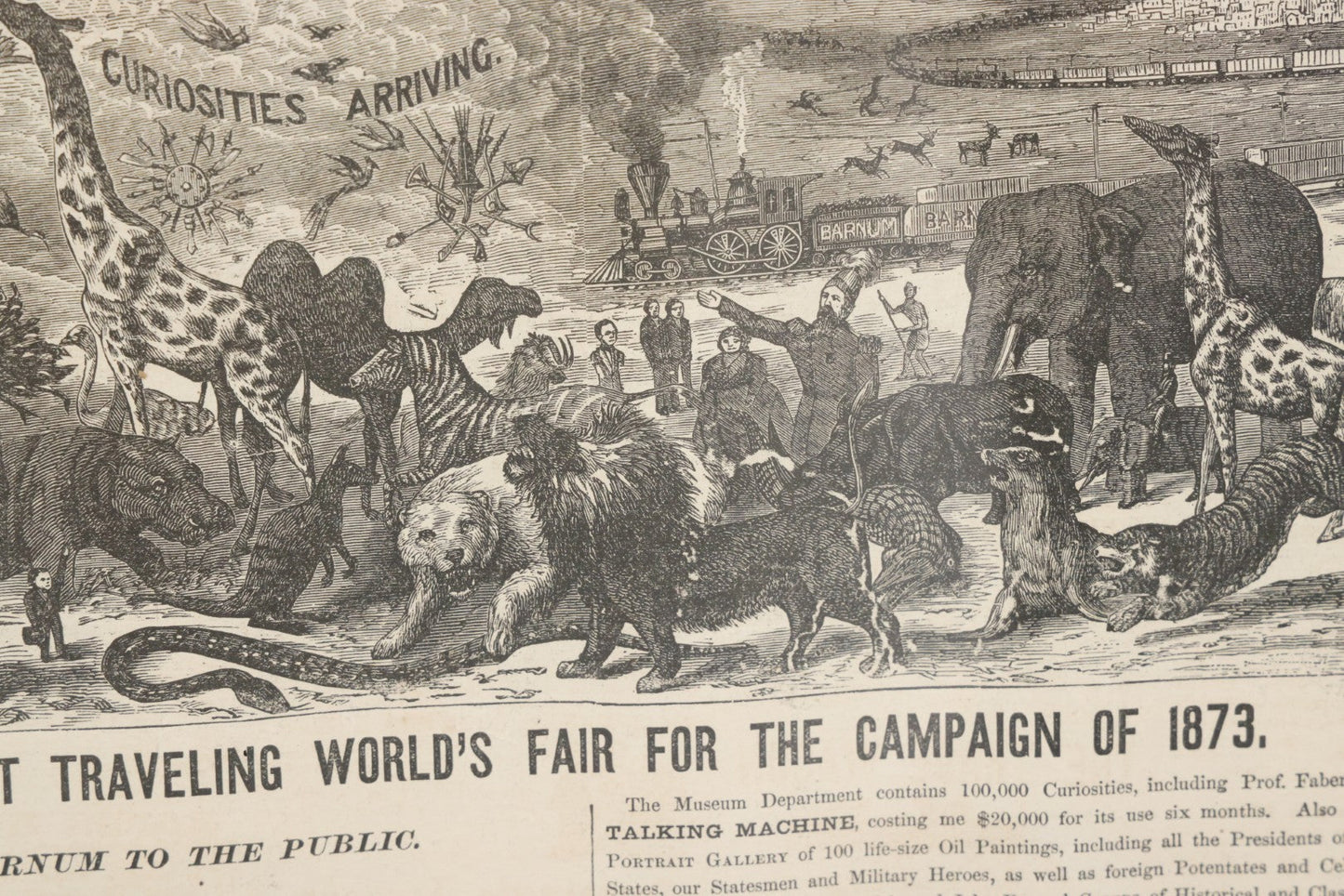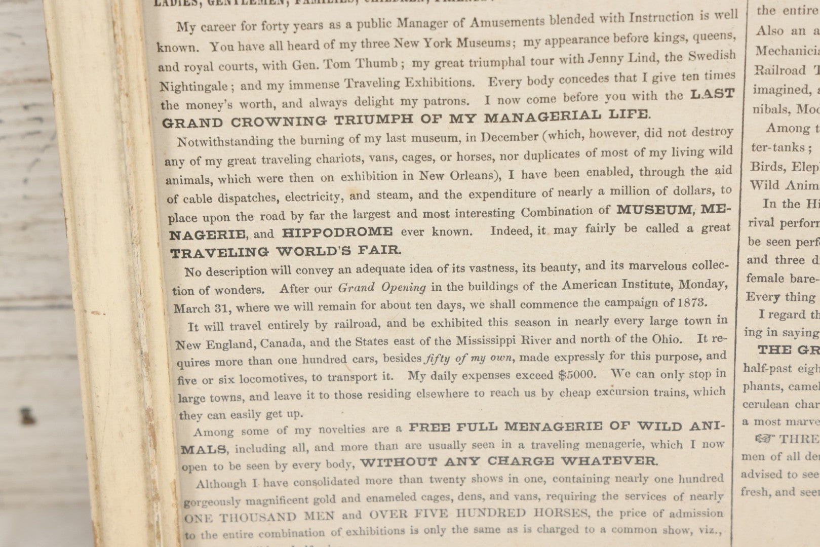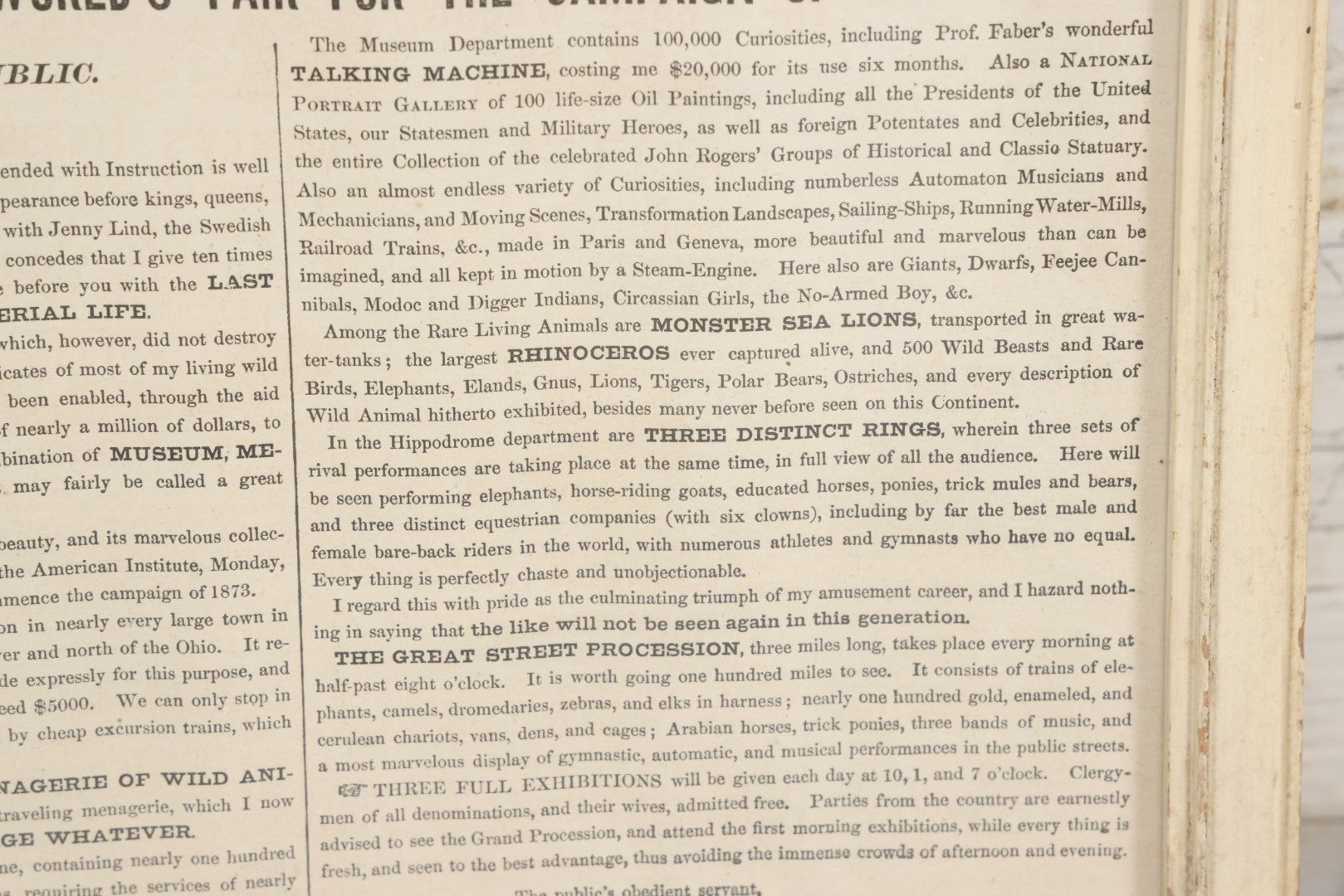Your absentee bid for Lot 046 - Antique Advertisement Clipping For P.T. Barnum's Great Traveling World's Fair For The Campaign Of 1873, From Harper's Weekly Magazine, March 29th, 1873 In Frame, 11" x 16-1/4" was successfully submitted—thank you for bidding with us!