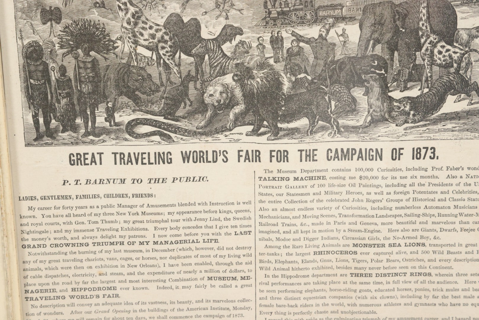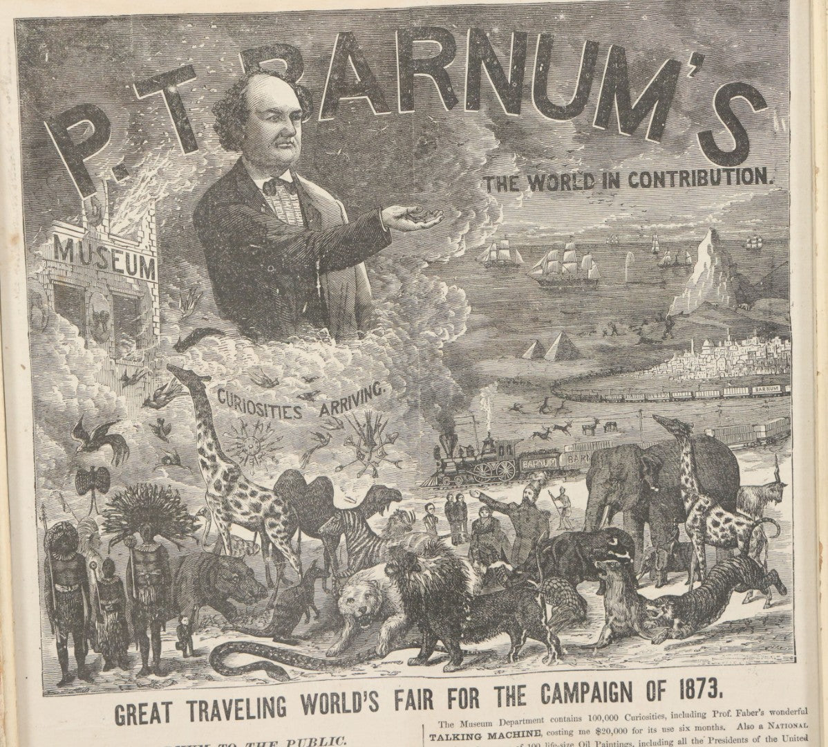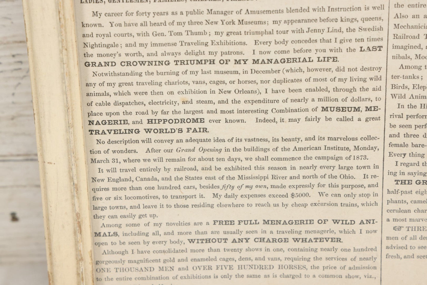 Your absentee bid for Lot 046 - Antique Advertisement Clipping For P.T. Barnum's Great Traveling World's Fair For The Campaign Of 1873, From Harper's Weekly Magazine, March 29th, 1873 In Frame, 11" x 16-1/4" was successfully submitted—thank you for bidding with us!