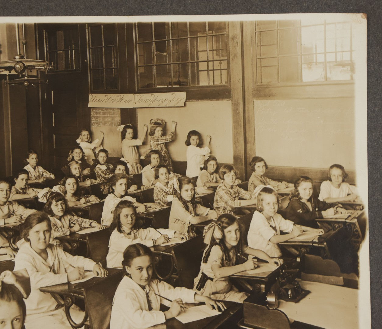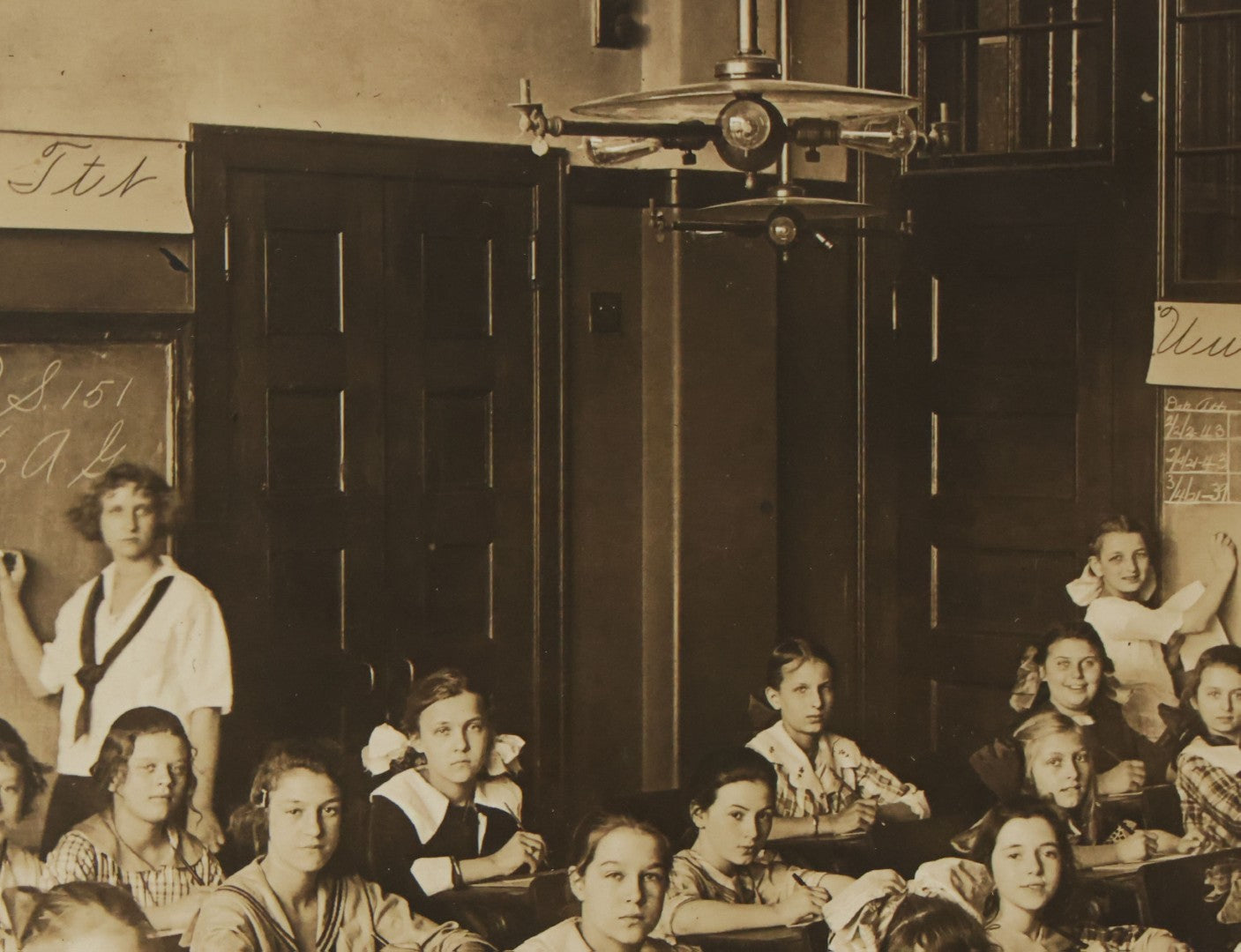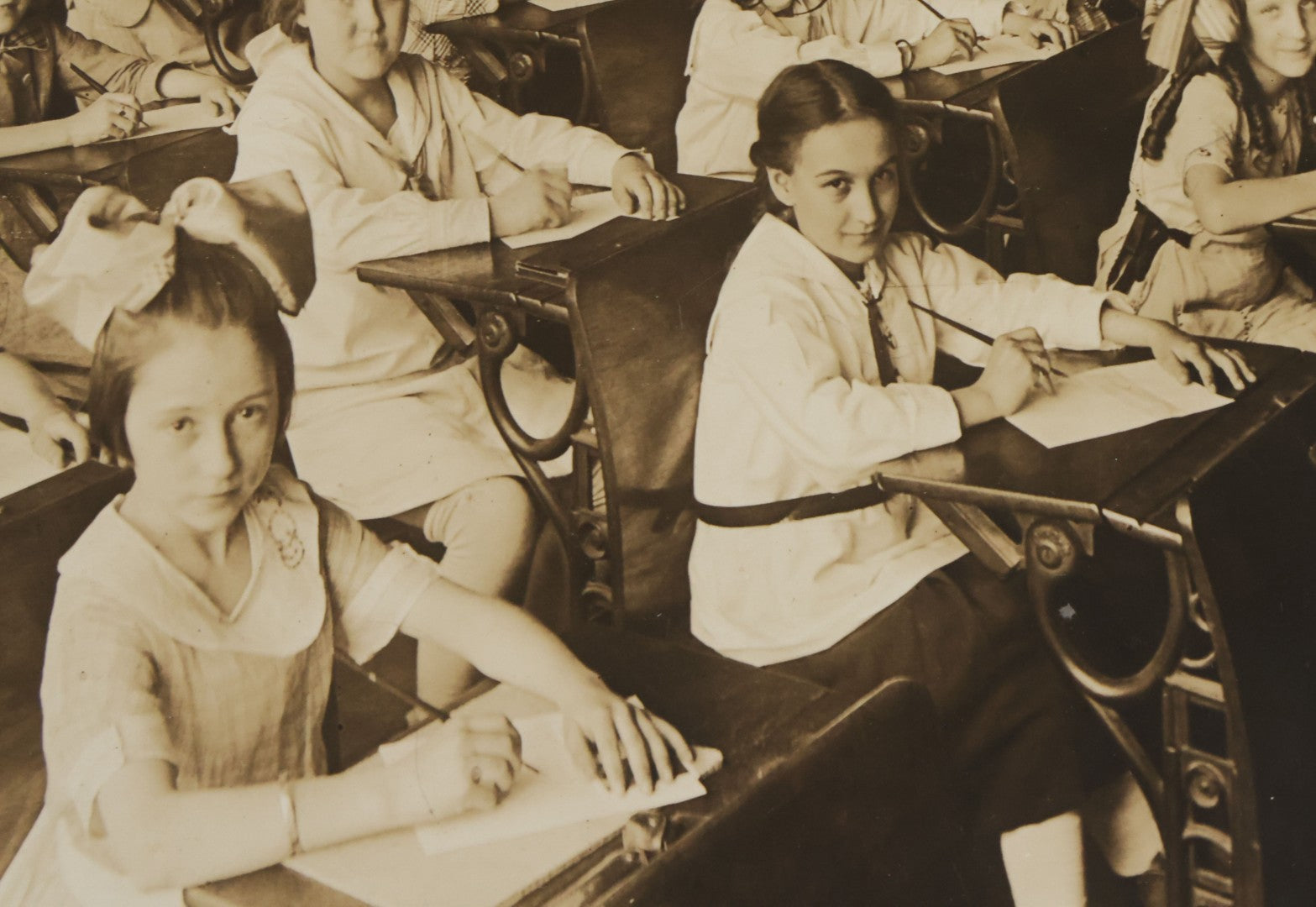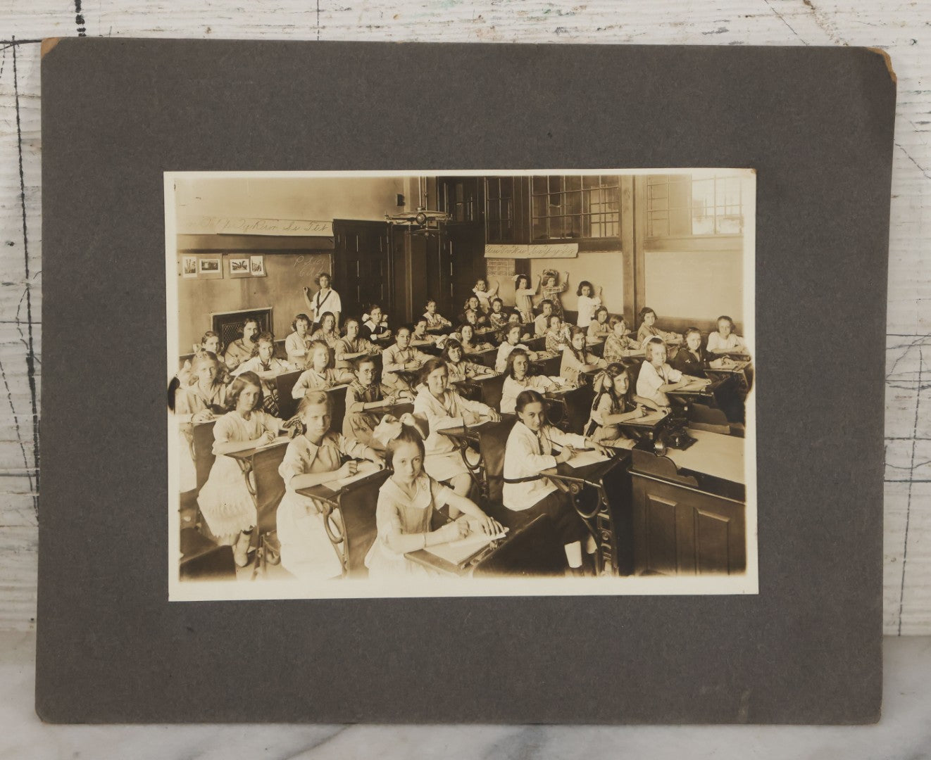 Lot 067 - Antique Boarded Interior Schoolroom Photograph Of Class Of Girls And Their Teacher (6th Grade), April 29, 1921, Partial Identification On Verso