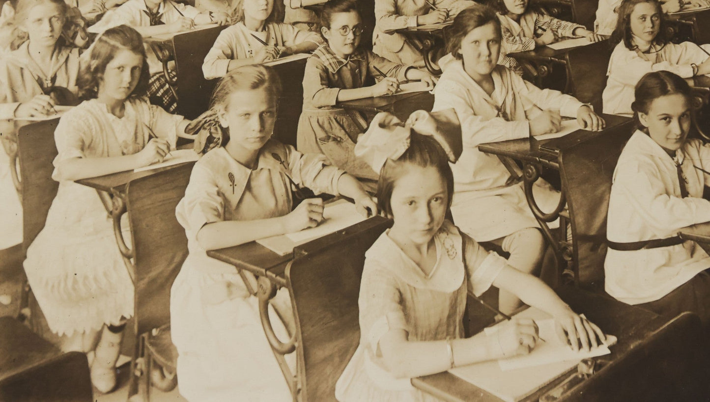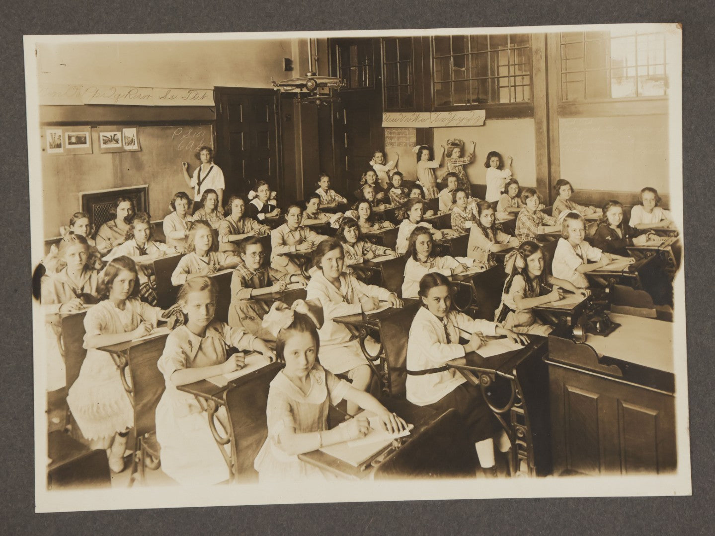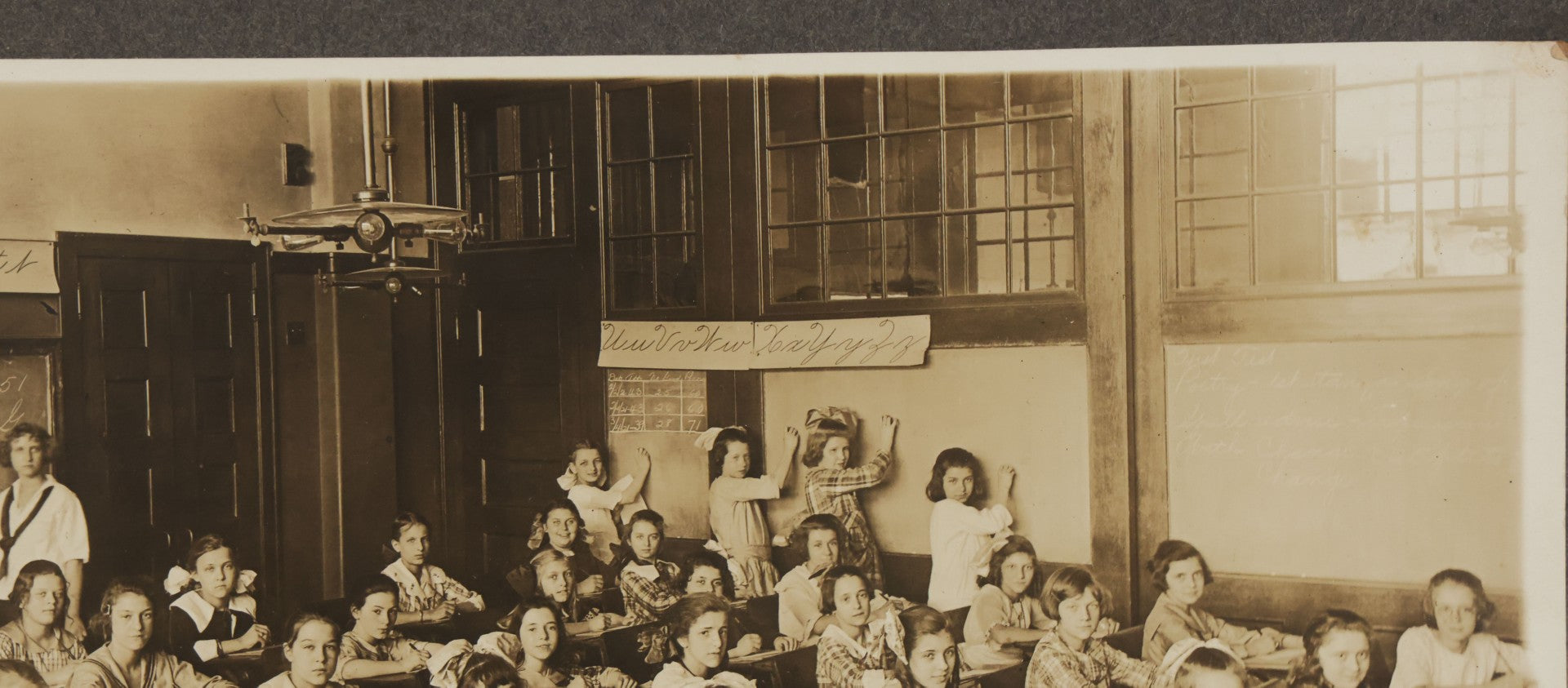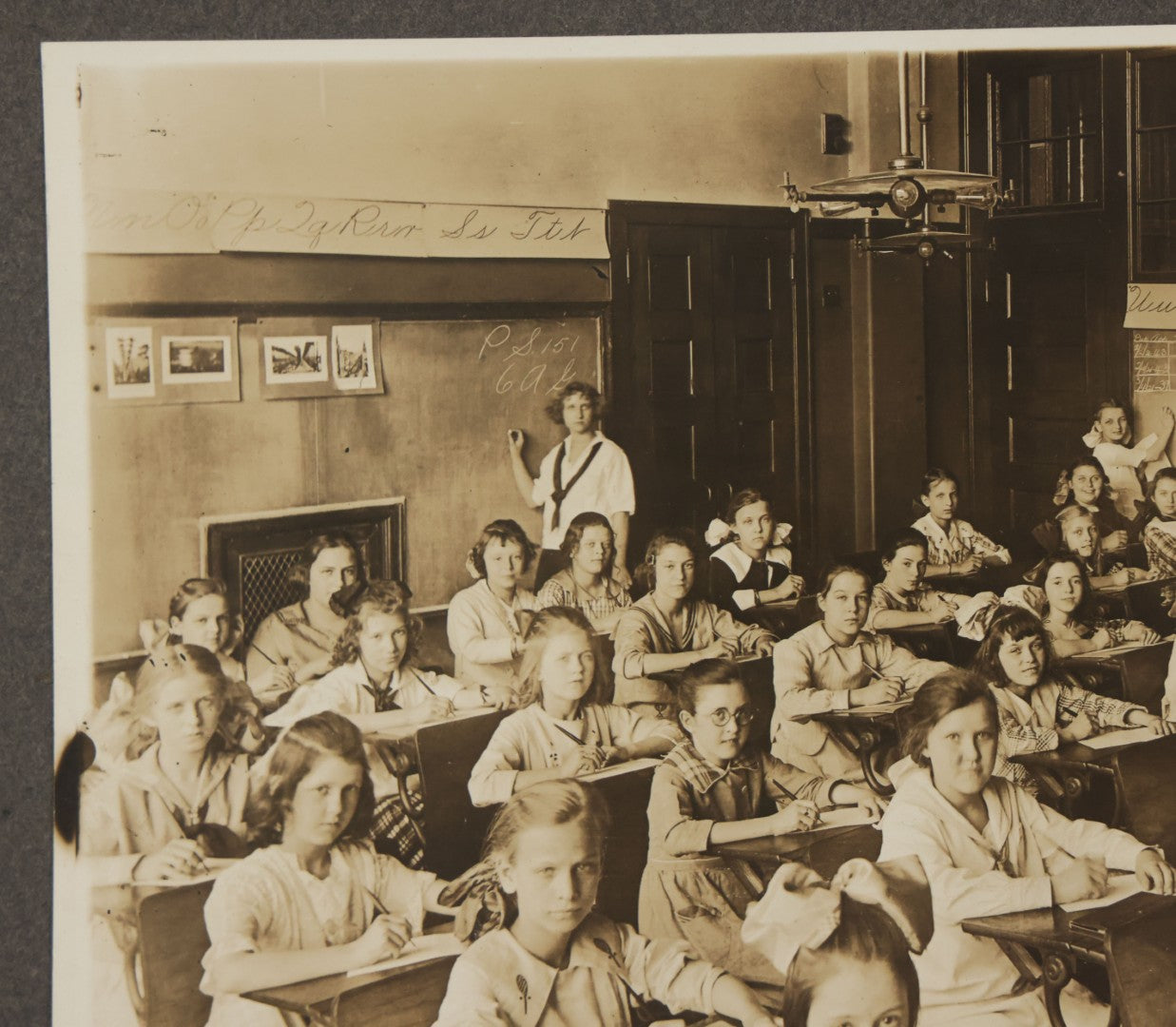 Lot 067 - Antique Boarded Interior Schoolroom Photograph Of Class Of Girls And Their Teacher (6th Grade), April 29, 1921, Partial Identification On Verso