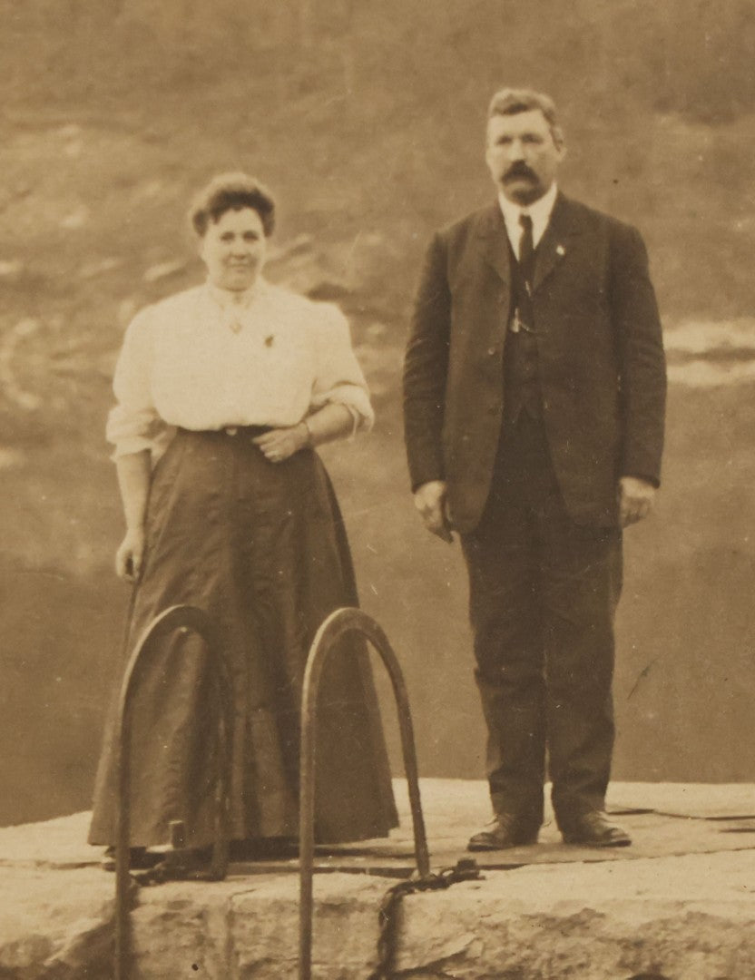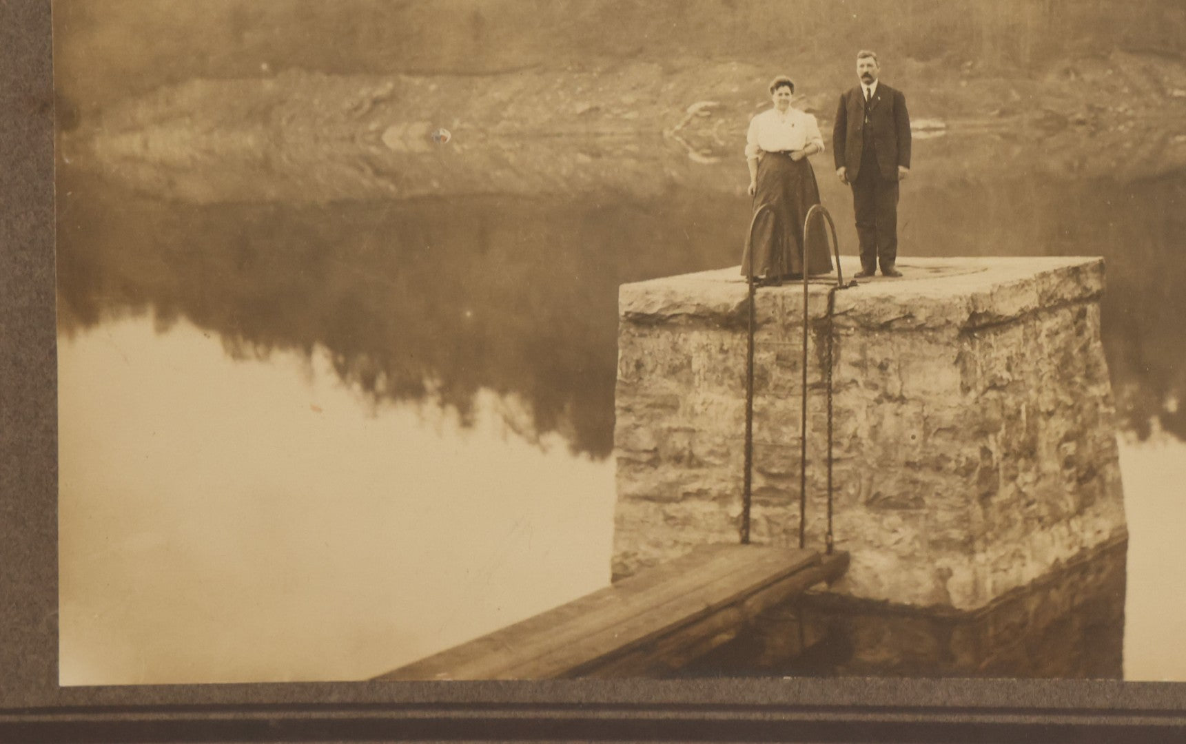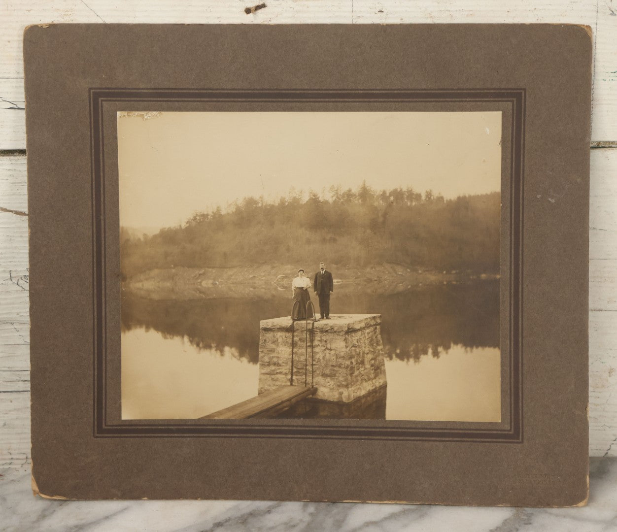 Lot 057 - Antique Boarded Photograph Of A Man And Woman Posing On A Dam