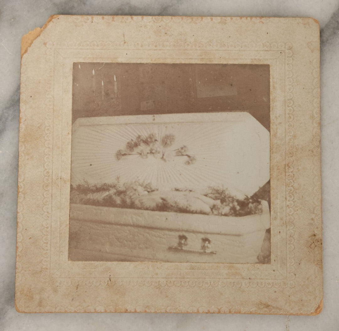 Lot 050 - Antique Boarded Photograph Of An Open Casket Funeral With A White Coffin, Corpse Not Visible, Identified On Verso As Mable McCloud