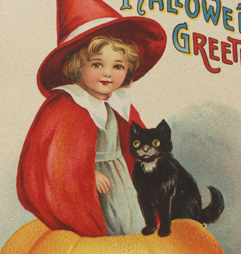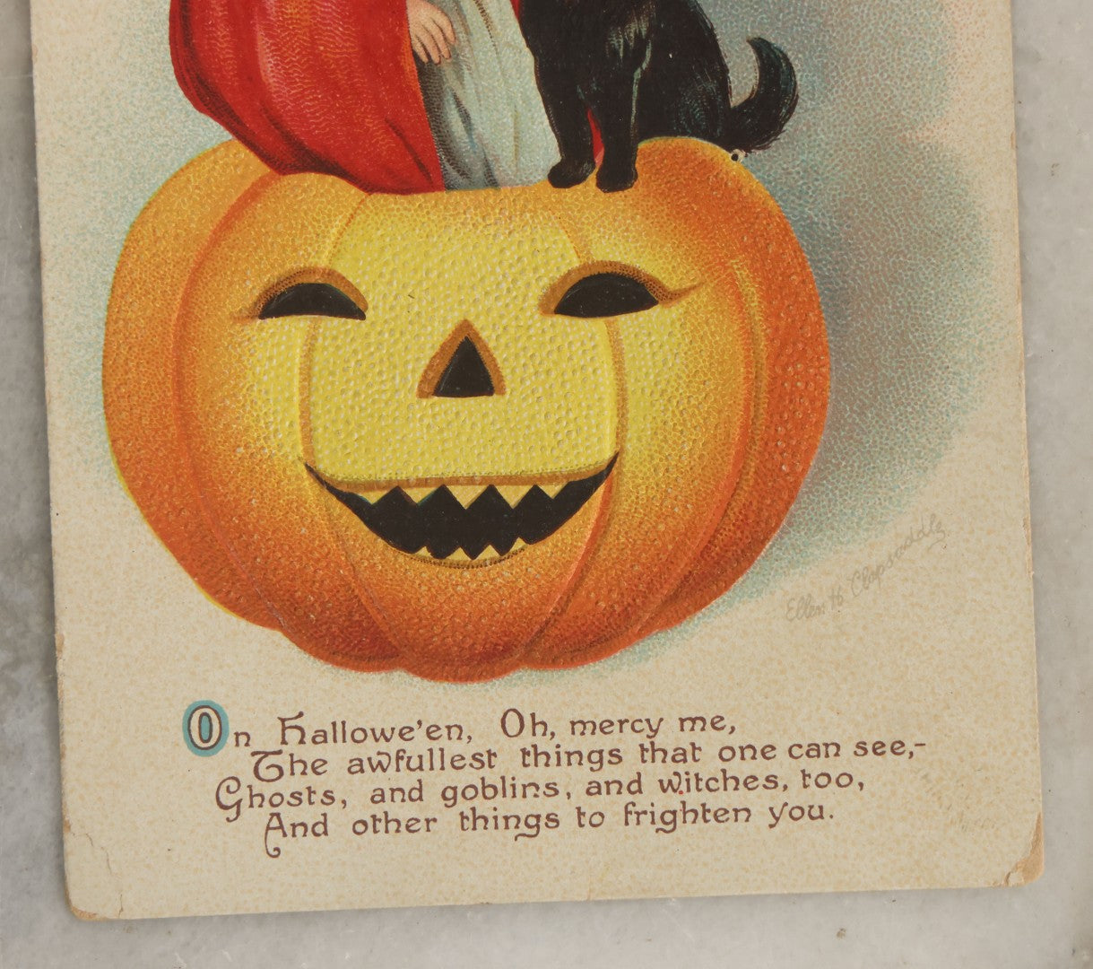 Lot 033 - Antique Embossed Halloween Postcard With Little Girl Witch, Black Cat, Smiling Pumpkin Jack-O-Lantern J.O.L., Illustrated By Ellen Clapsaddle, Series No. 1667, International Art Publishing Co., Printer In Germany, Unused, Note Corner Loss