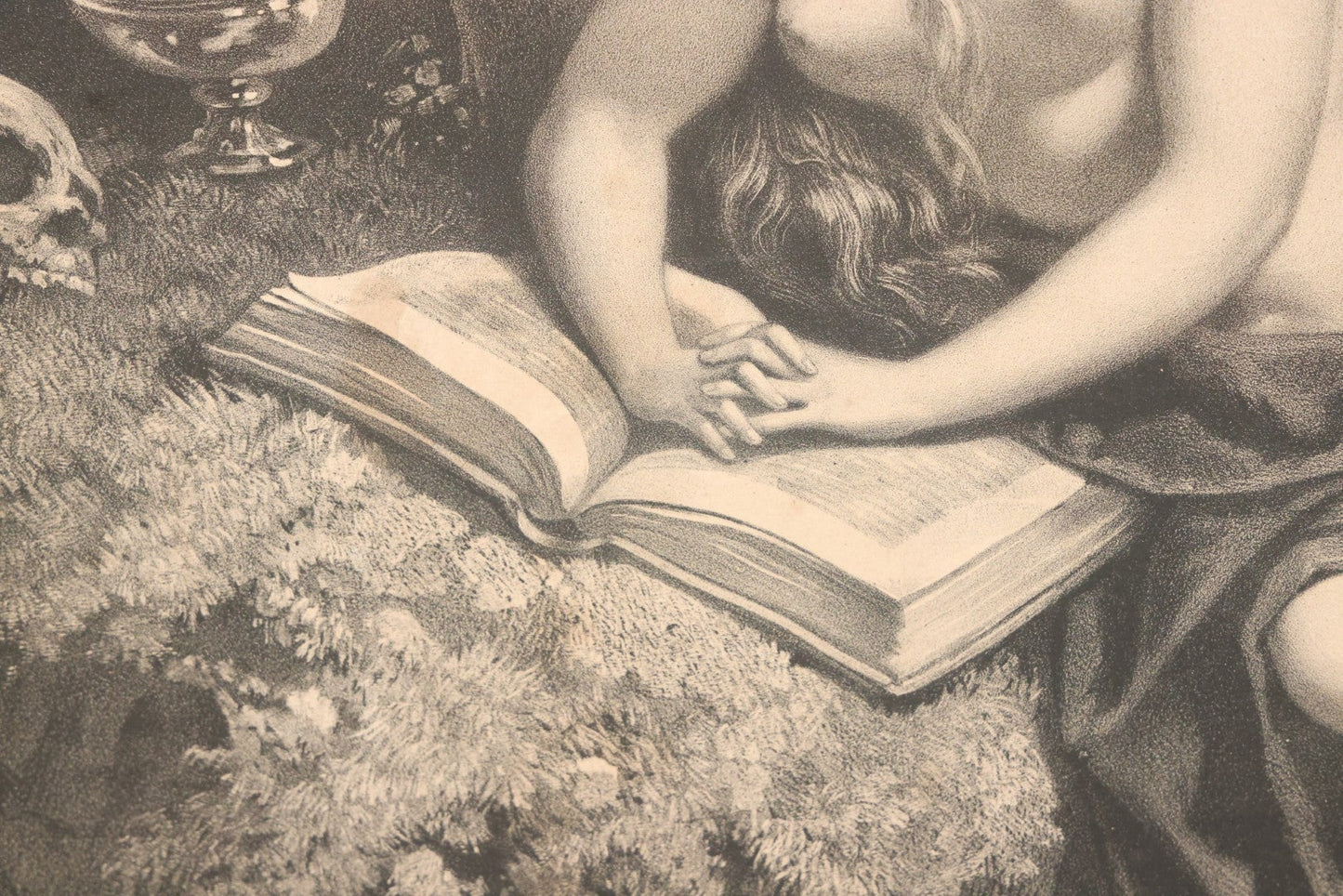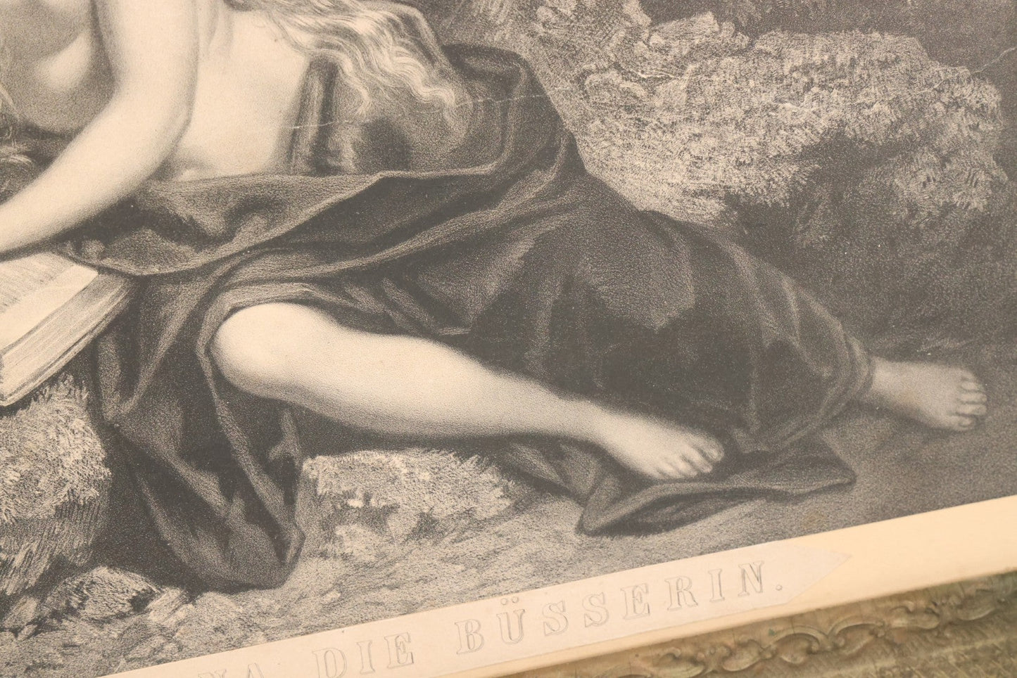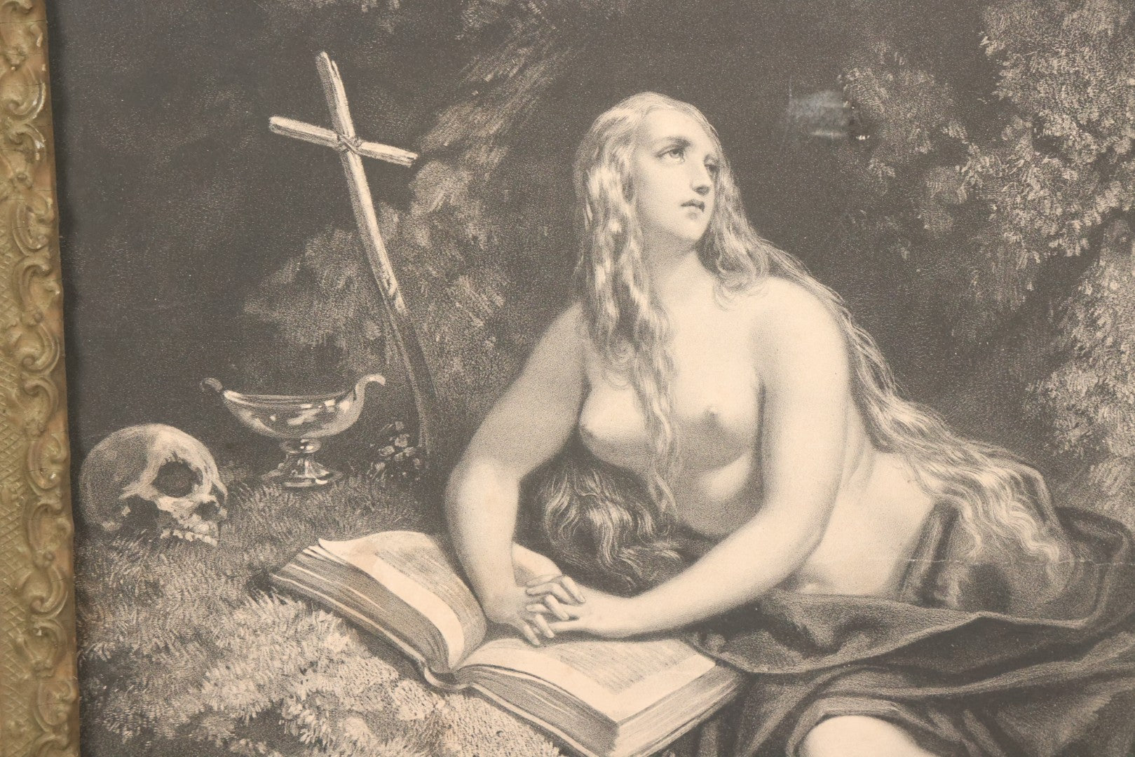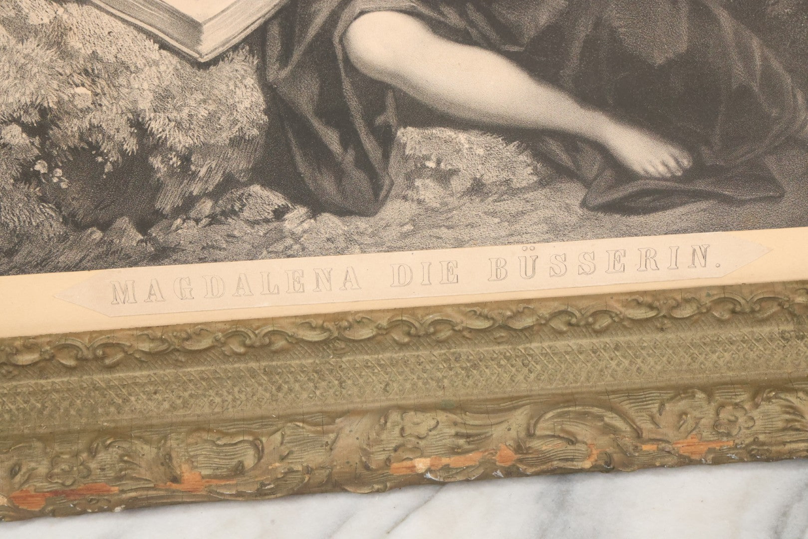 Lot 002 - Antique Engraving Print Of "Magdalena Die Büsserin" (Magdalena, The Penitent), Featuring A Nude Mary Magdalene In Contemplation Beside A Skull, In Ornate Frame, 26" x 22"