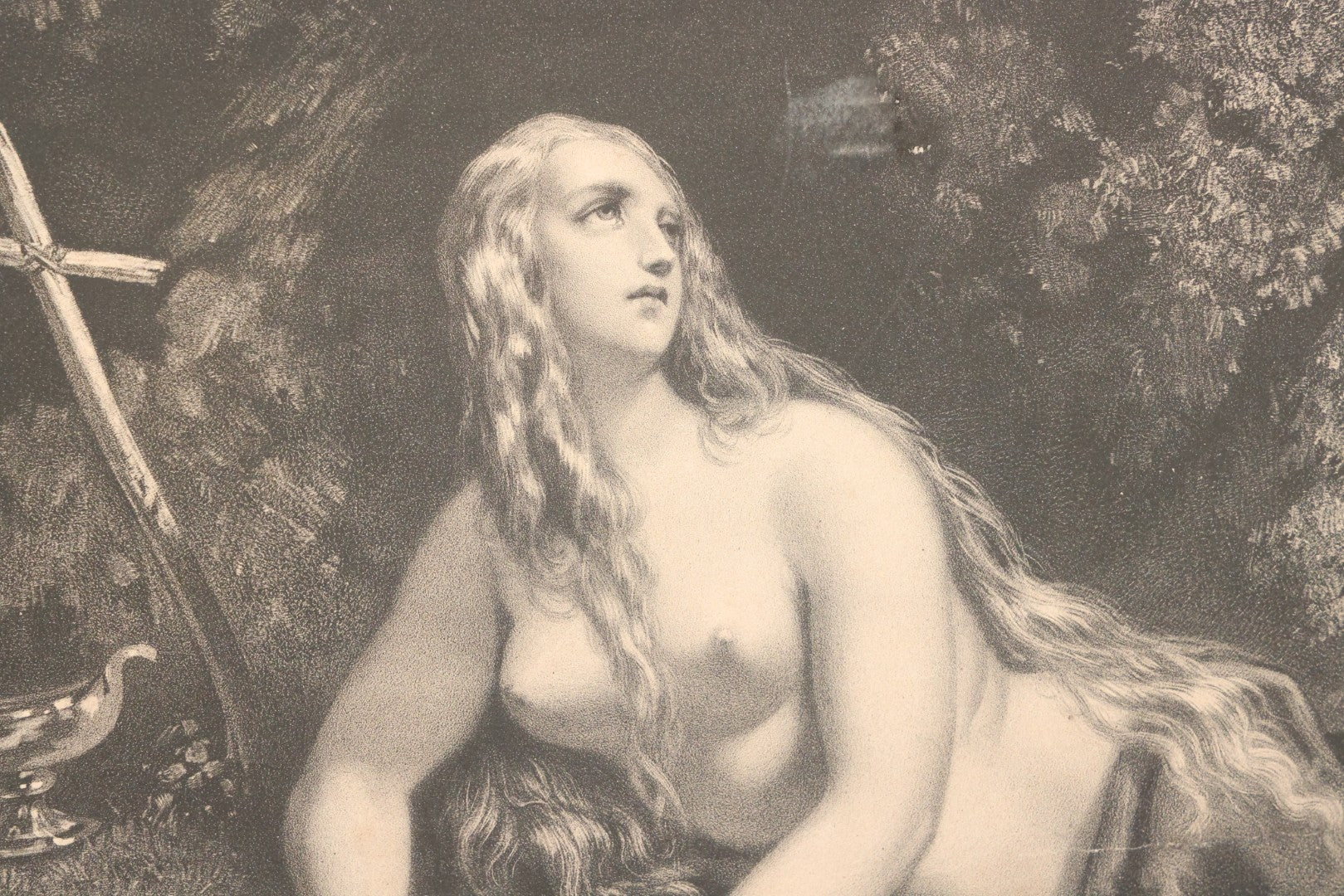 Your absentee bid for Lot 002 - Antique Engraving Print Of "Magdalena Die Büsserin" (Magdalena, The Penitent), Featuring A Nude Mary Magdalene In Contemplation Beside A Skull, In Ornate Frame, 26" x 22" was successfully submitted—thank you for bidding with us!