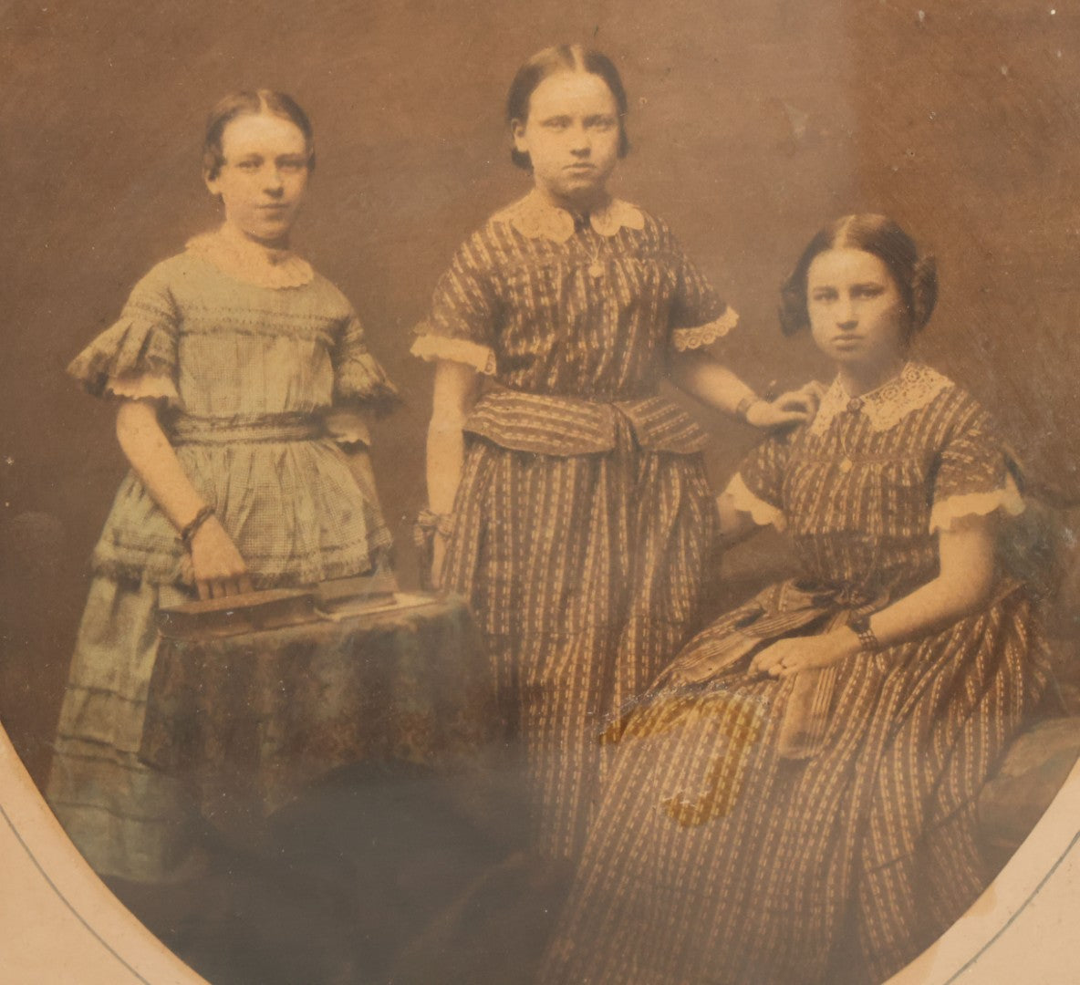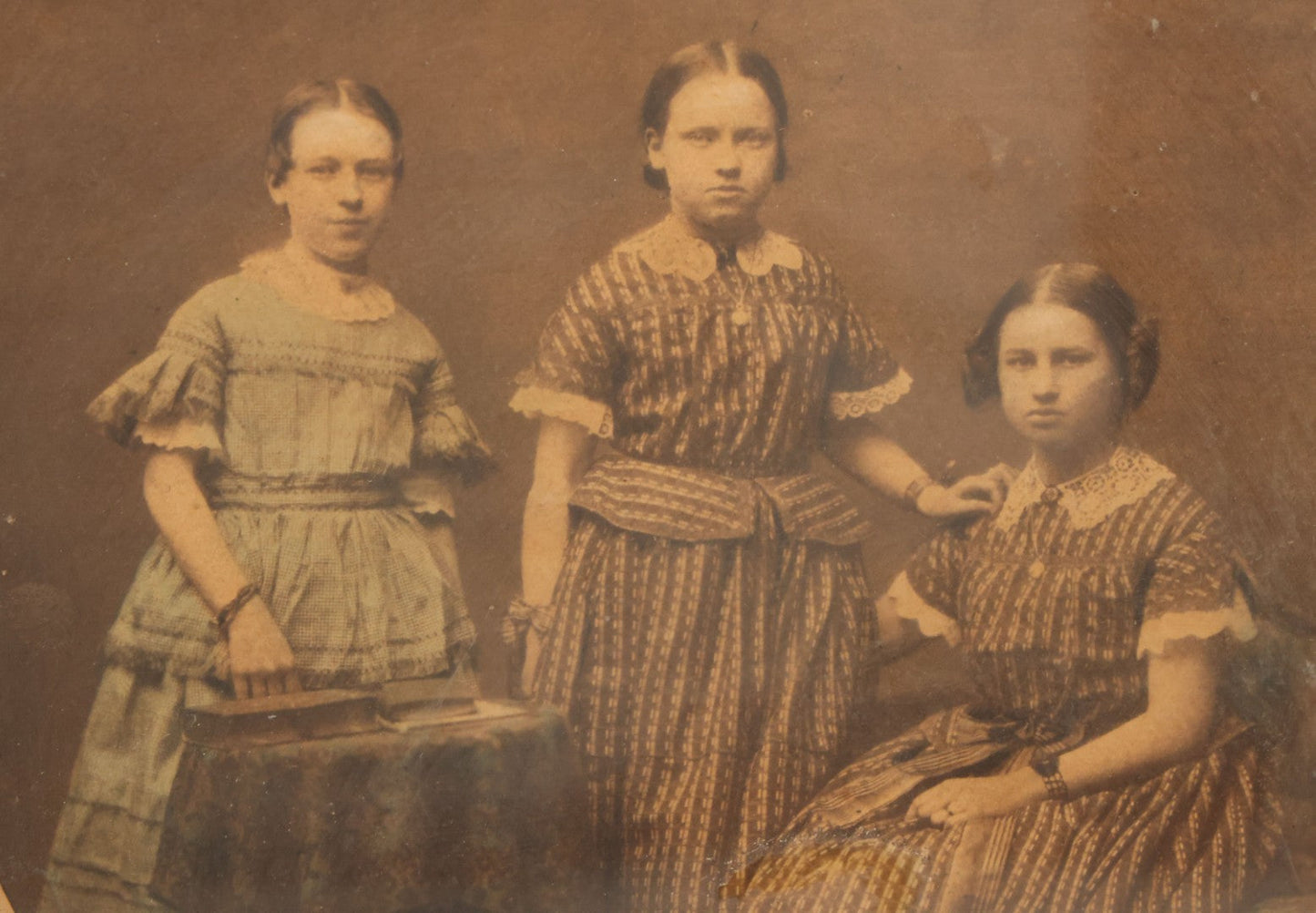 Lot 078 - Antique Framed Hand Tinted Photograph Of Three Young Girls, Likely Sisters, In Dresses, I.D. In Pencil On Verso