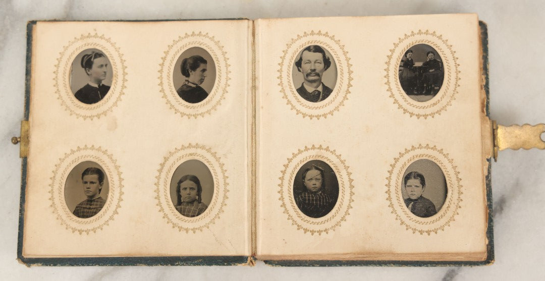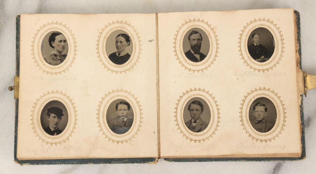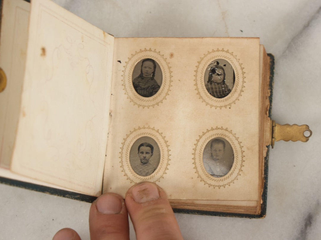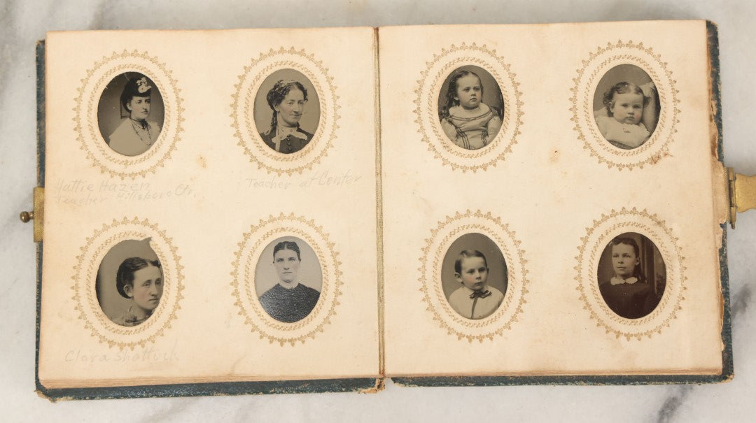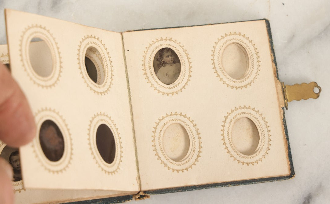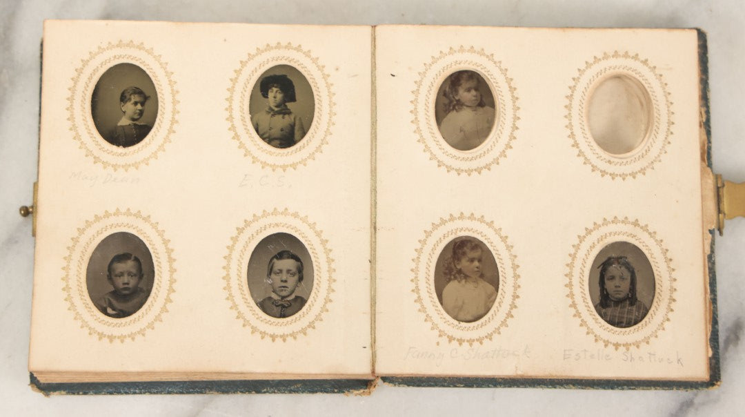 Lot 080 - Antique Green Gem Tintype Photograph Album Containing 70+ Photos, Including Twin Girls, Many Identified (All Pages Pictured)