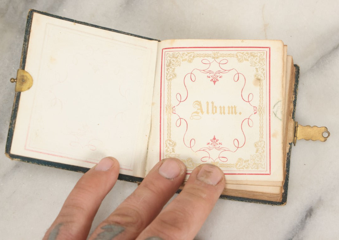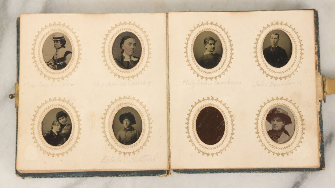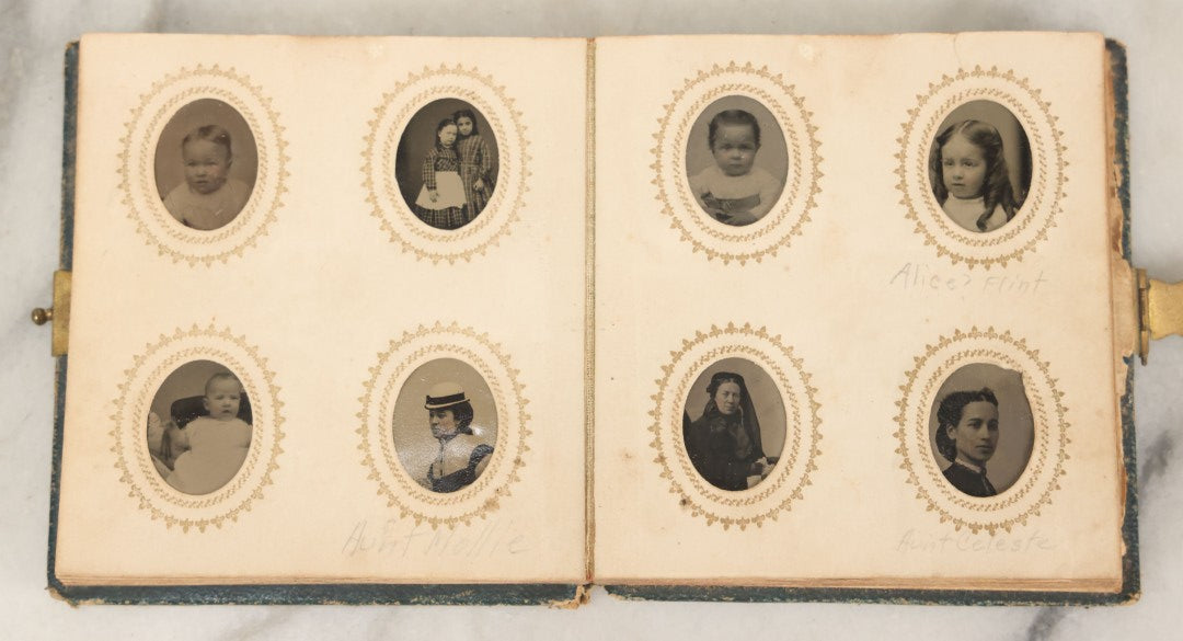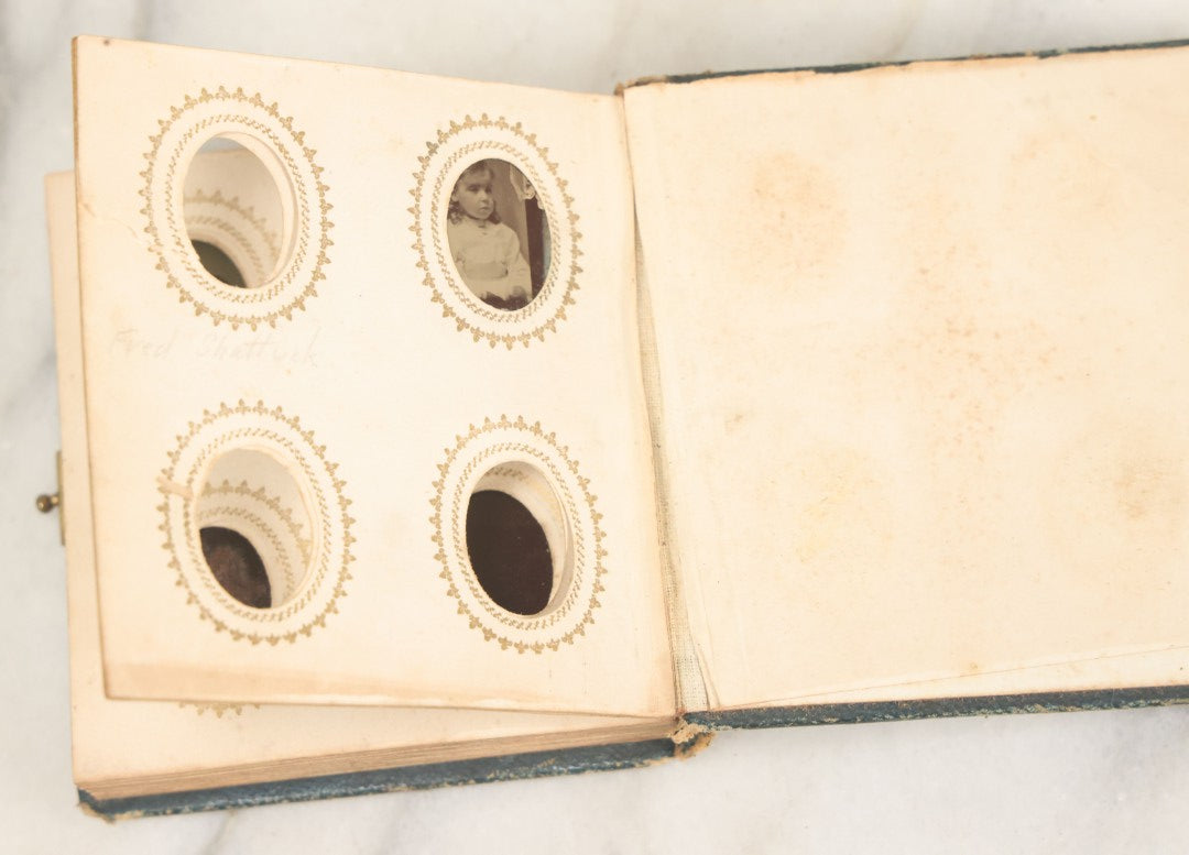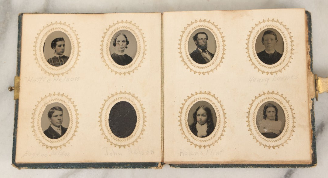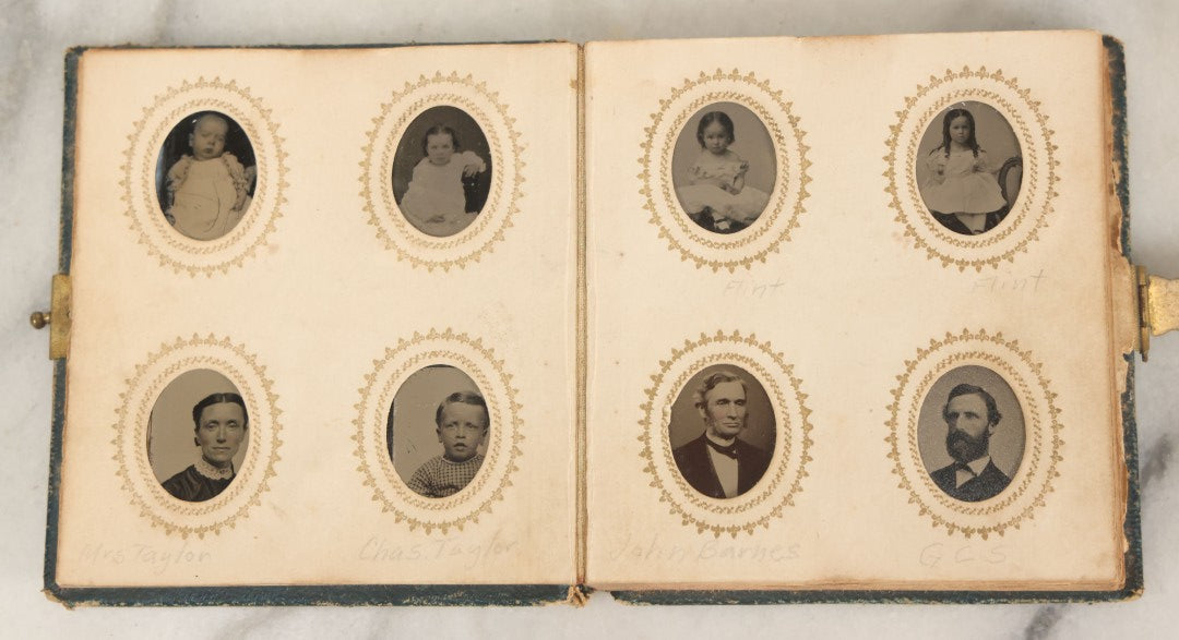 Lot 080 - Antique Green Gem Tintype Photograph Album Containing 70+ Photos, Including Twin Girls, Many Identified (All Pages Pictured)