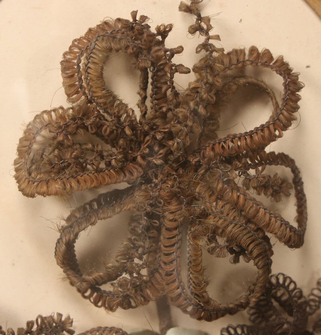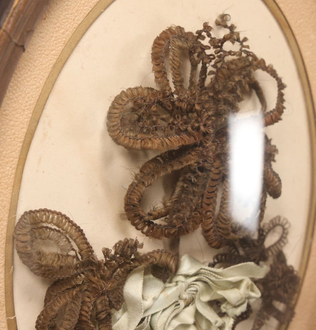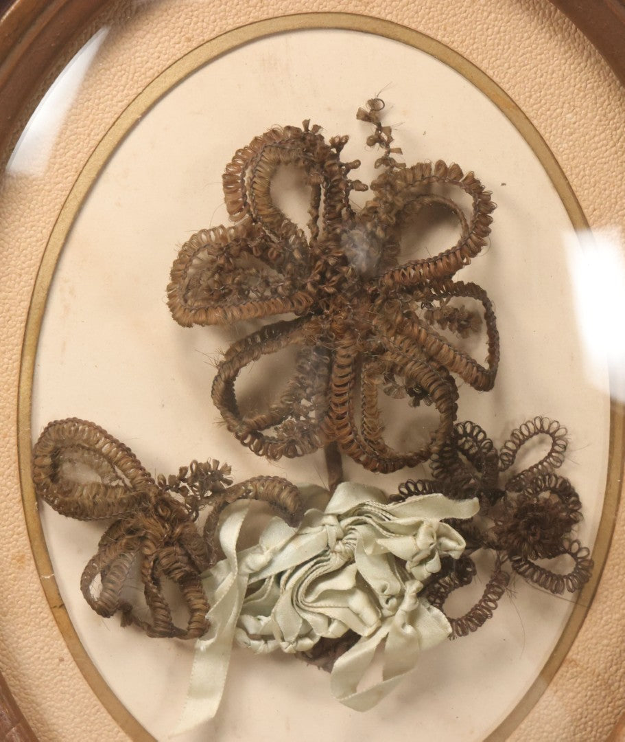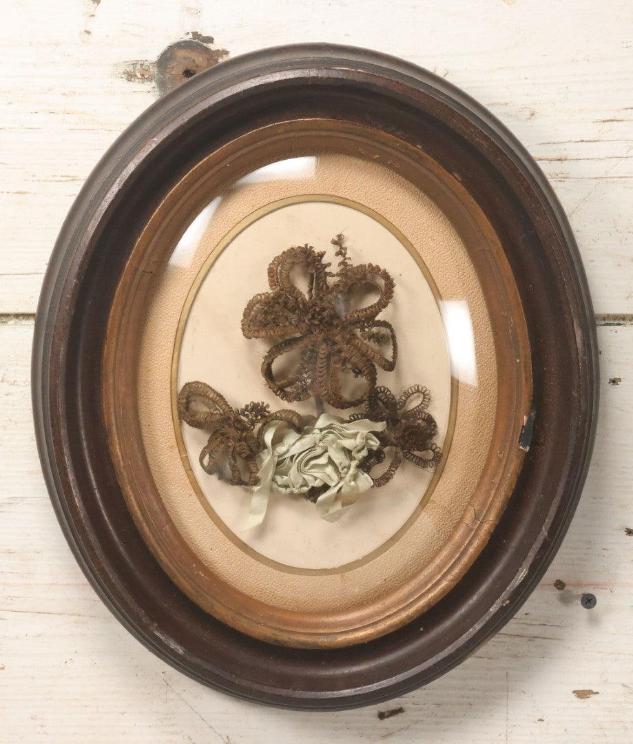 Lot 002 - Antique Hair Art Flower With Blue Ribbon In Original Bubble Glass Frame, Circa Mid 19th Century, 11-3/8" W x 13-5/8" H