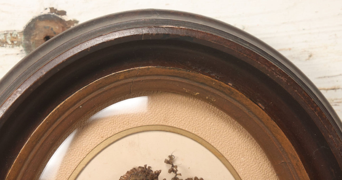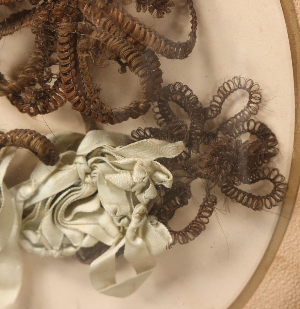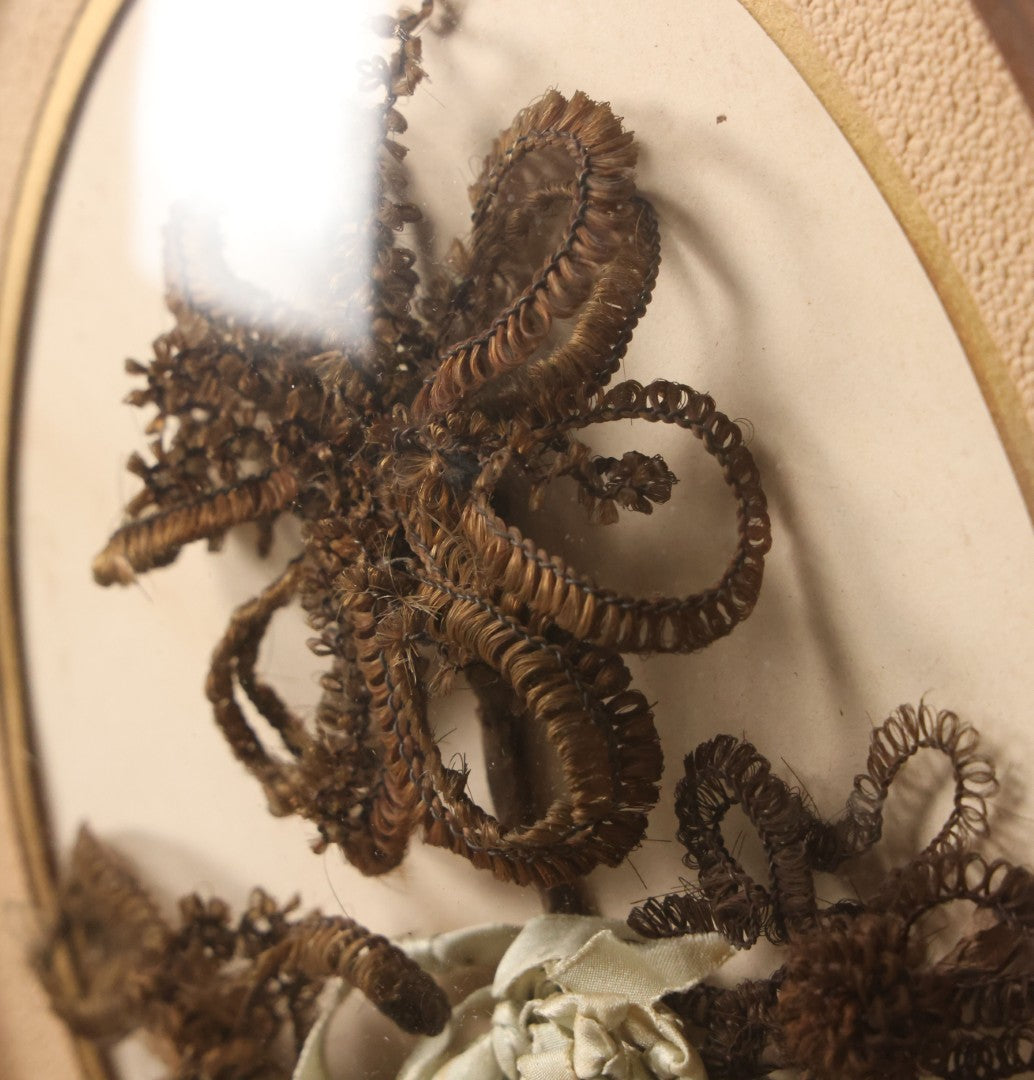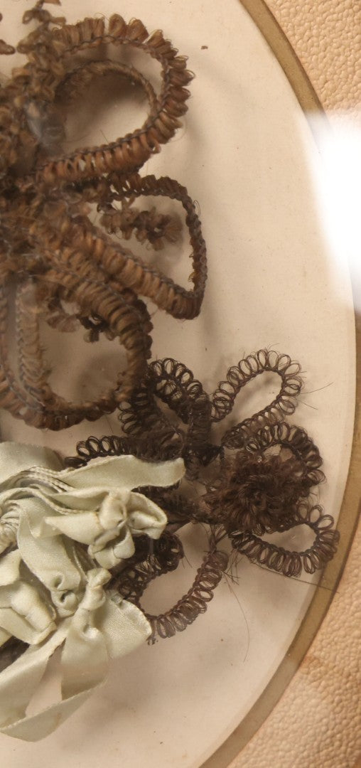 Lot 002 - Antique Hair Art Flower With Blue Ribbon In Original Bubble Glass Frame, Circa Mid 19th Century, 11-3/8" W x 13-5/8" H