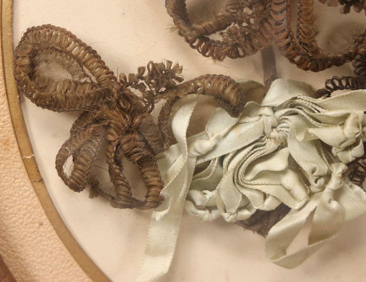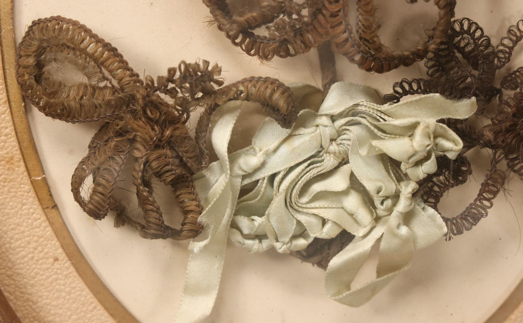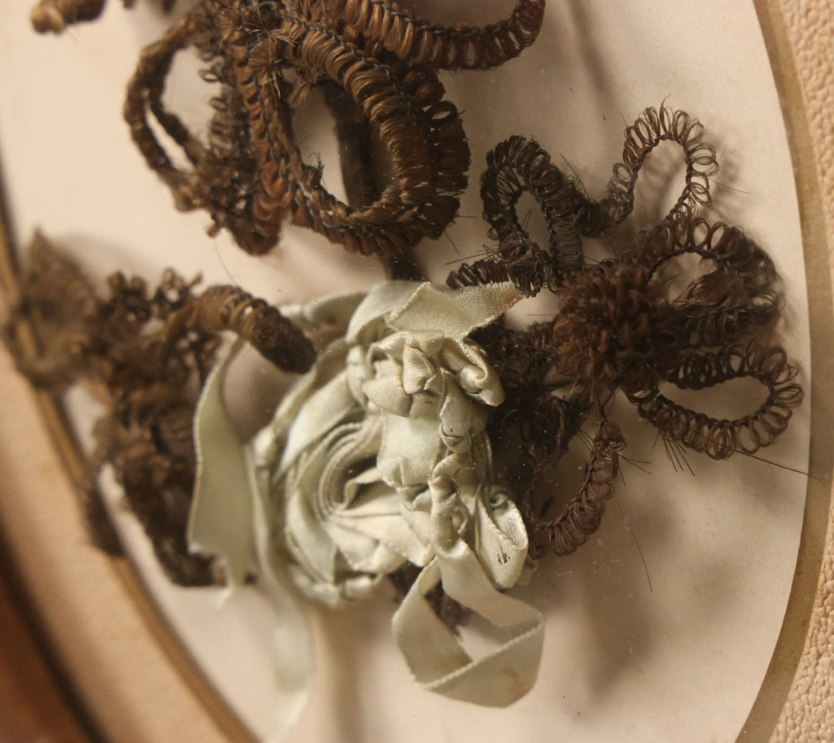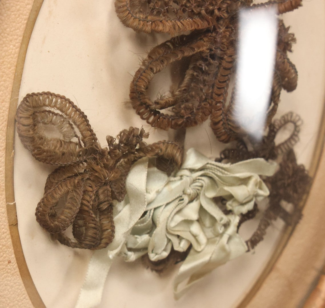 Lot 002 - Antique Hair Art Flower With Blue Ribbon In Original Bubble Glass Frame, Circa Mid 19th Century, 11-3/8" W x 13-5/8" H