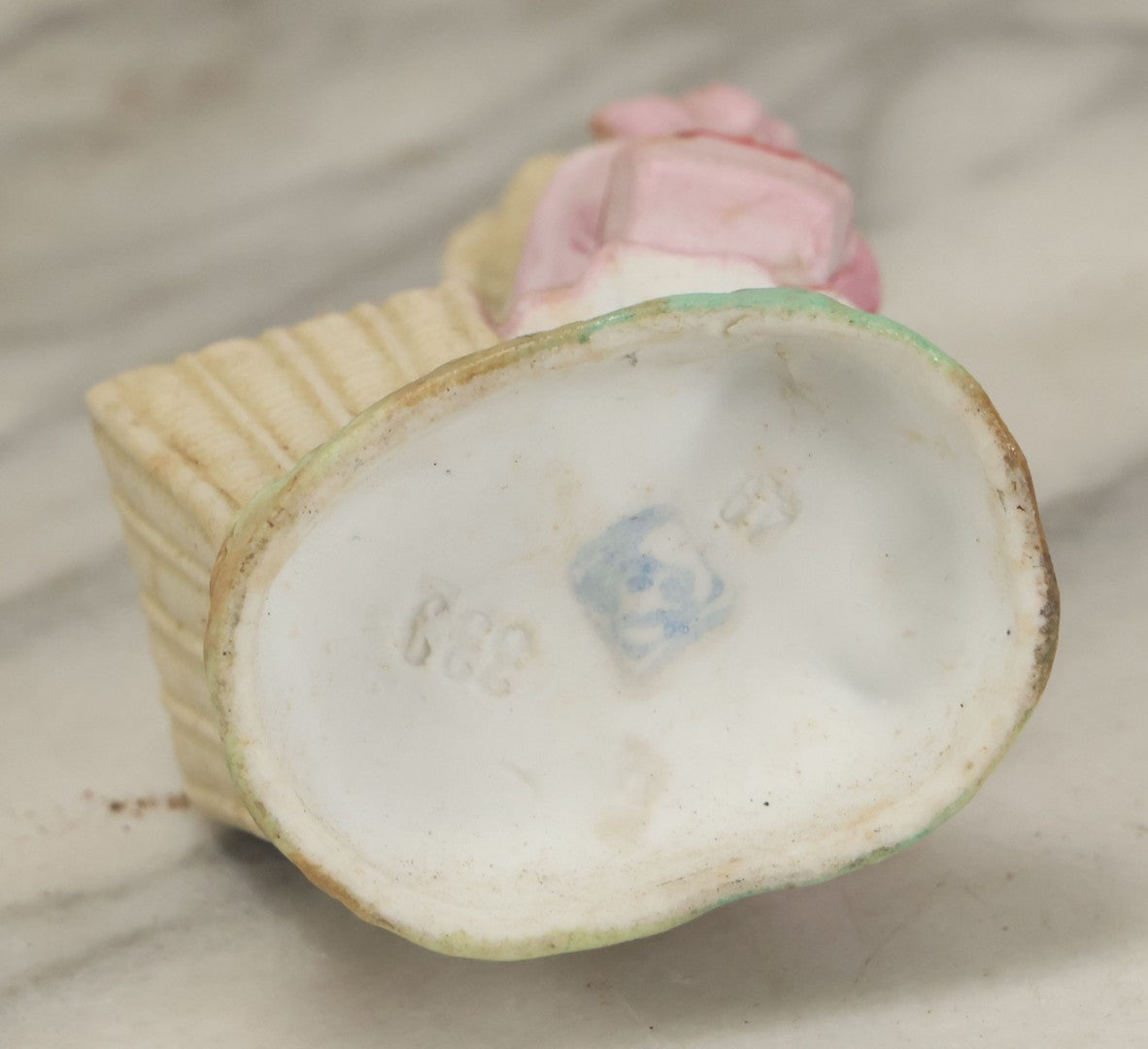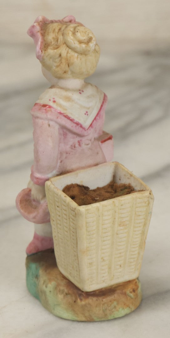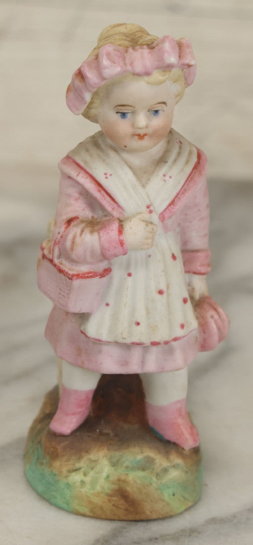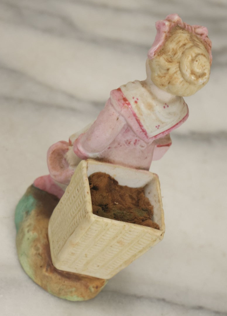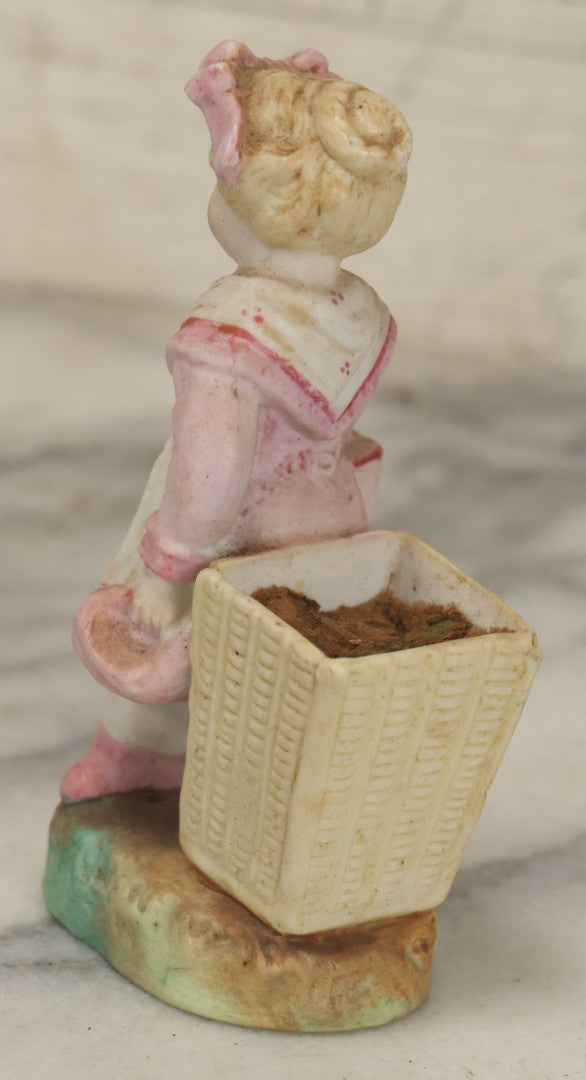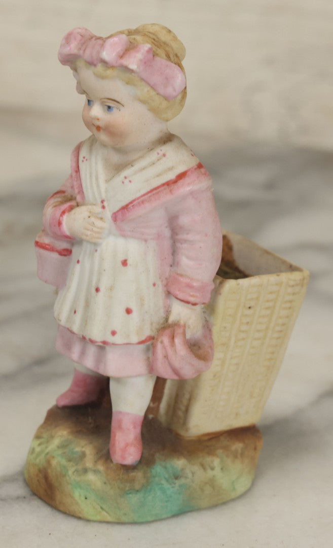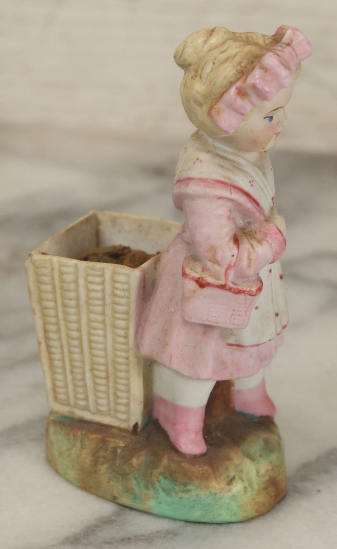 Lot 065 - Antique Hand-Painted Bisque Girl Figural Match Strike, Match Safe, Pink Dress And Bonnet, Likely German