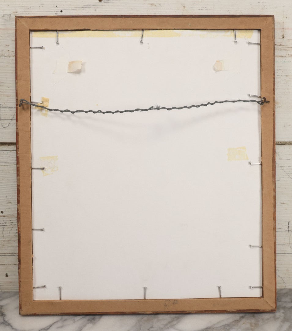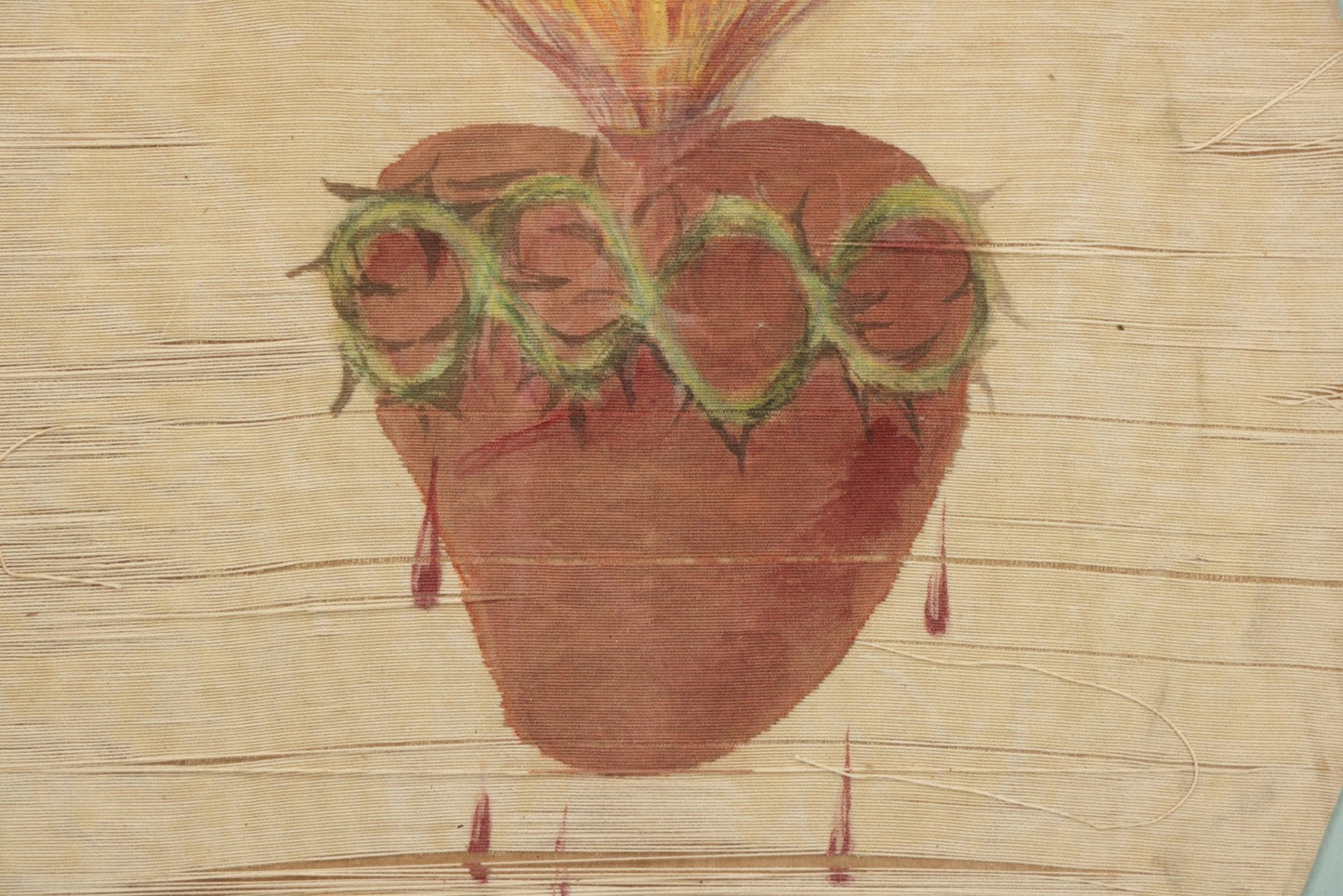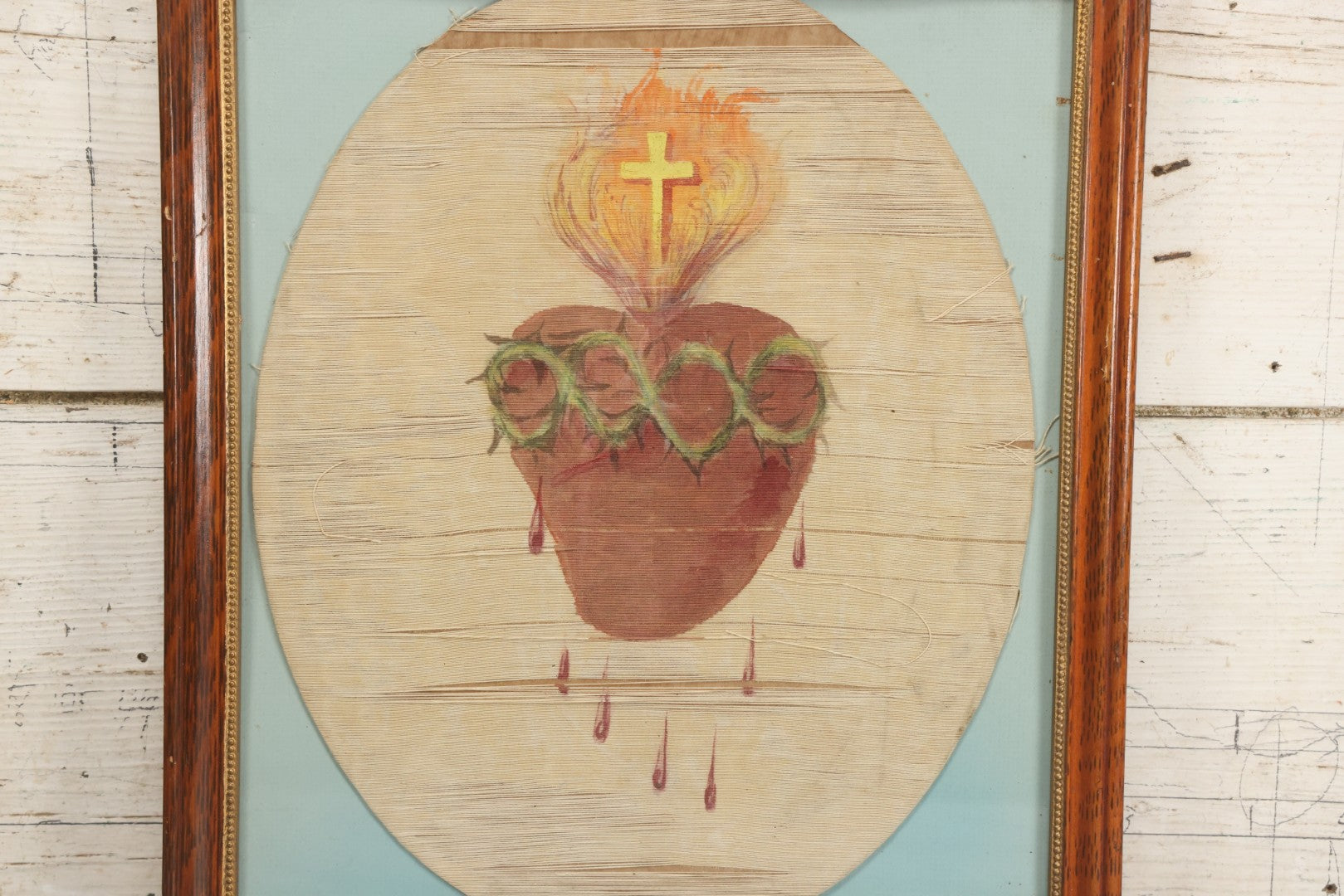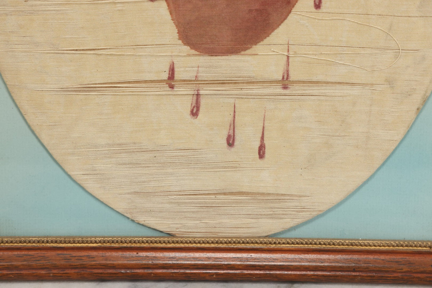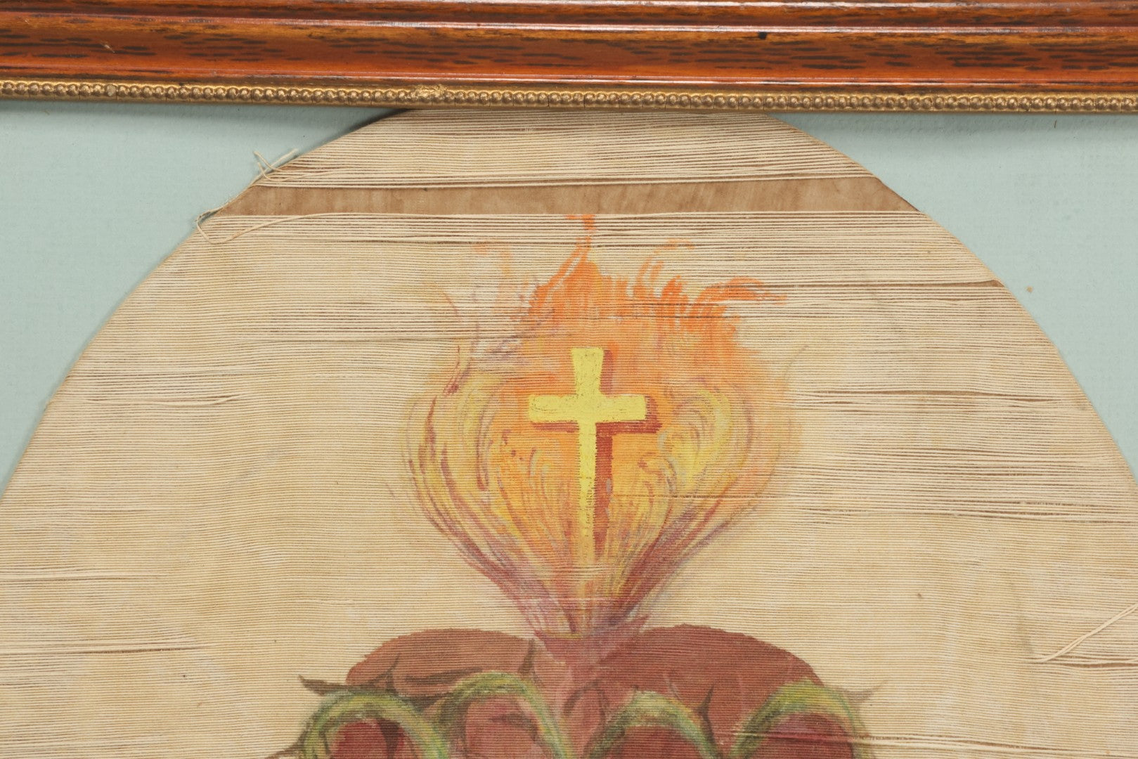 Lot 003 - Antique Hand Painted Sacred Heart On Thread, In Frame, Note Losses 13-1/2" x 15-1/2"