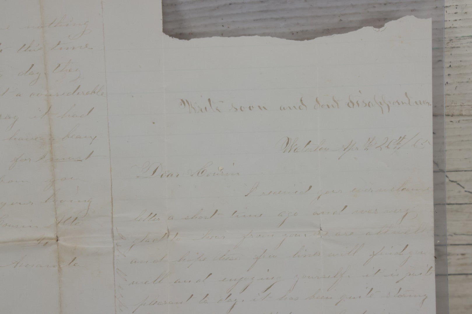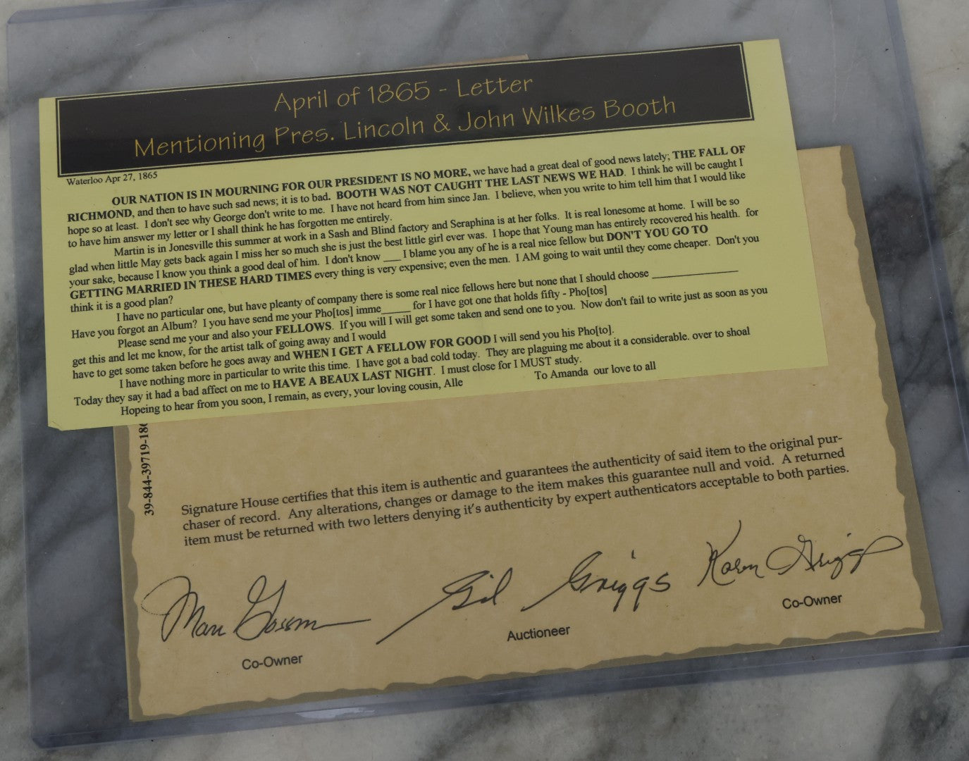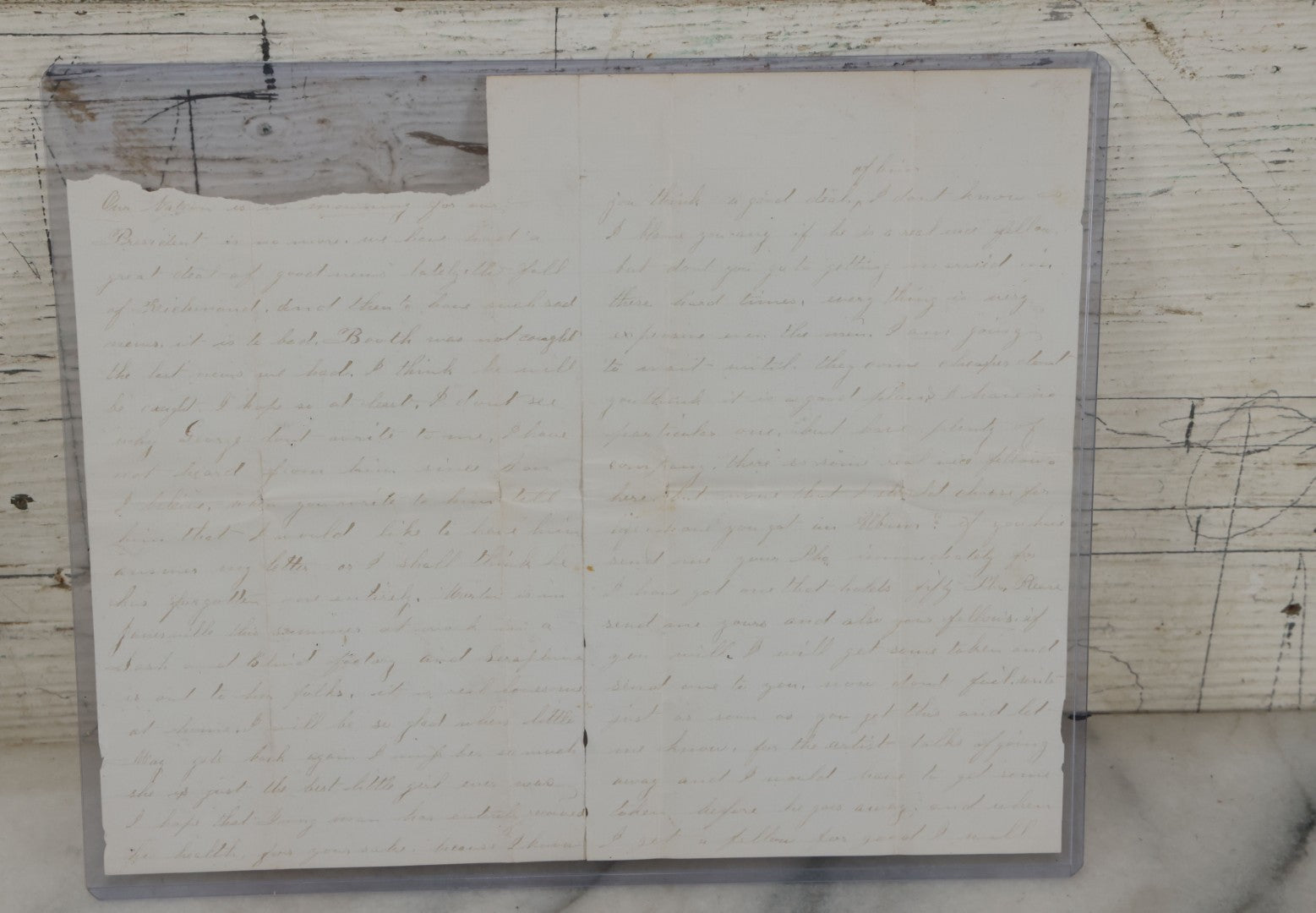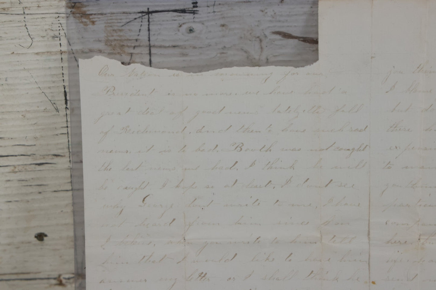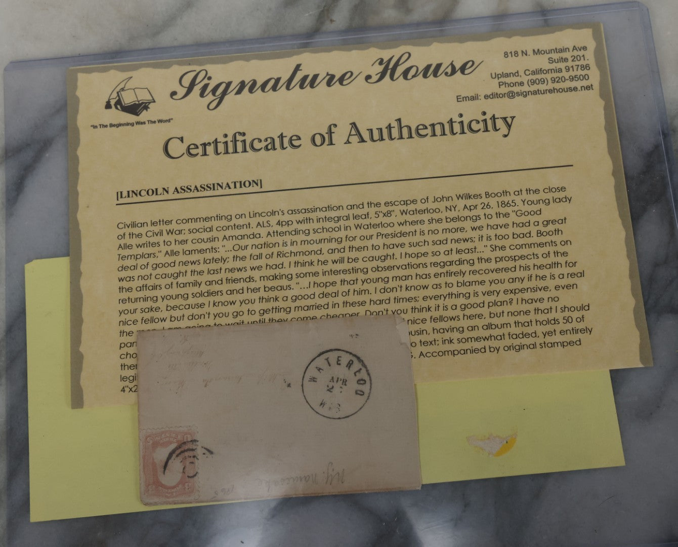 Lot 081 - Antique Handwritten Letter Dated April 26, 1865, Waterloo, New York, Mentioning The Assassination Of President Abraham Lincoln By John Wilkes Booth, With C.O.A. And Transcription, Note Loss To Upper Portion Of Paper, Includes Envelope