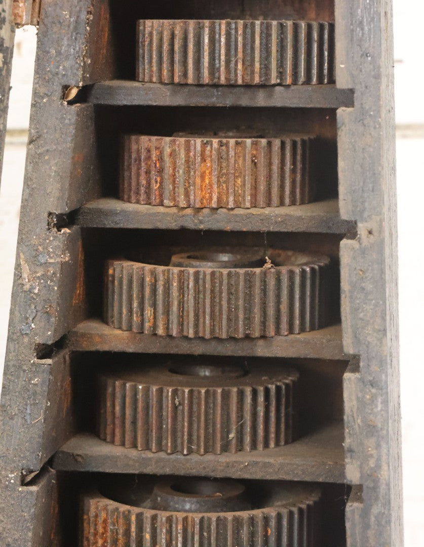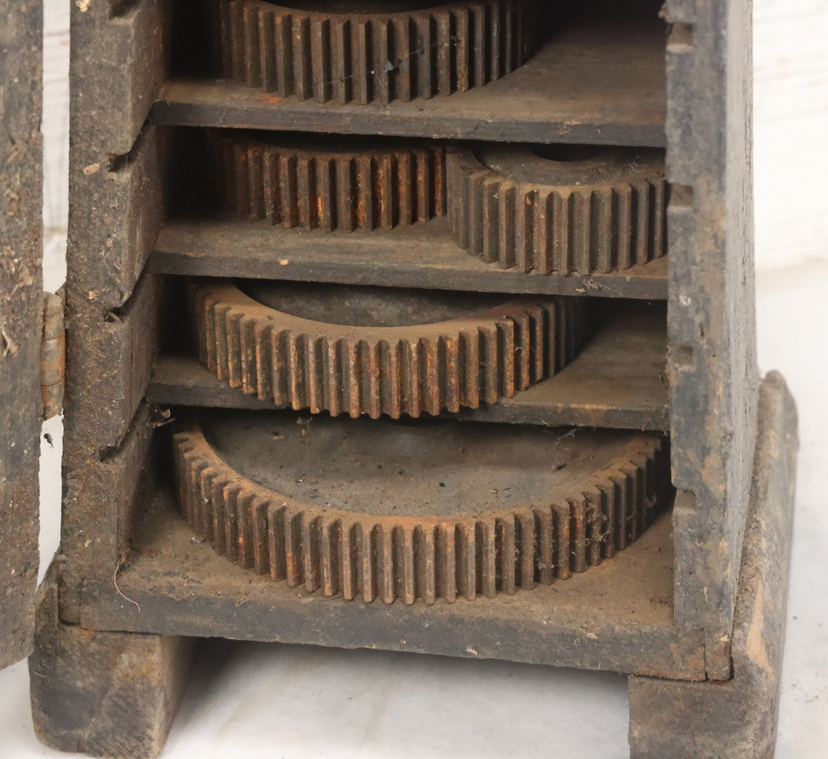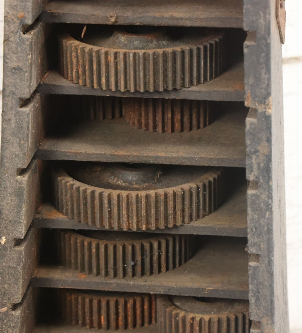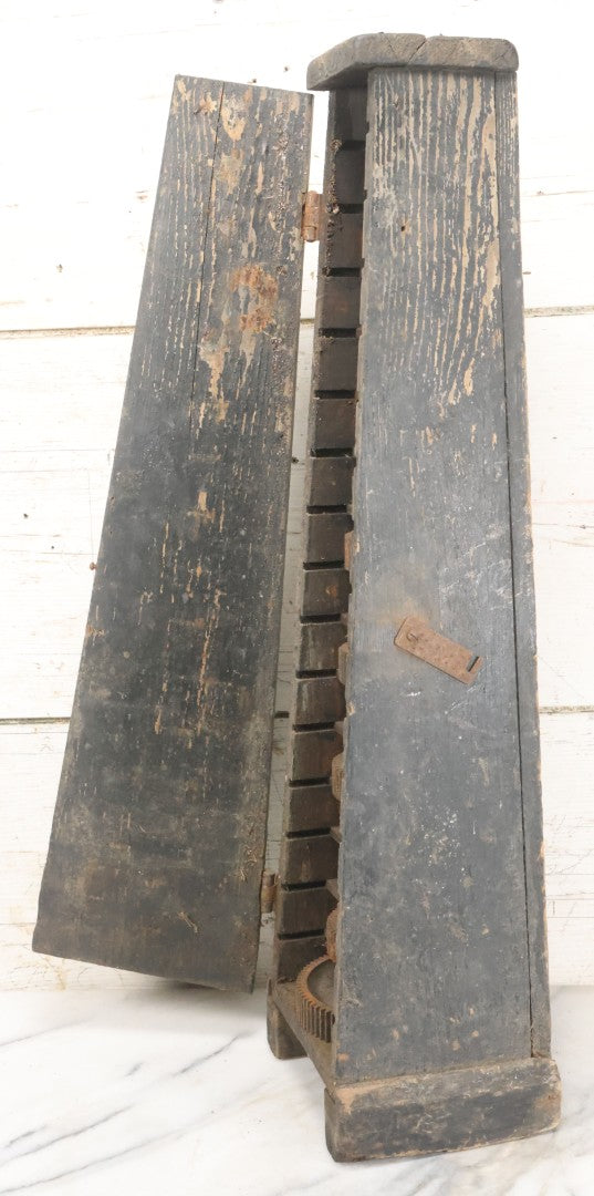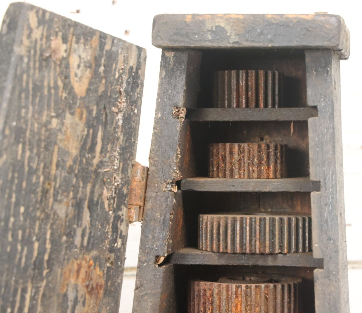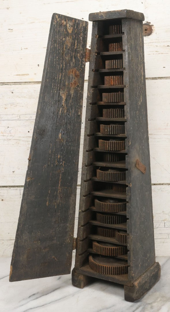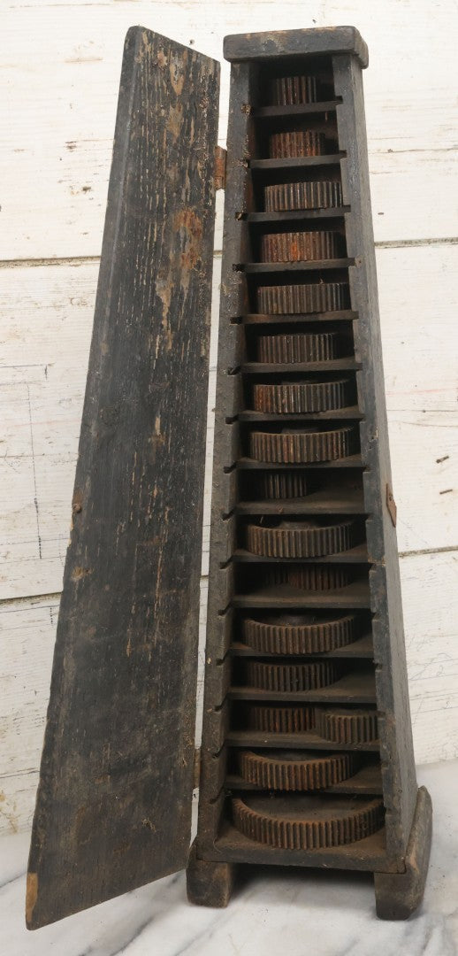 Lot 006 - Antique Industrial Salvage Decor Graduated Cast Iron Gear Tapered Wooden Storage Box, With Dividing Shelves And Contents, With Hinged Door, As Found, Dimensions In Description