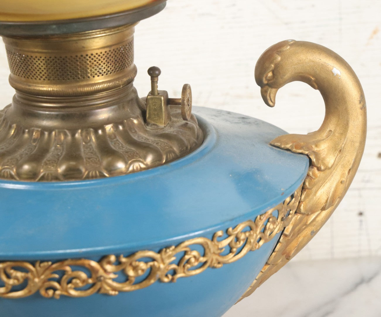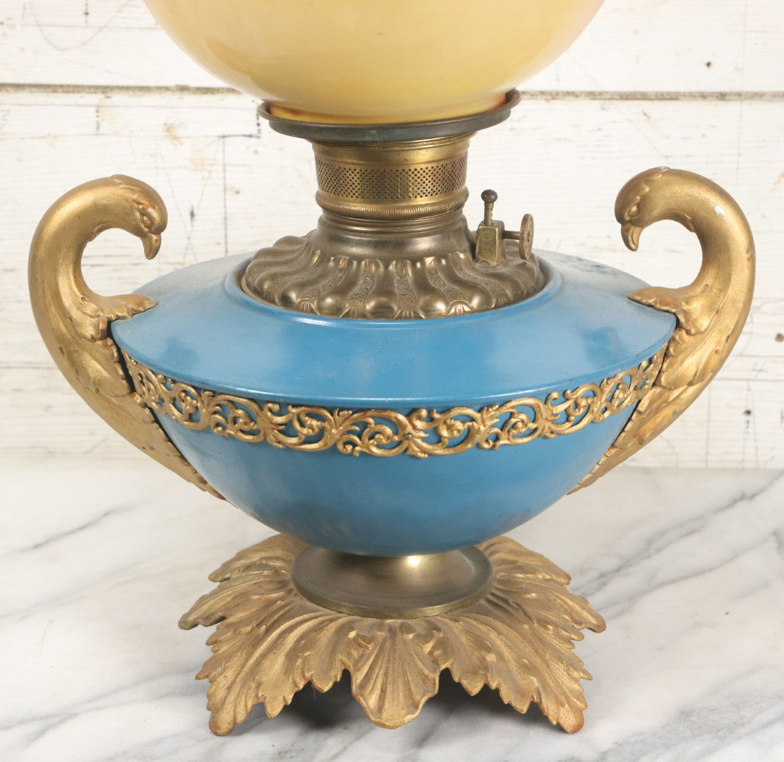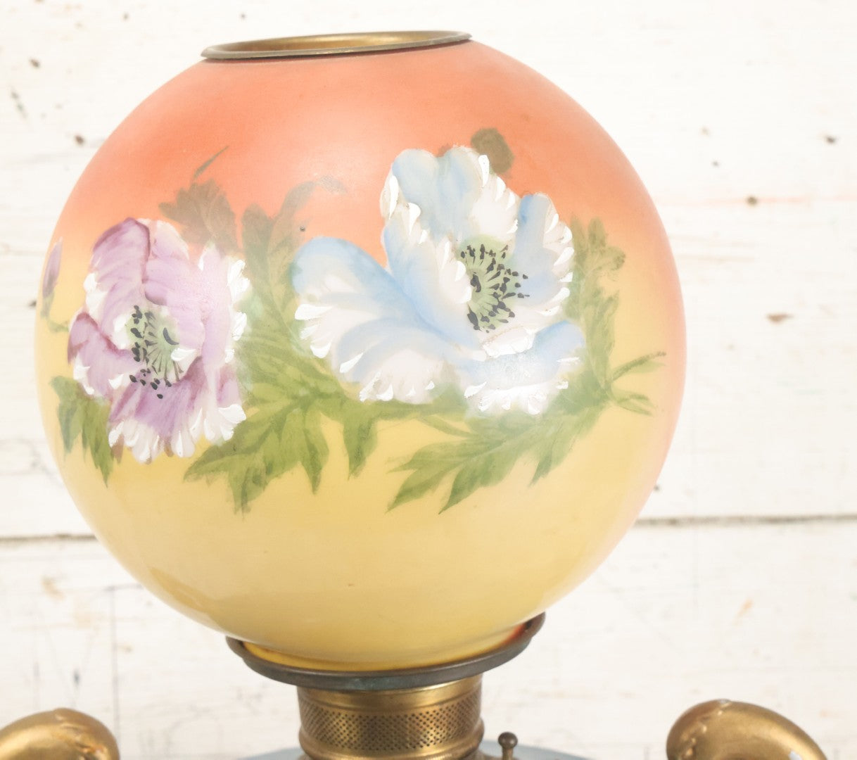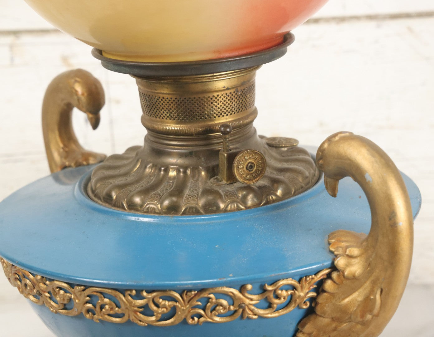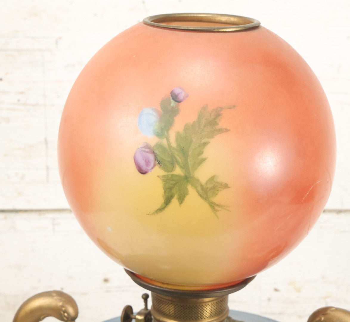 Lot 003 - Antique Kerosene Oil Lamp With Painted Blue Tin Font, Dove Head Motif, And Hand Painted Globe With Floral Motif By Pittsburgh Lamp And Brass, Made In America, Note Cracked And Repaired Section Of Globe, 19" High