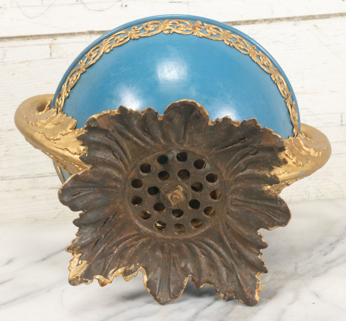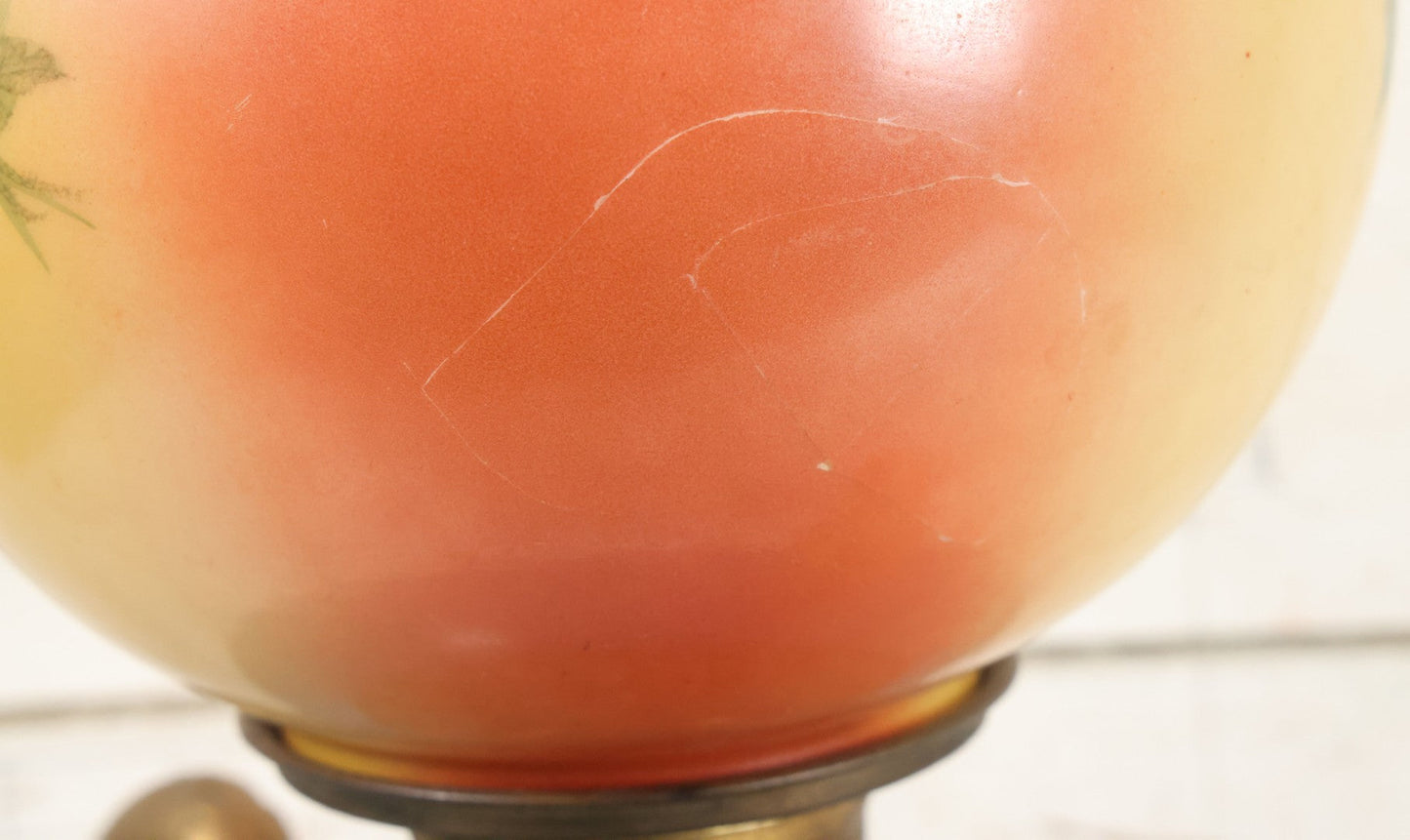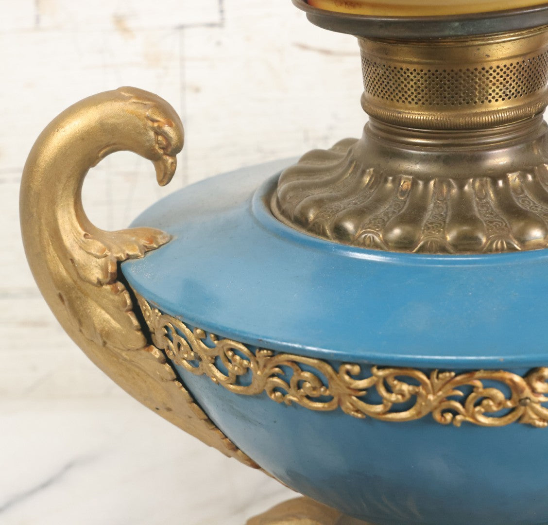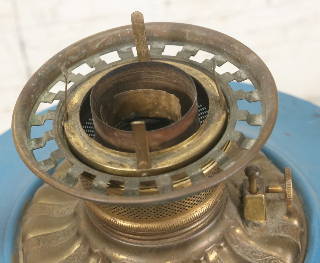 Lot 003 - Antique Kerosene Oil Lamp With Painted Blue Tin Font, Dove Head Motif, And Hand Painted Globe With Floral Motif By Pittsburgh Lamp And Brass, Made In America, Note Cracked And Repaired Section Of Globe, 19" High