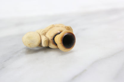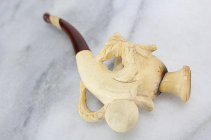Here is a great carved meerschaum pipe featuring a design with cherries (or other fruit) and feathers (or possibly leaves). It is in good used condition that shows a nice patina and some smoke marks from use. There is a crack at the end of the mouthpiece that someone has repaired with masking tape. It comes with a velvet lined case that is marked, "Warranted Genuine Meerschaum, EPW."