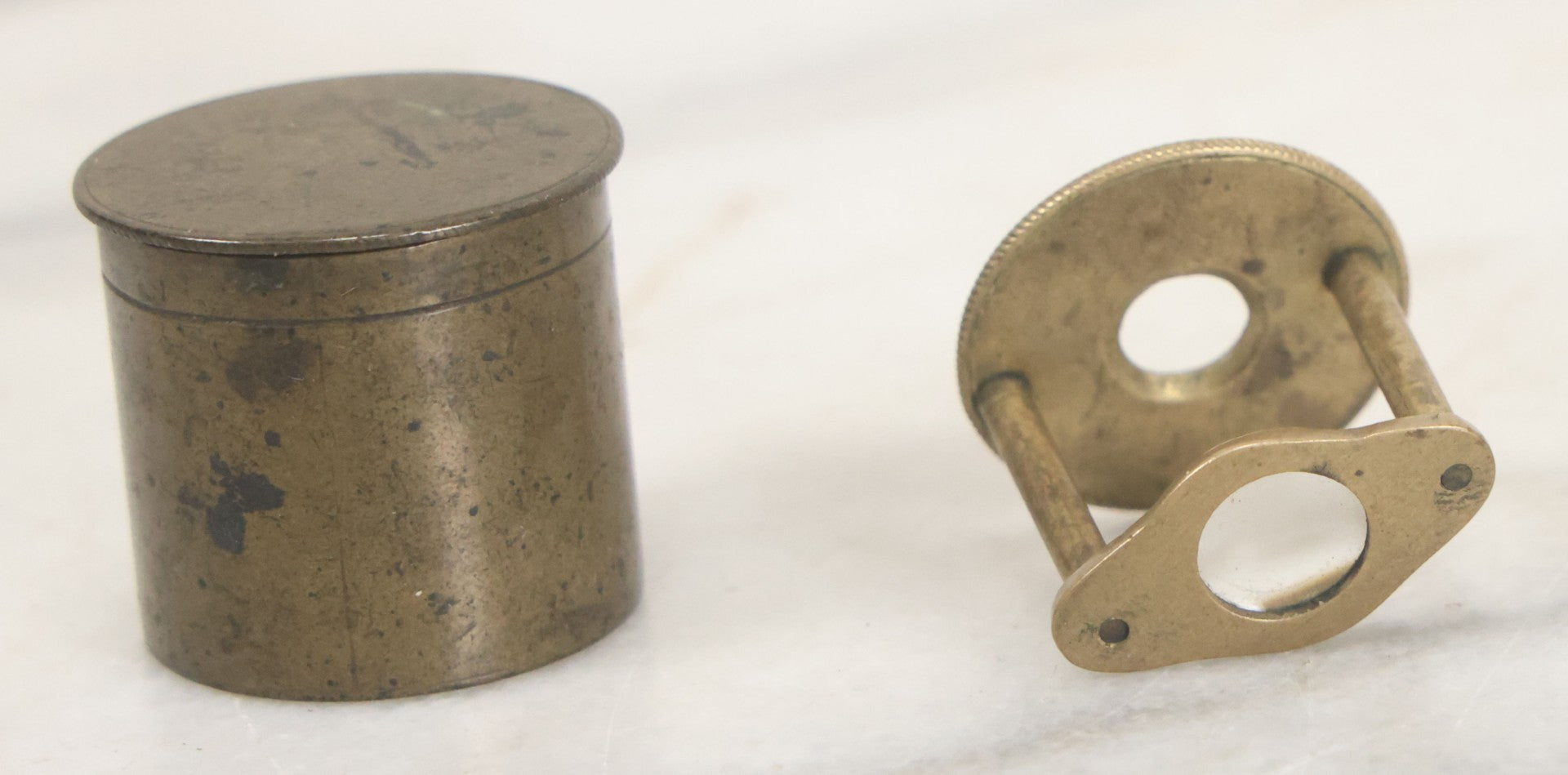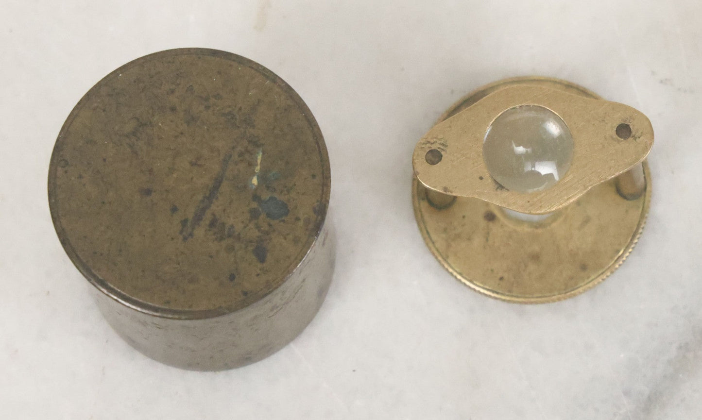 Your absentee bid for Lot 036 - Antique Miniature Brass Jewelers Loupe With Custom Brass Carrying Case, Note Some Warping To Hardware, Useable Condition was successfully submitted—thank you for bidding with us!