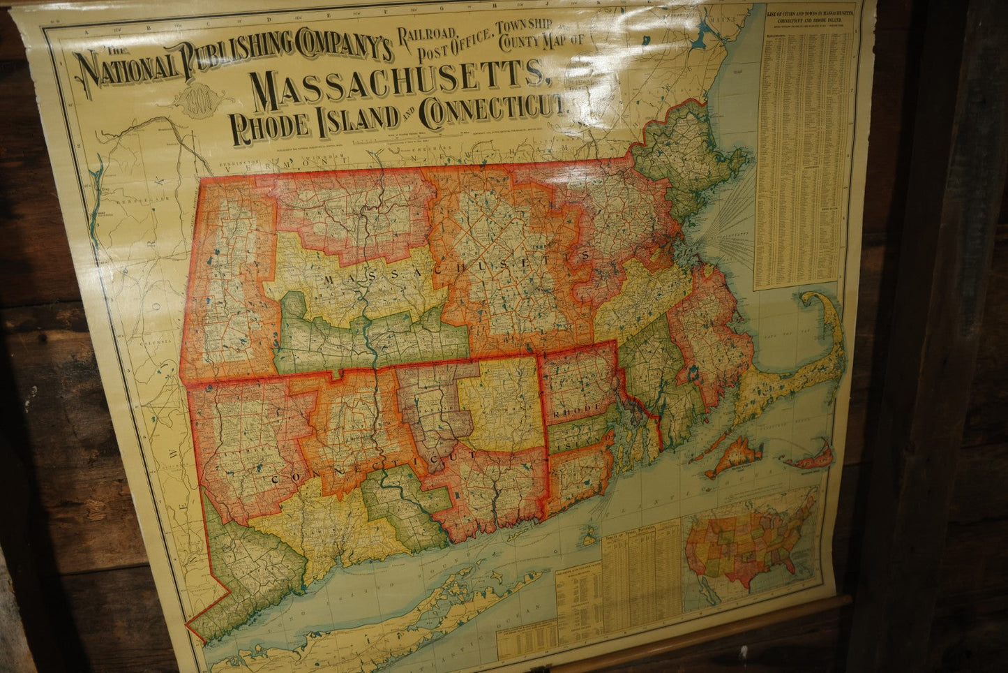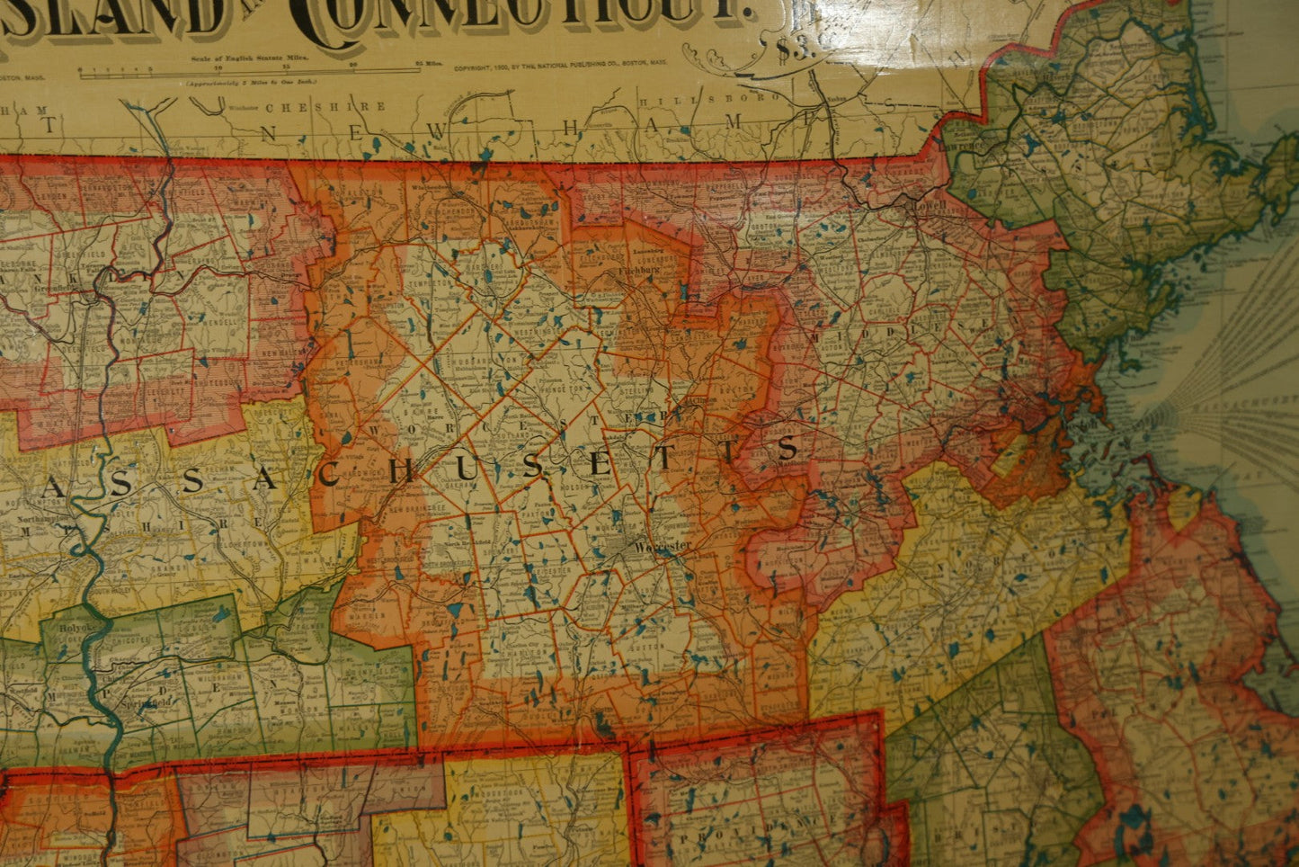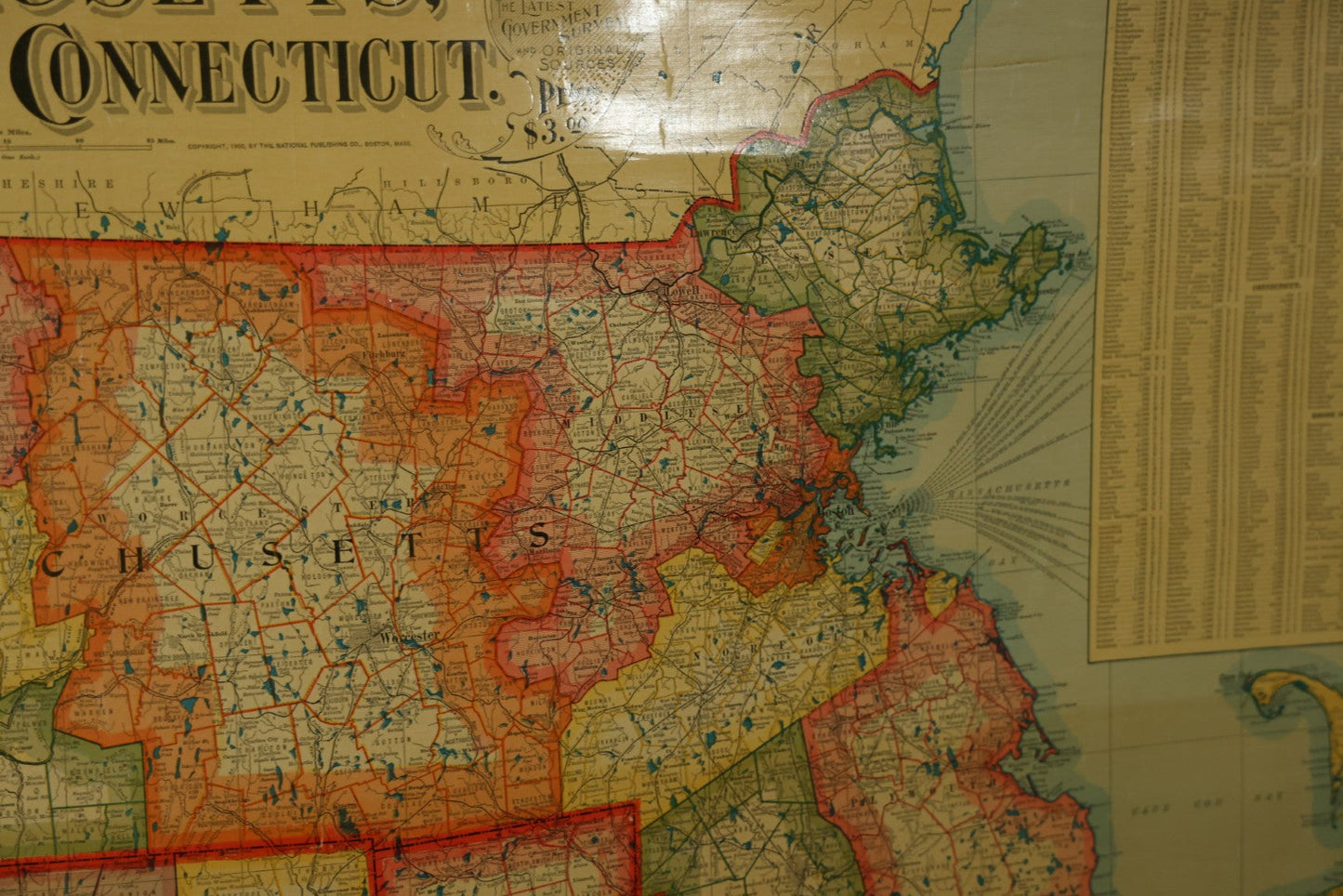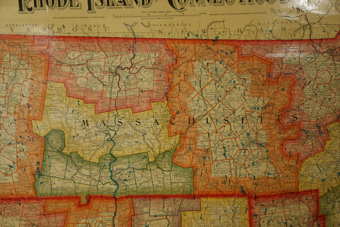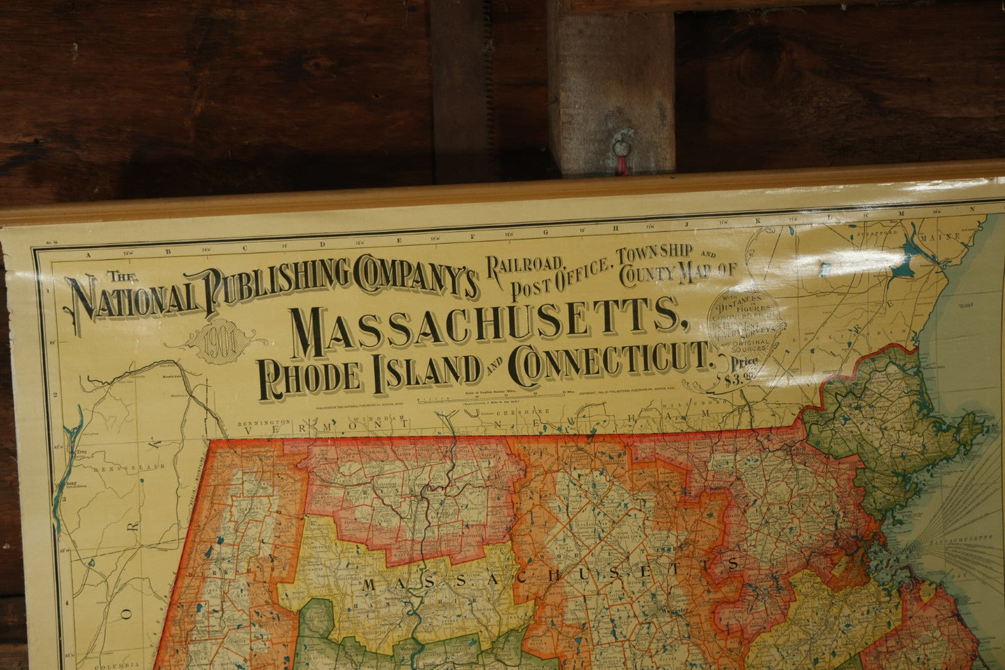 Antique National Publishing Company's Railroad, Post Office, Township And County Map Of Massachusetts, Rhode Island, And Connecticut For 1901, Roll Up Map, Copyright 1900 By The National Publishing Co., Boston, Massachusetts, 38-3/4" x 36"