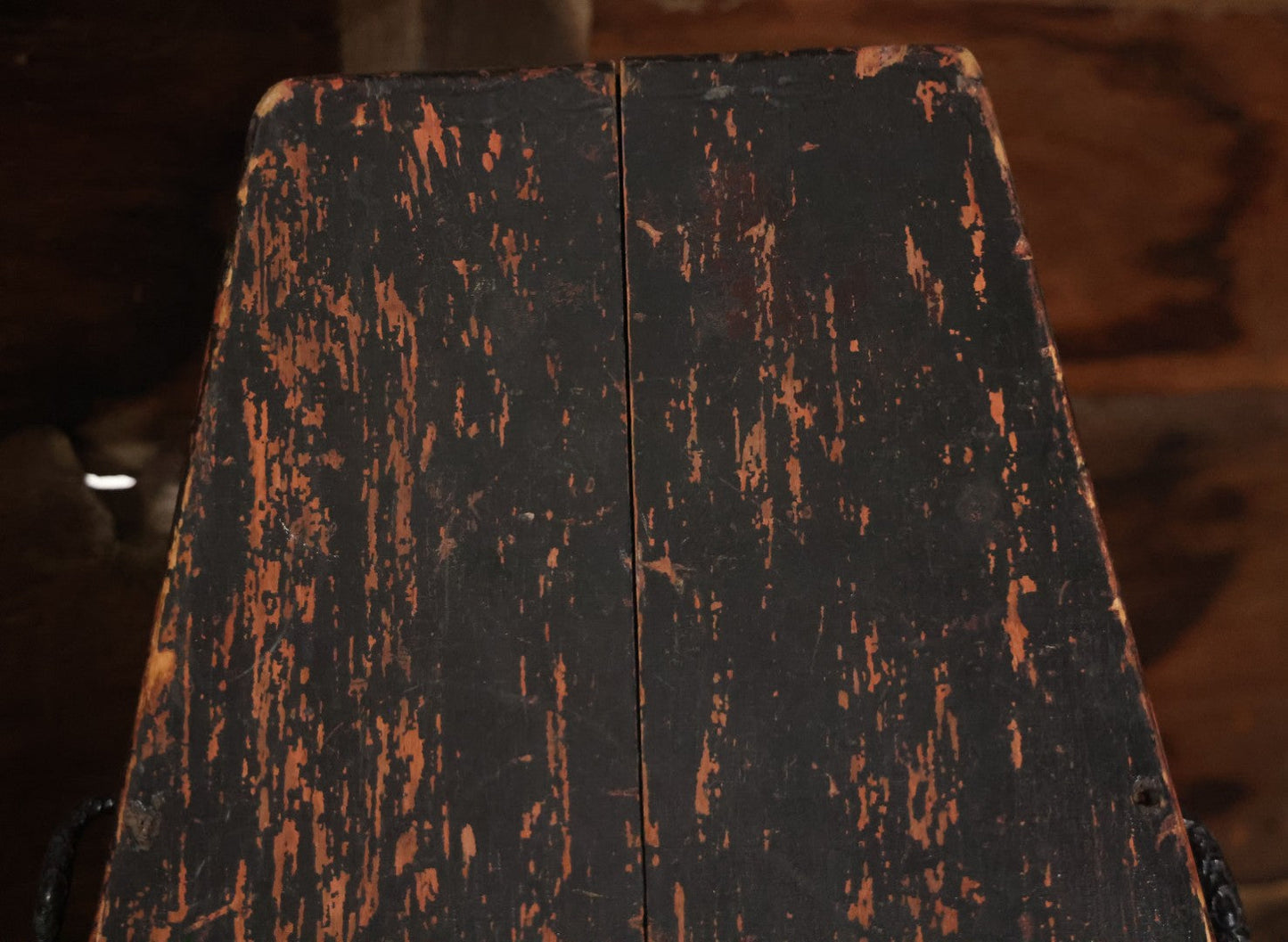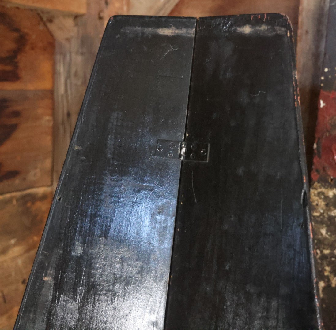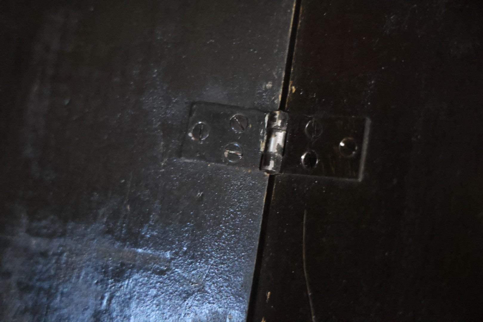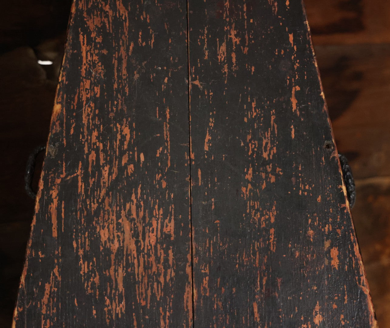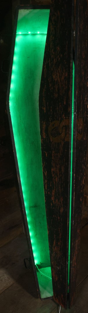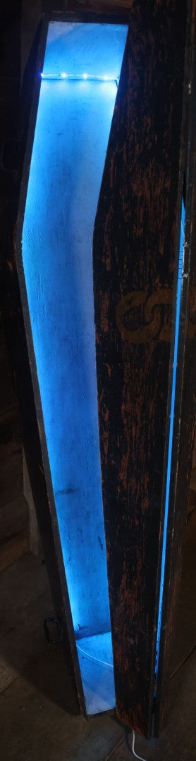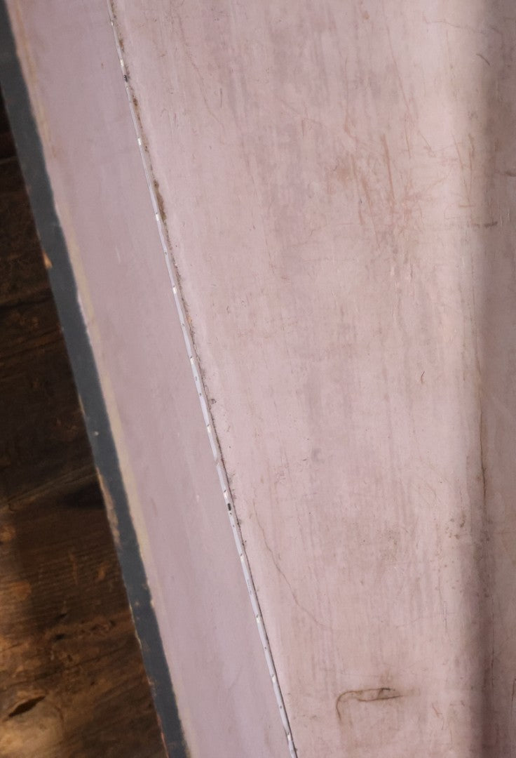 As found, paint wear throughout for a nice patinated surface. Previous owner added interior LED lights, part of which do not work. These can be easily removed. Door is hinged at center, so it can fold in half.
