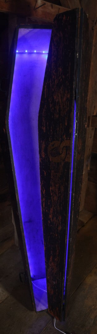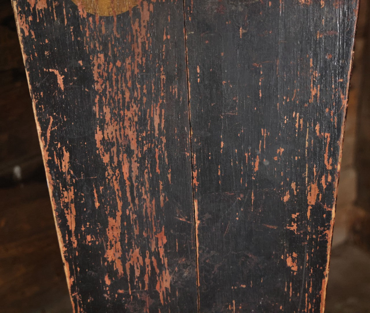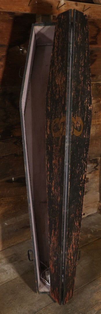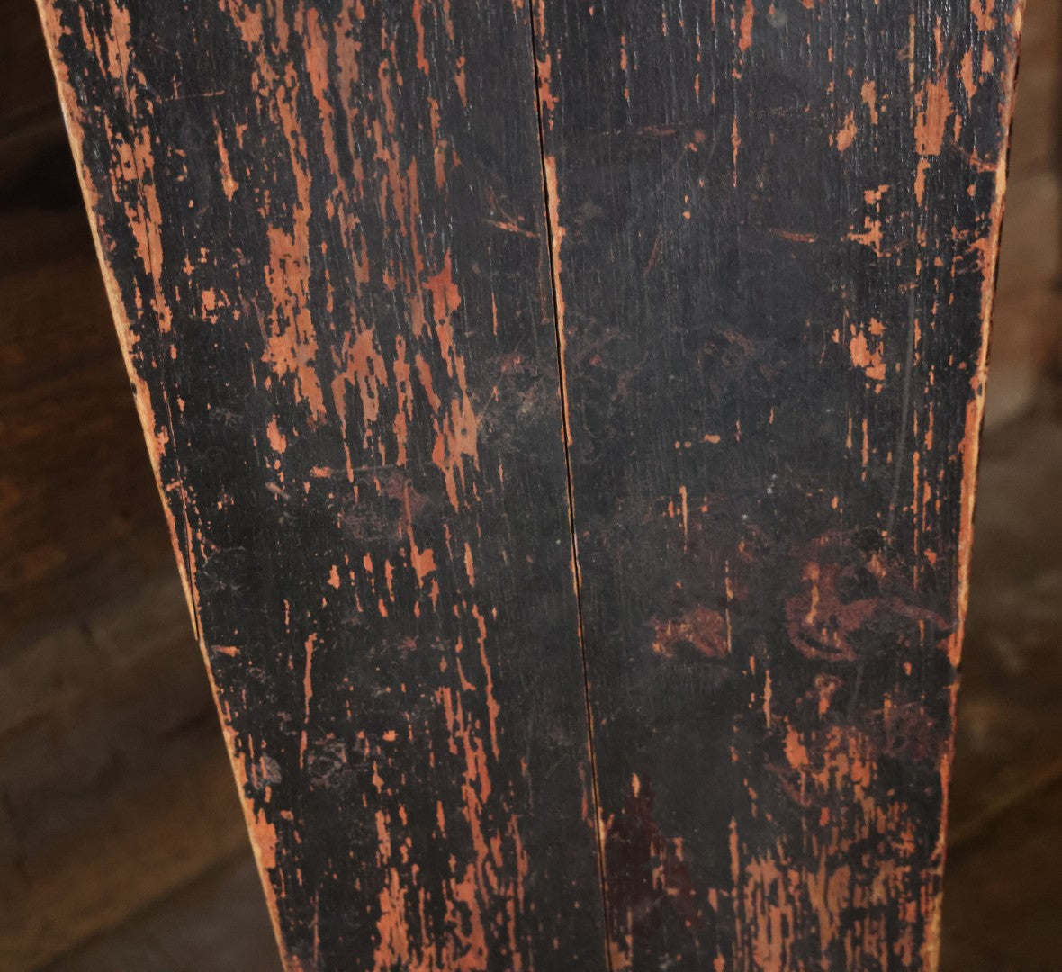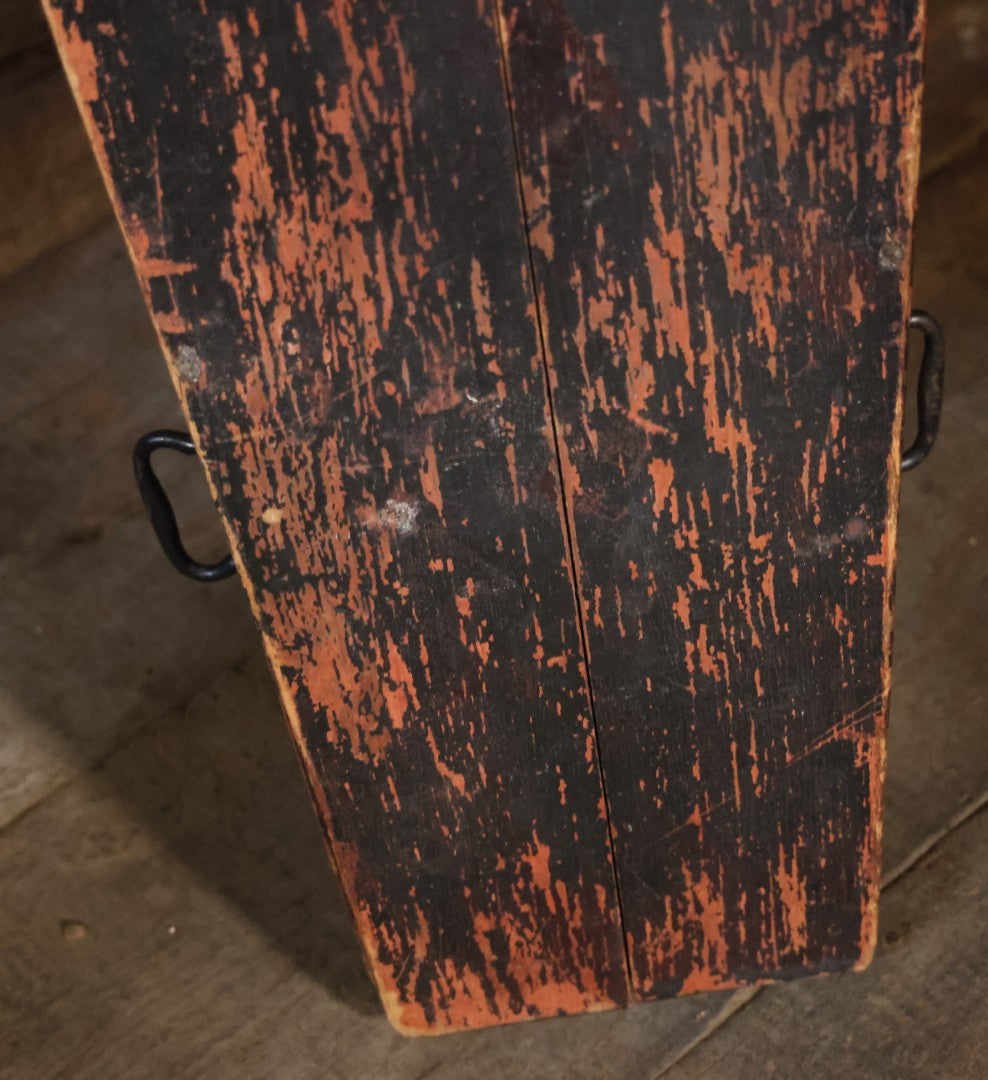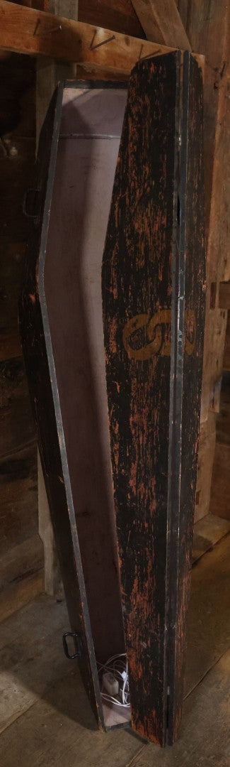 As found, paint wear throughout for a nice patinated surface. Previous owner added interior LED lights, part of which do not work. These can be easily removed. Door is hinged at center, so it can fold in half.