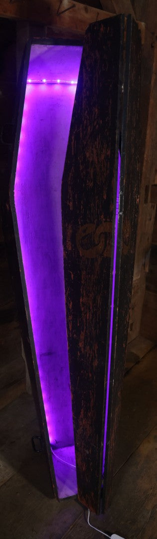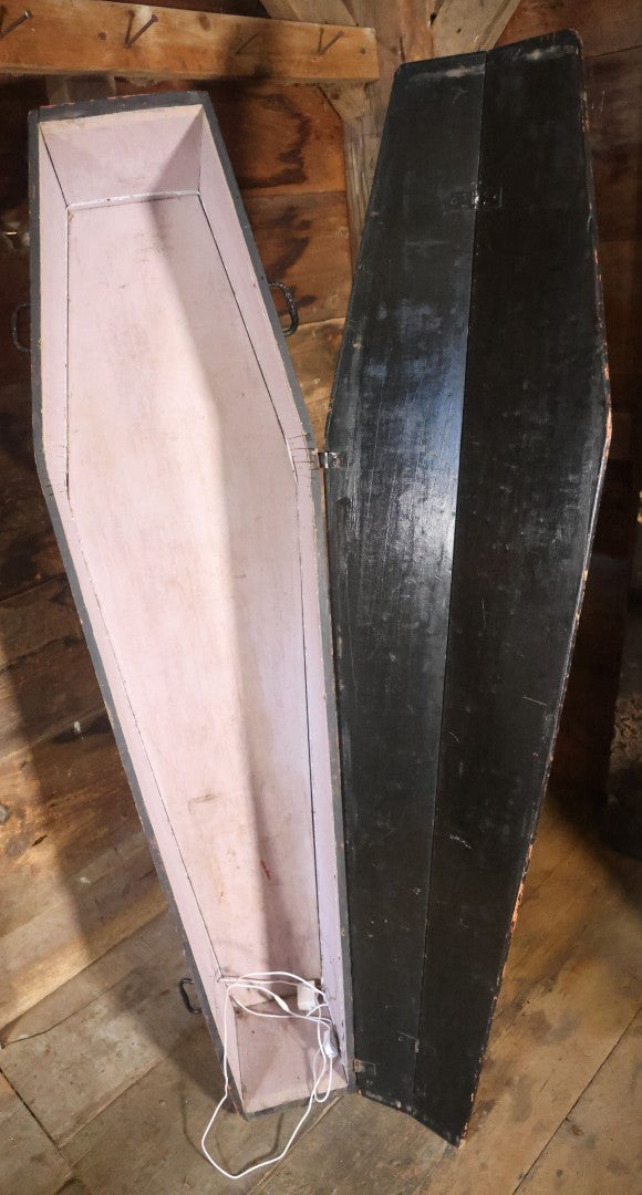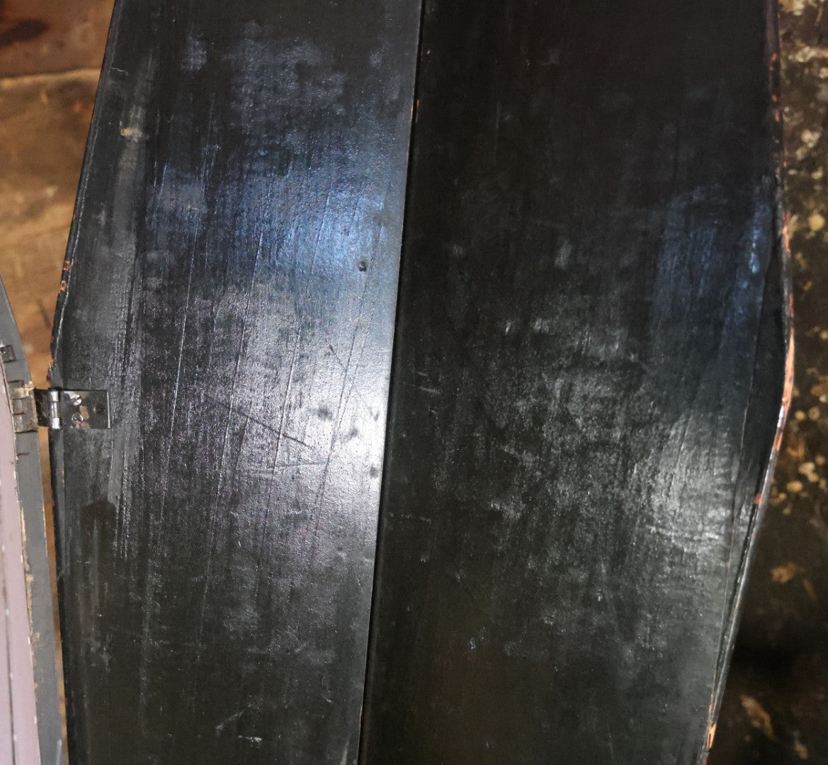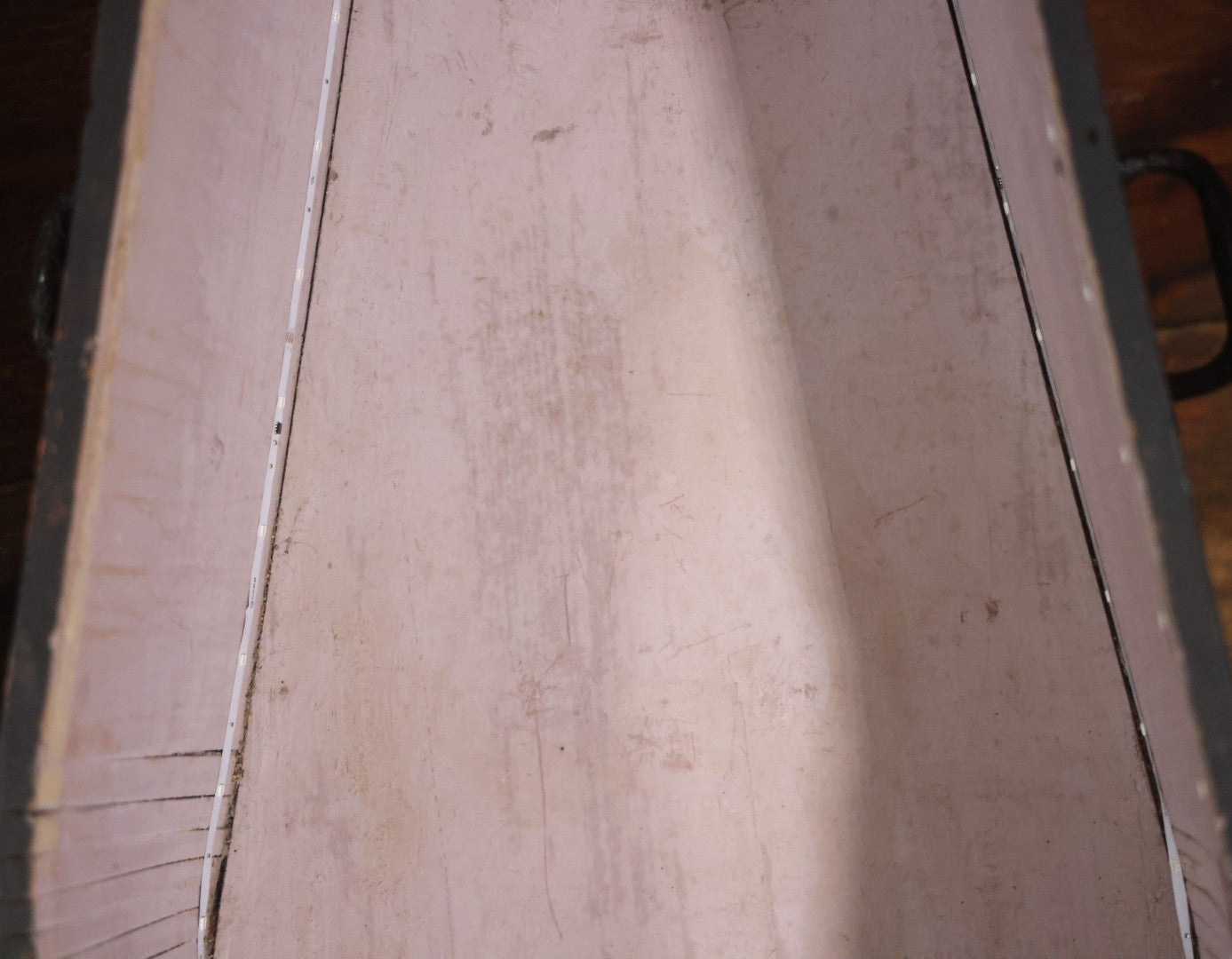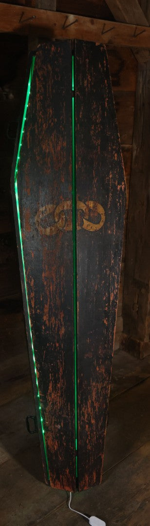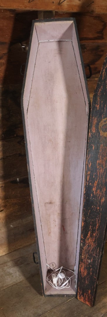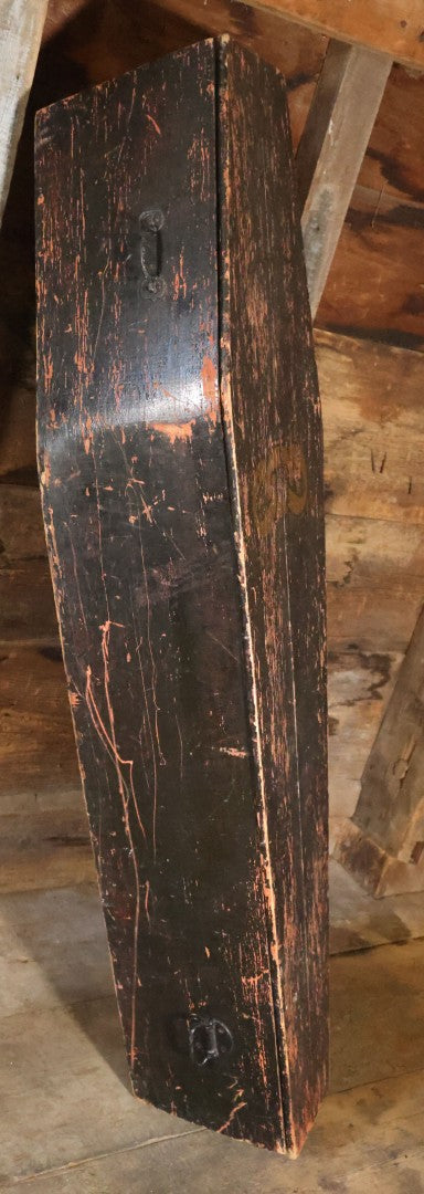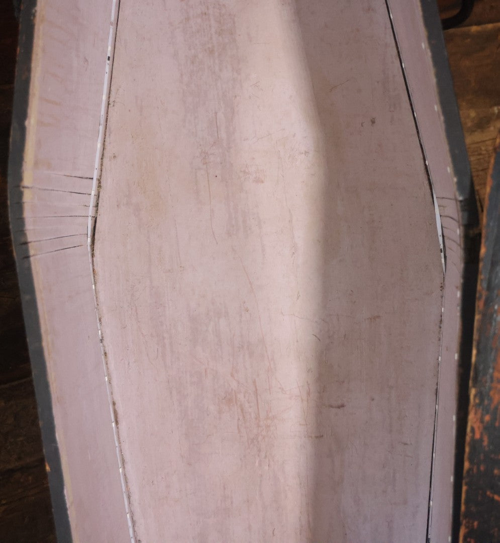 As found, paint wear throughout for a nice patinated surface. Previous owner added interior LED lights, part of which do not work. These can be easily removed. Door is hinged at center, so it can fold in half.