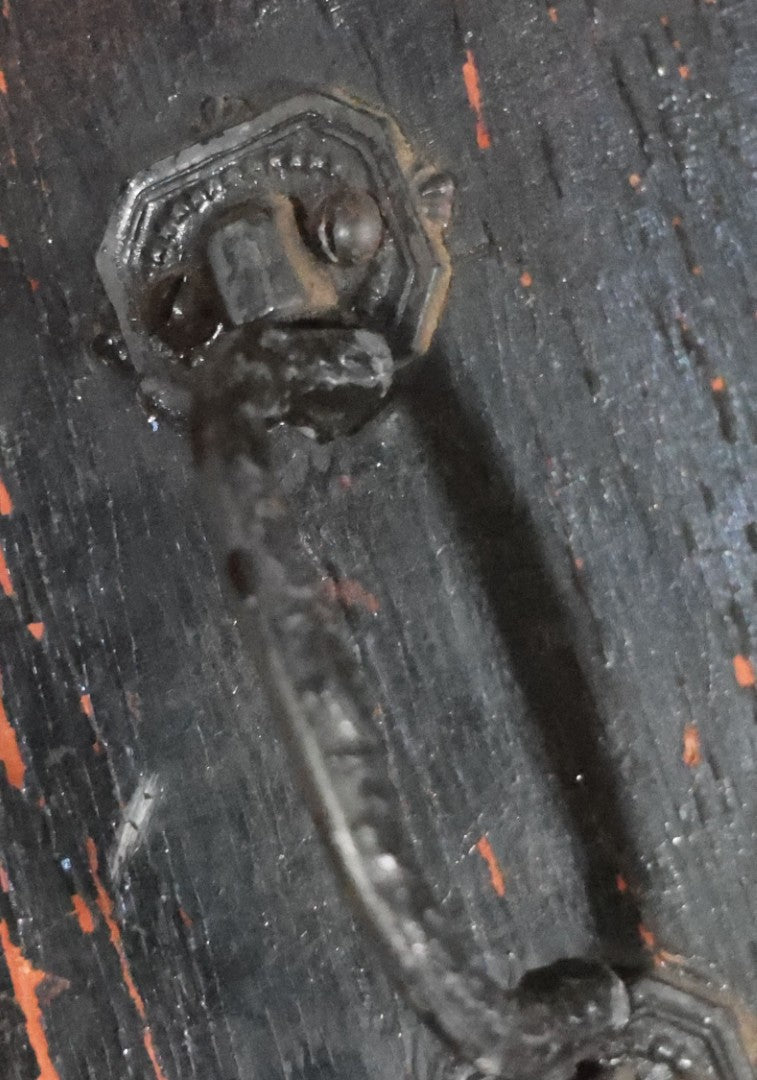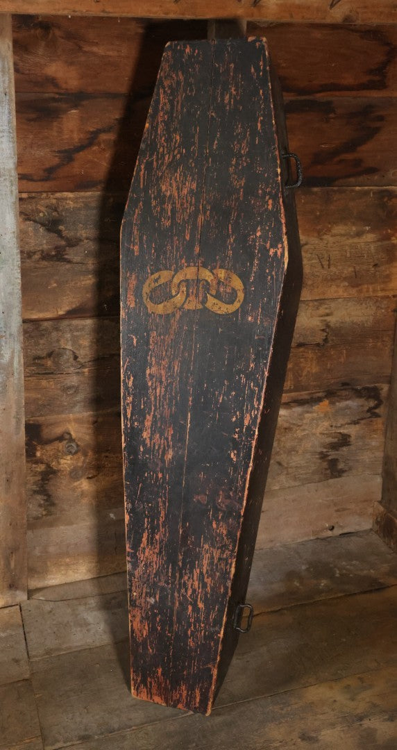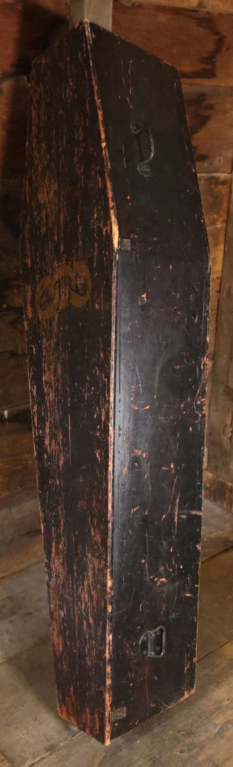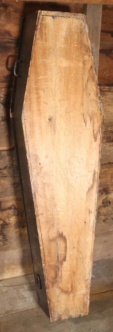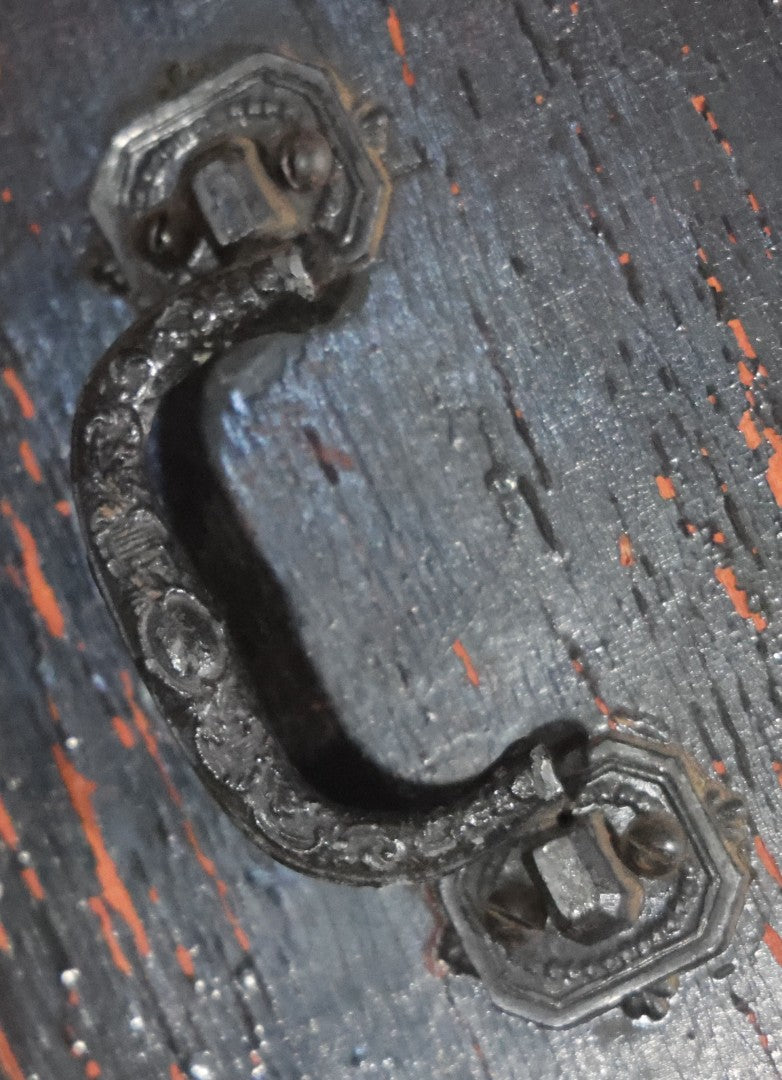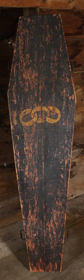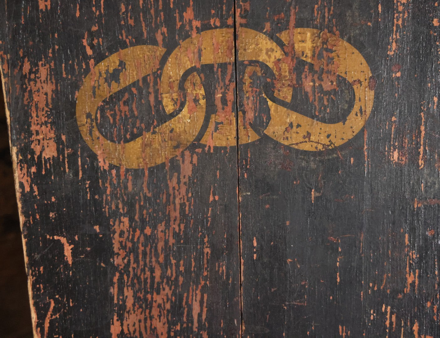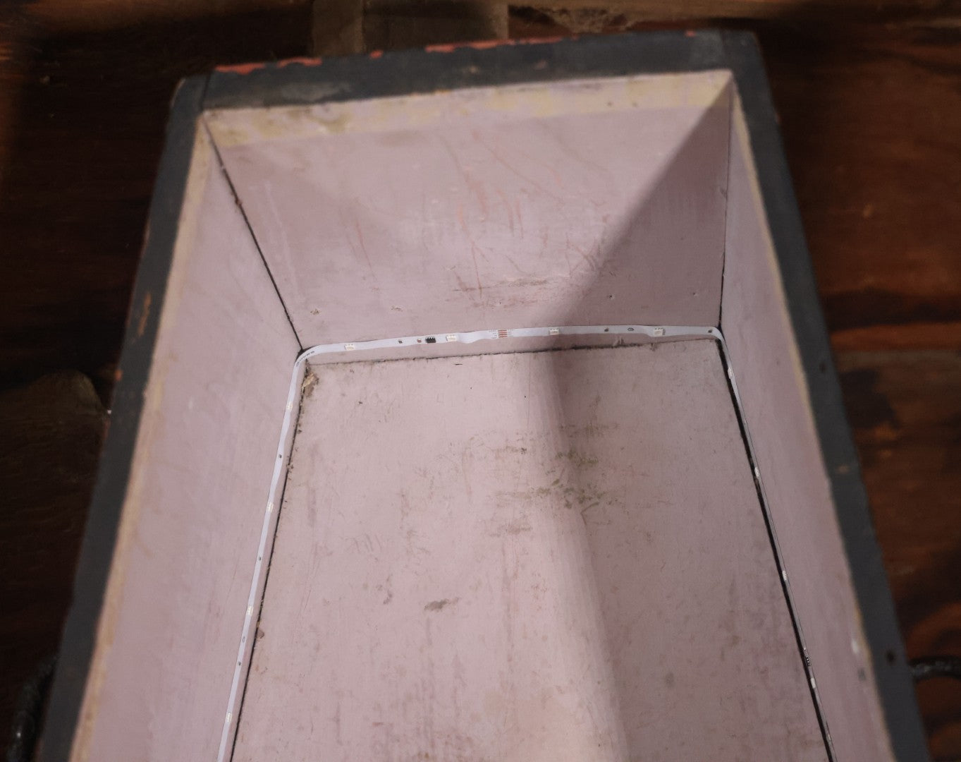 As found, paint wear throughout for a nice patinated surface. Previous owner added interior LED lights, part of which do not work. These can be easily removed. Door is hinged at center, so it can fold in half.