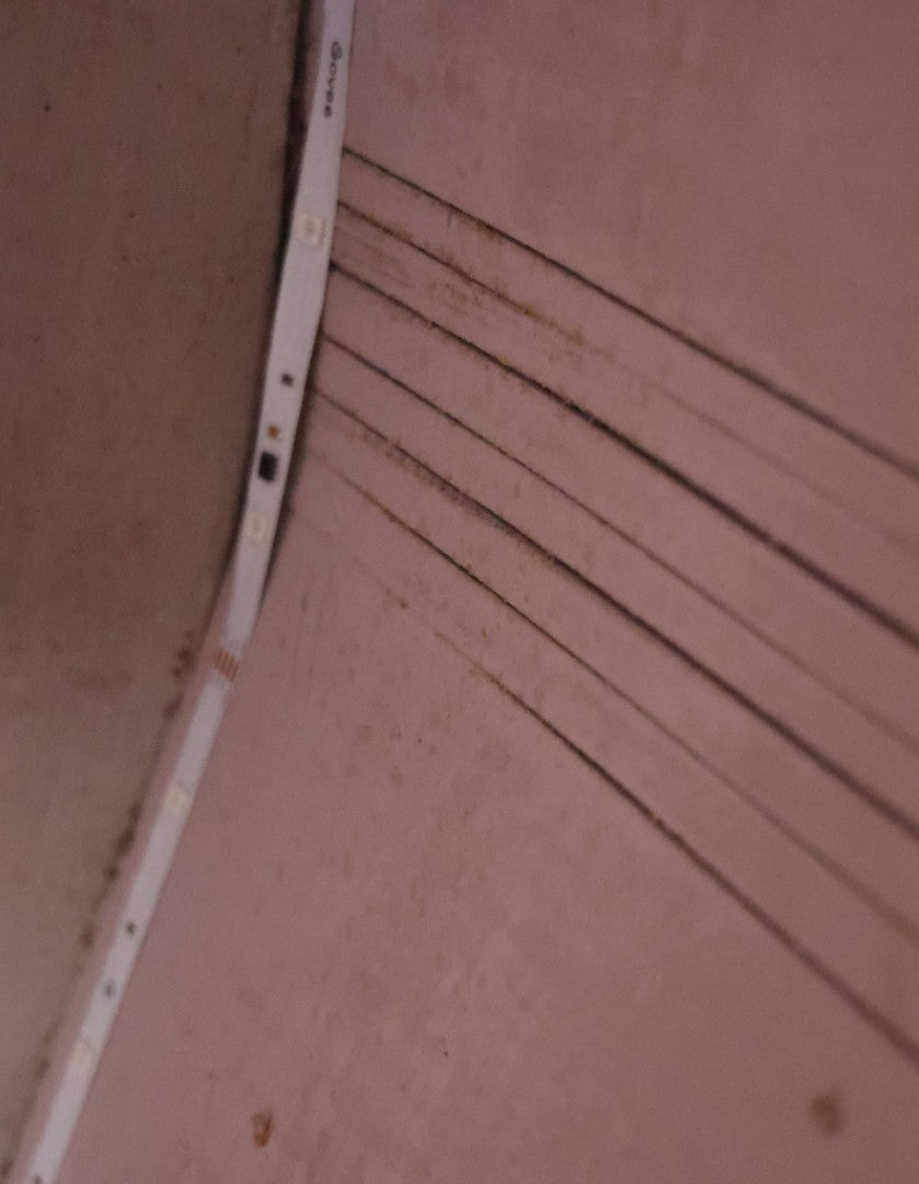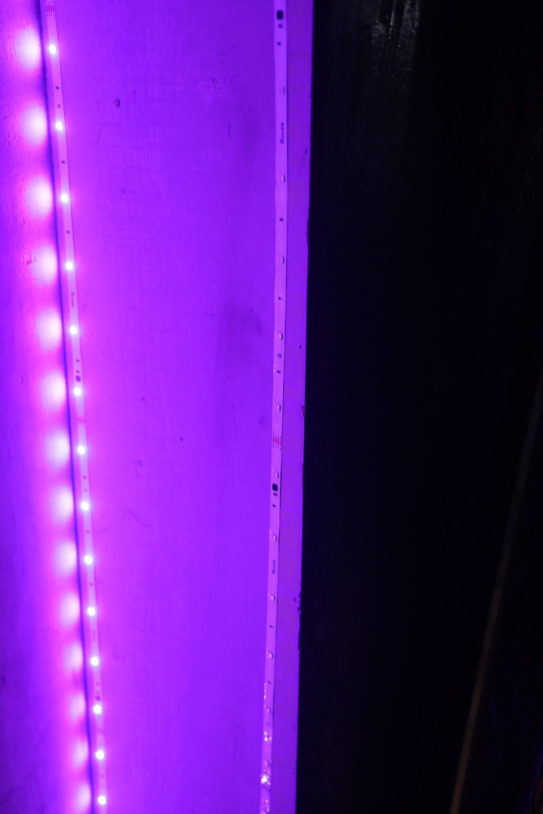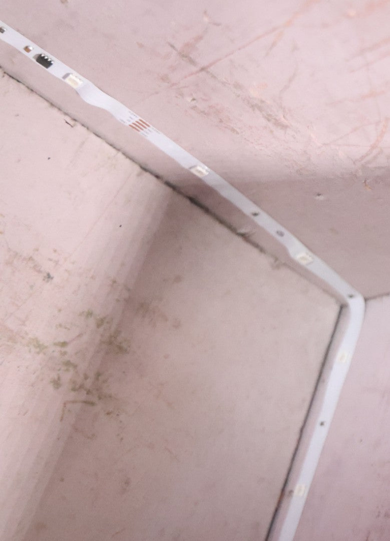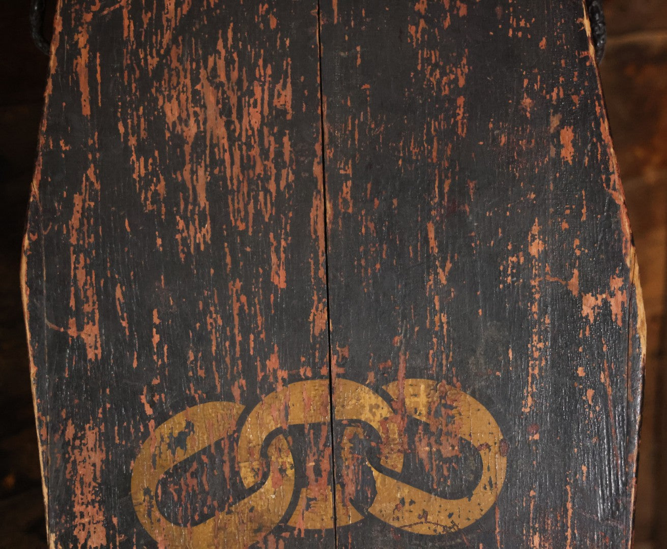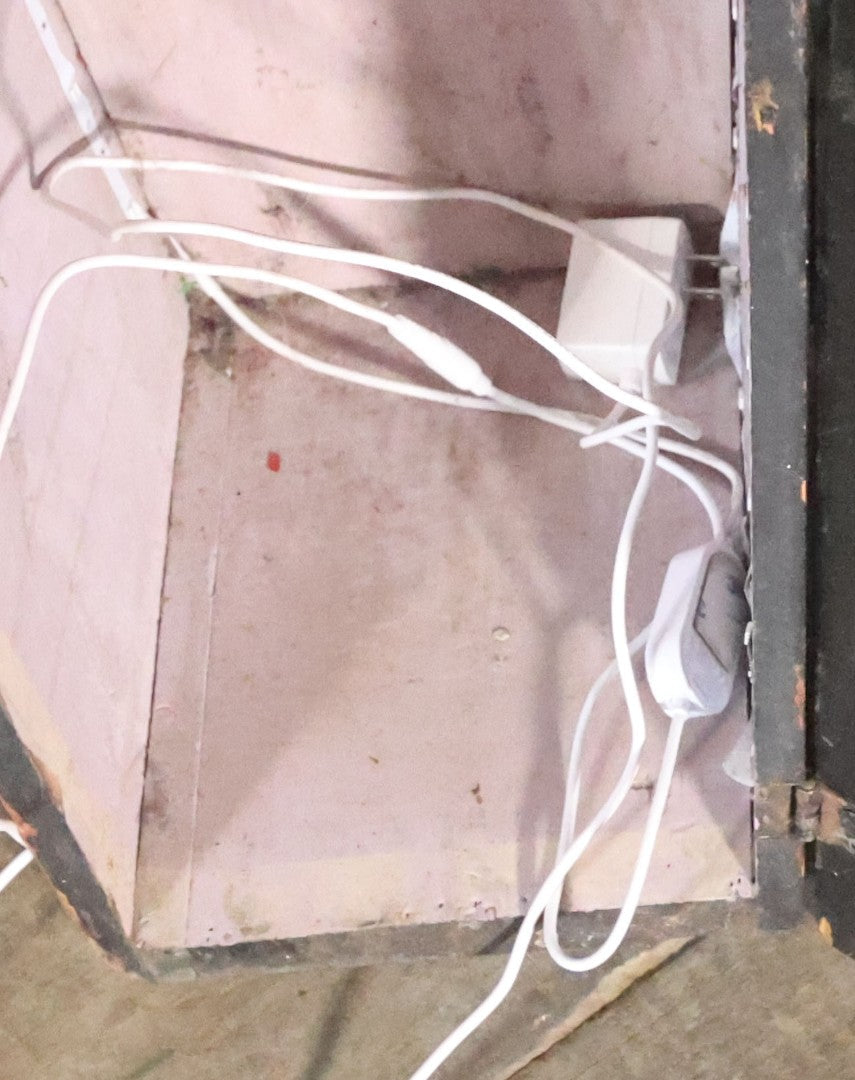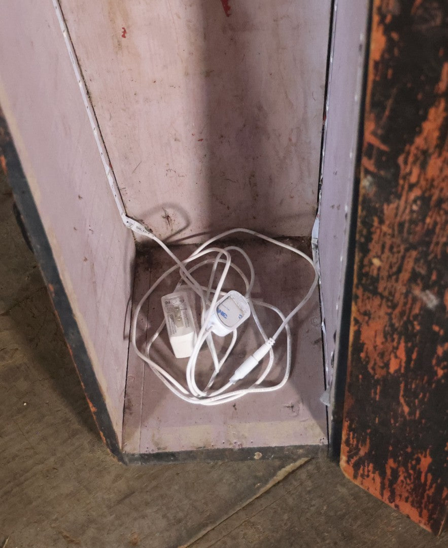As found, paint wear throughout for a nice patinated surface. Previous owner added interior LED lights, part of which do not work. These can be easily removed. Door is hinged at center, so it can fold in half.