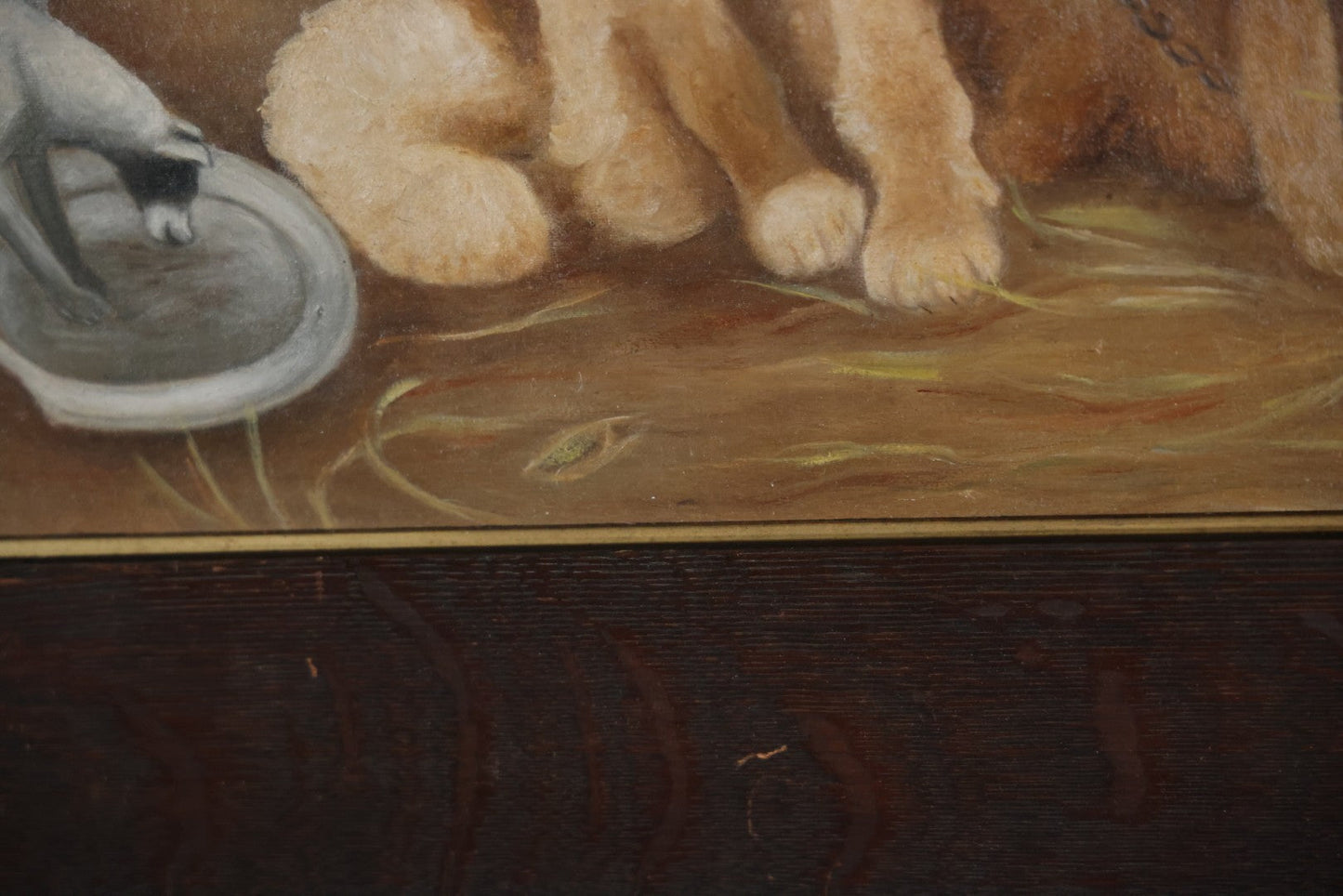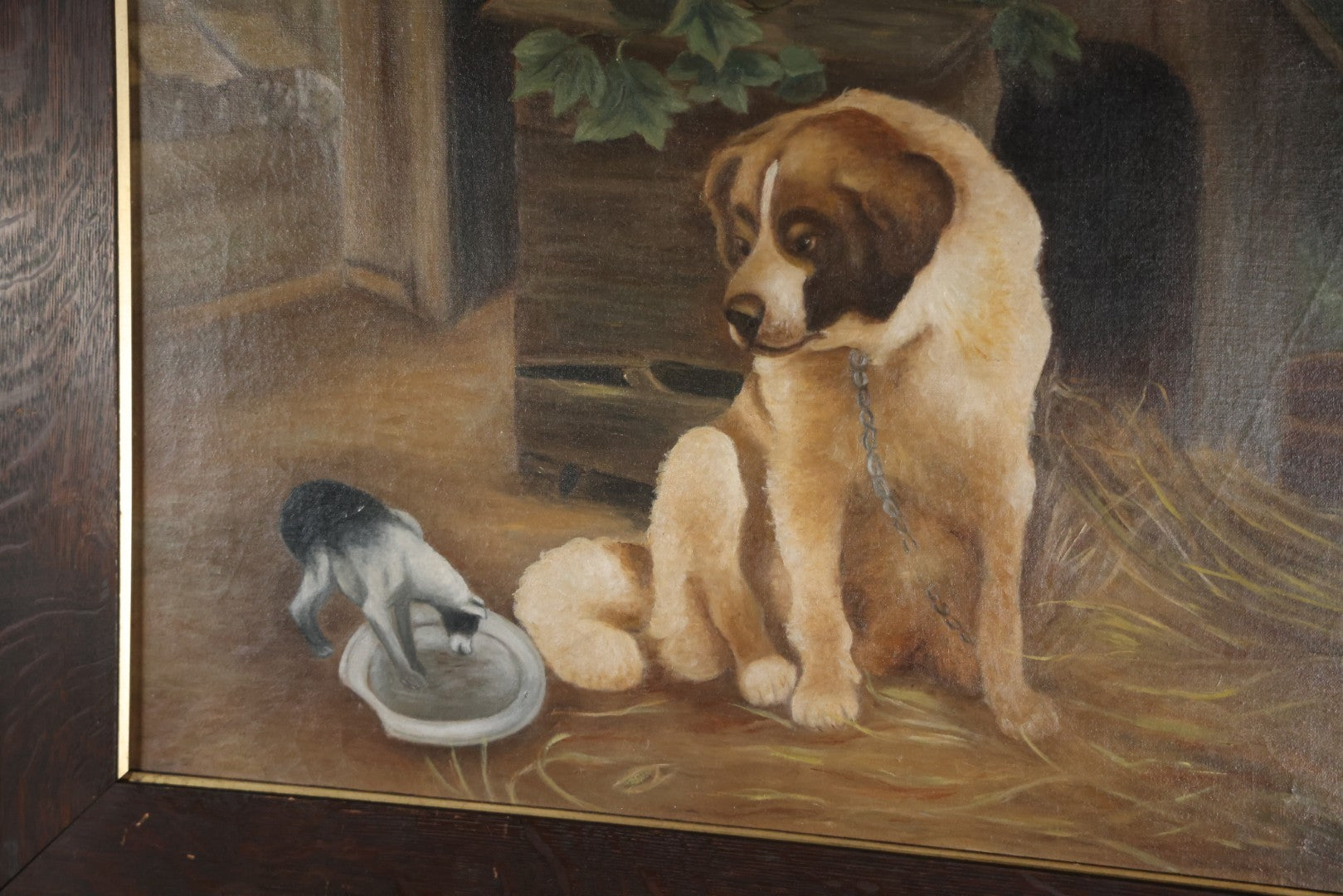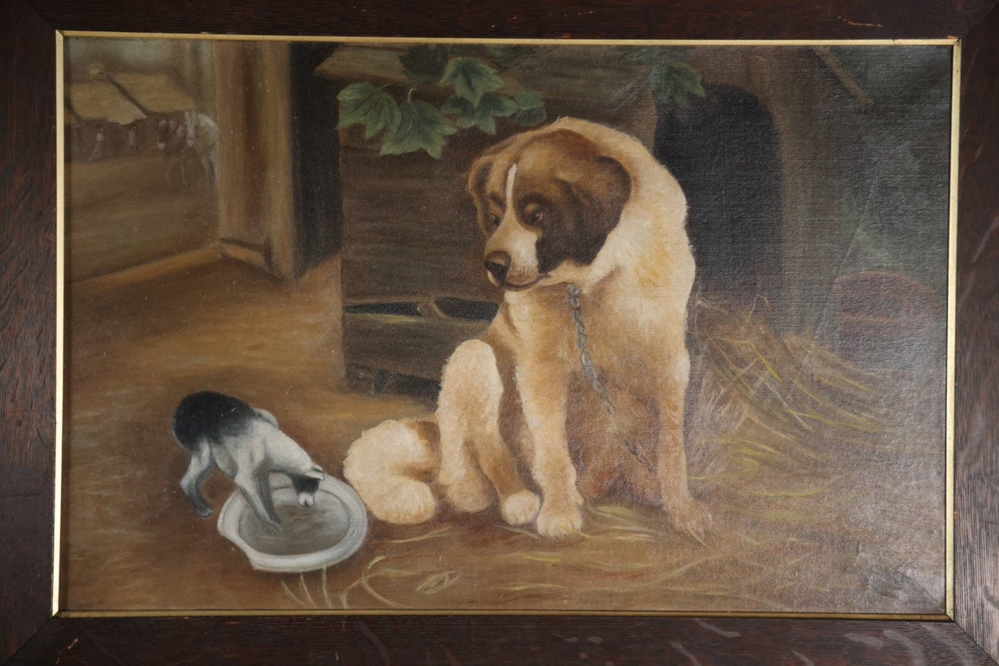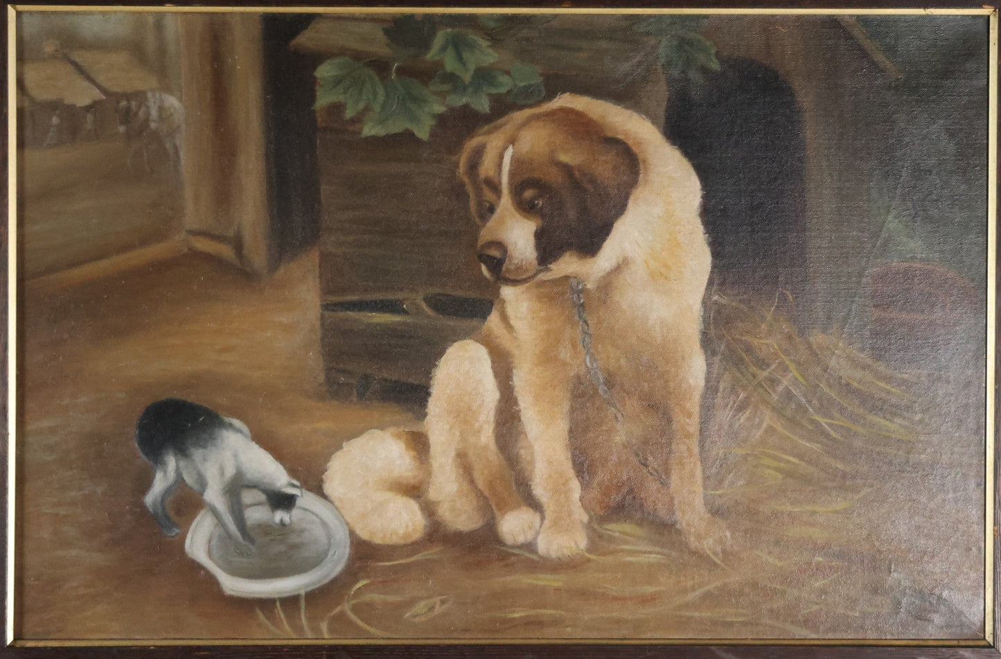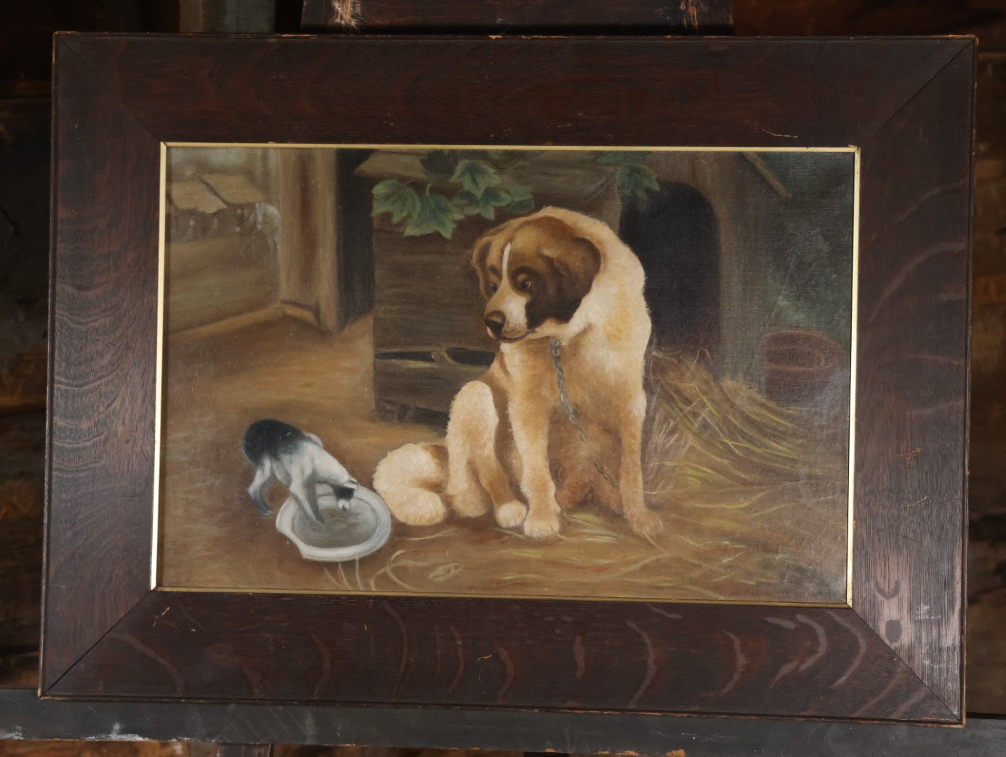 Antique Oil On Canvas Painting Of A Large Saint Bernard Dog Sharing A Saucer Of Water With A Small Gray Cat, On A Farm, Horses In Background, In Frame, 28" x 30"