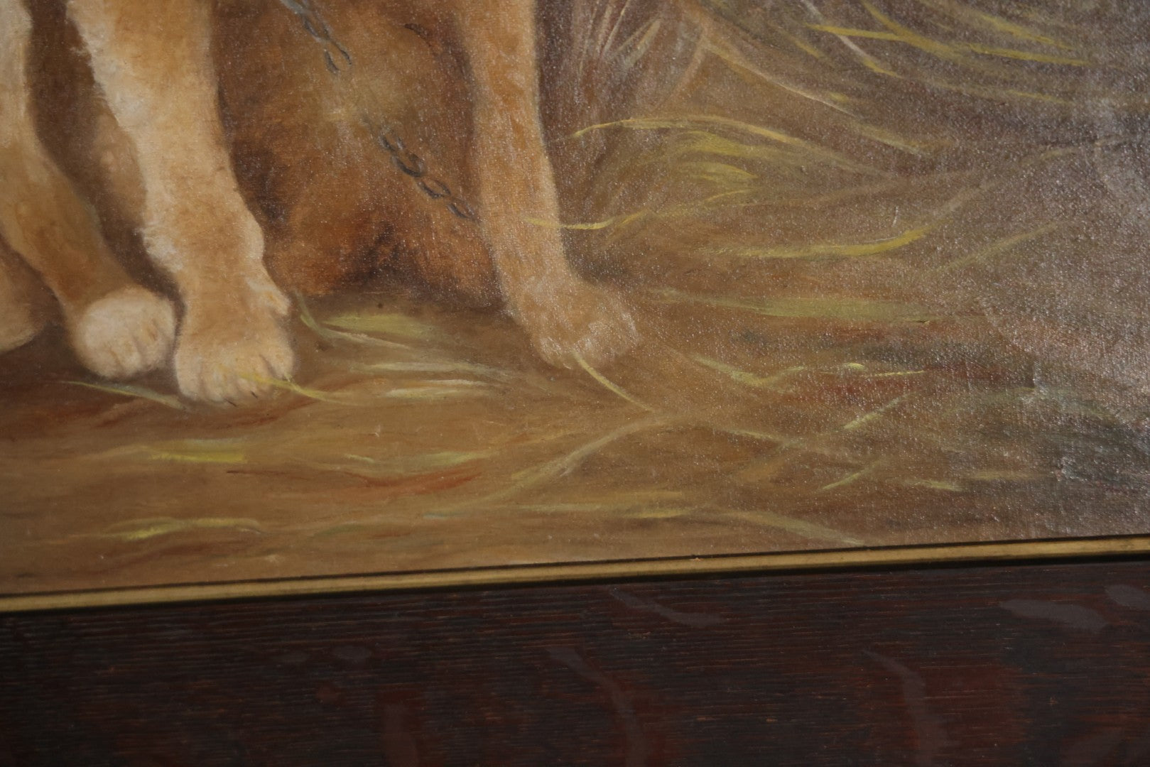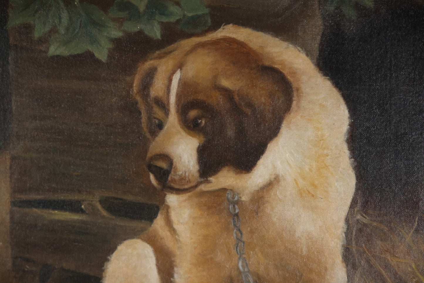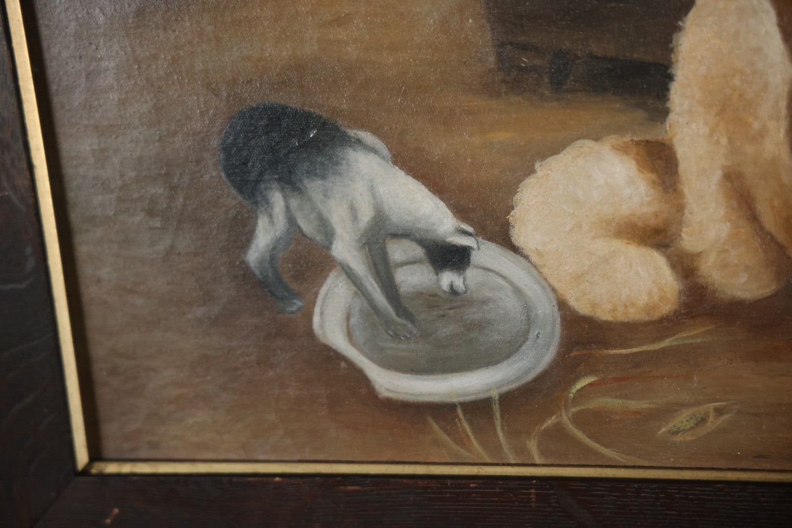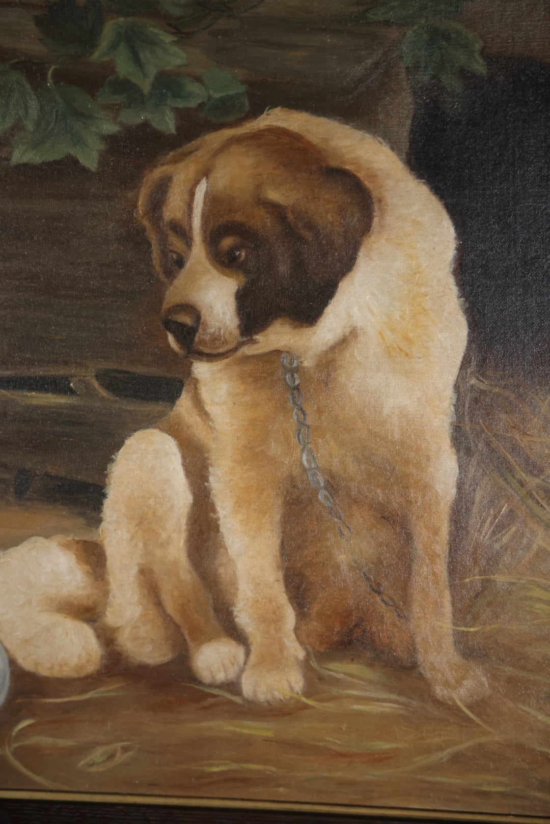 Antique Oil On Canvas Painting Of A Large Saint Bernard Dog Sharing A Saucer Of Water With A Small Gray Cat, On A Farm, Horses In Background, In Frame, 28" x 30"